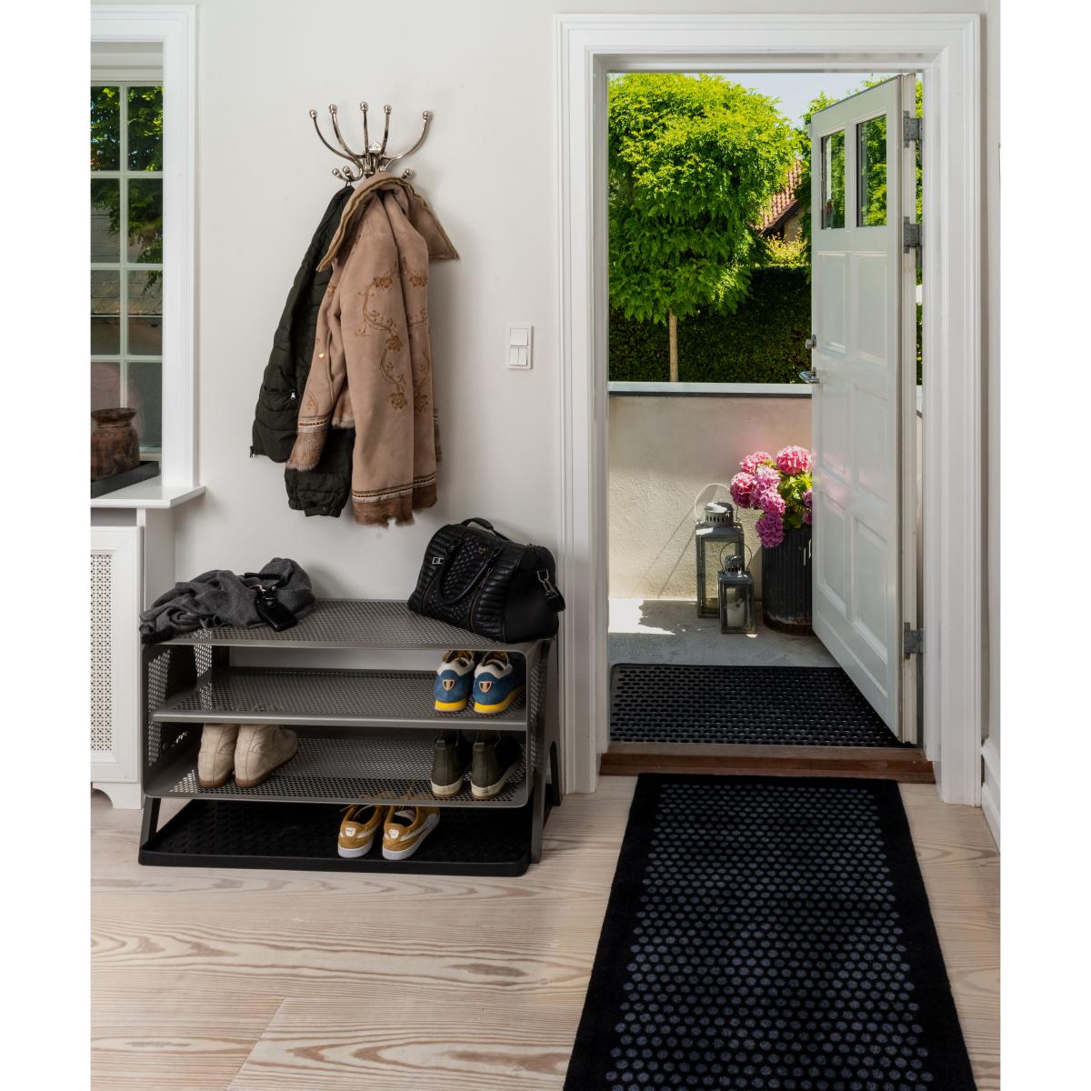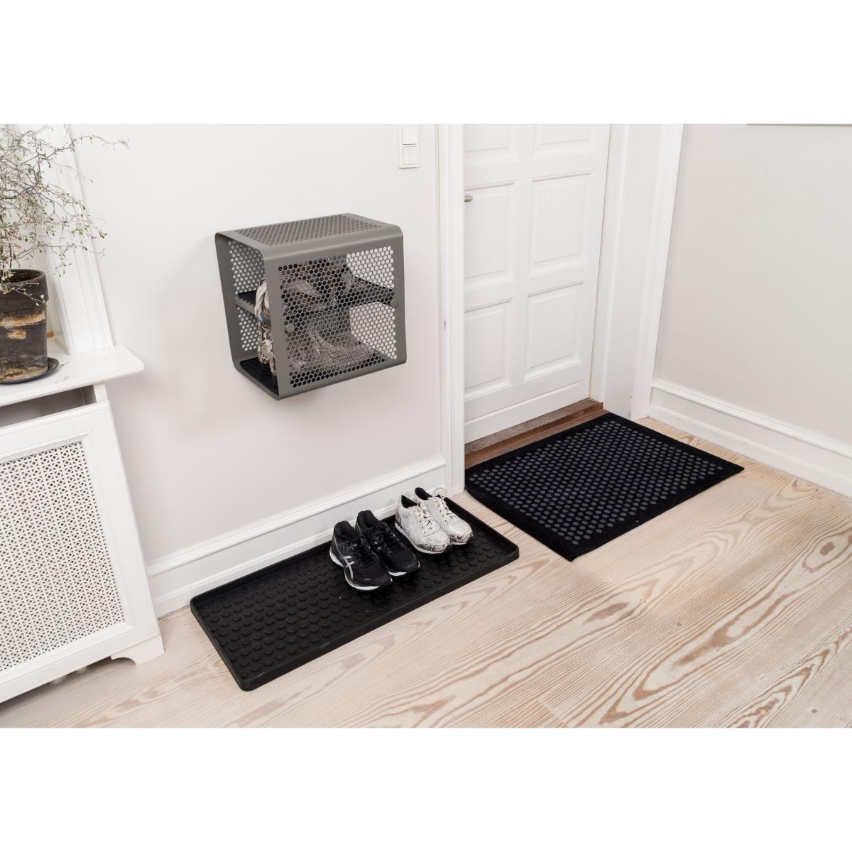 I regularly recommend this Dot shoe tray for its clean, Scandi look and practical build. The subtle dot texture adds interest without dominating a hallway or mudroom, and the low-profile edge keeps dirt and water contained - ideal for busy family homes or minimalist flats. Its black finish pairs well with light wood benches, monochrome tiling or industrial-style metal hooks. For styling, position it under a slim console or storage bench and group shoes by type or colour to keep the area feeling orderly. Add a woven basket on one end for umbrellas or dog leads, and place a simple runner rug in front to soften the transition from tray to floor. Regularly shake out or hose down the tray for a fresh, uncluttered entrance.