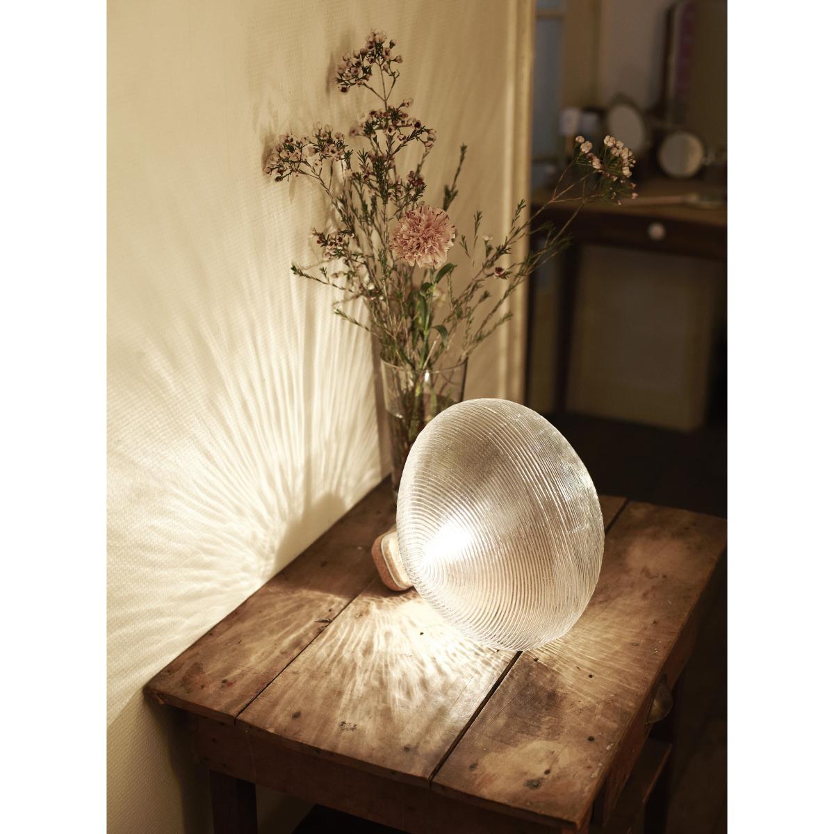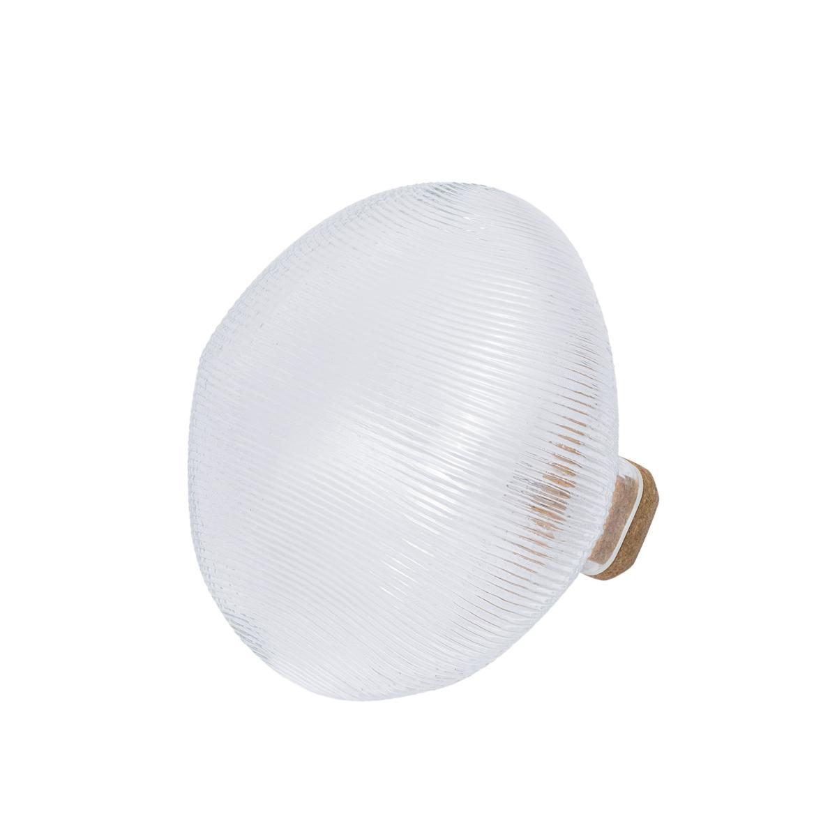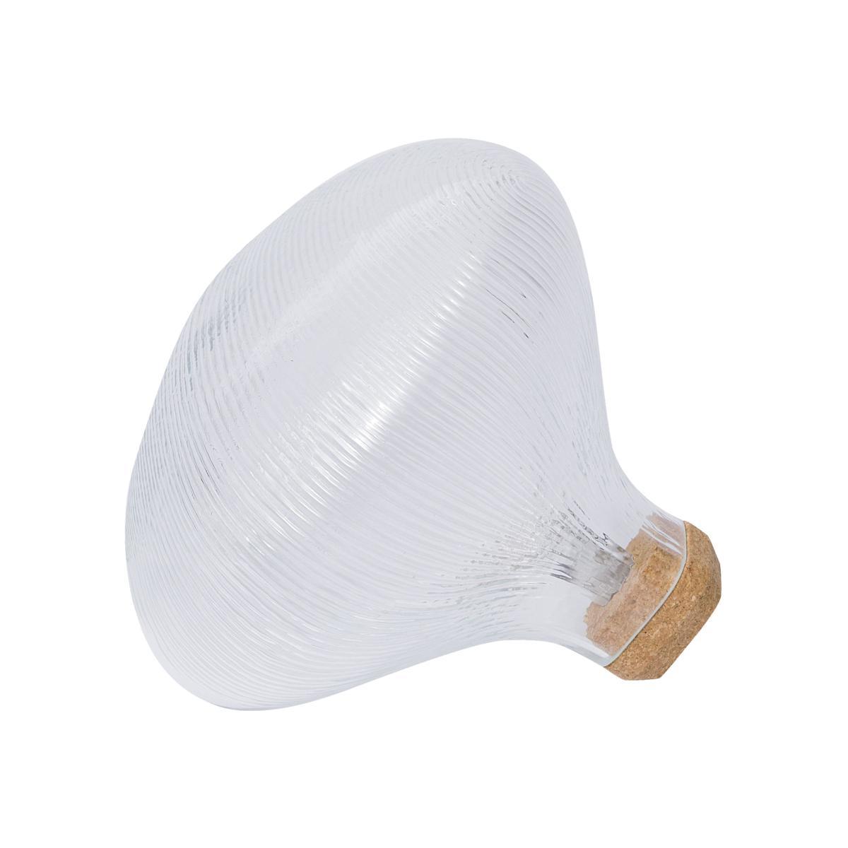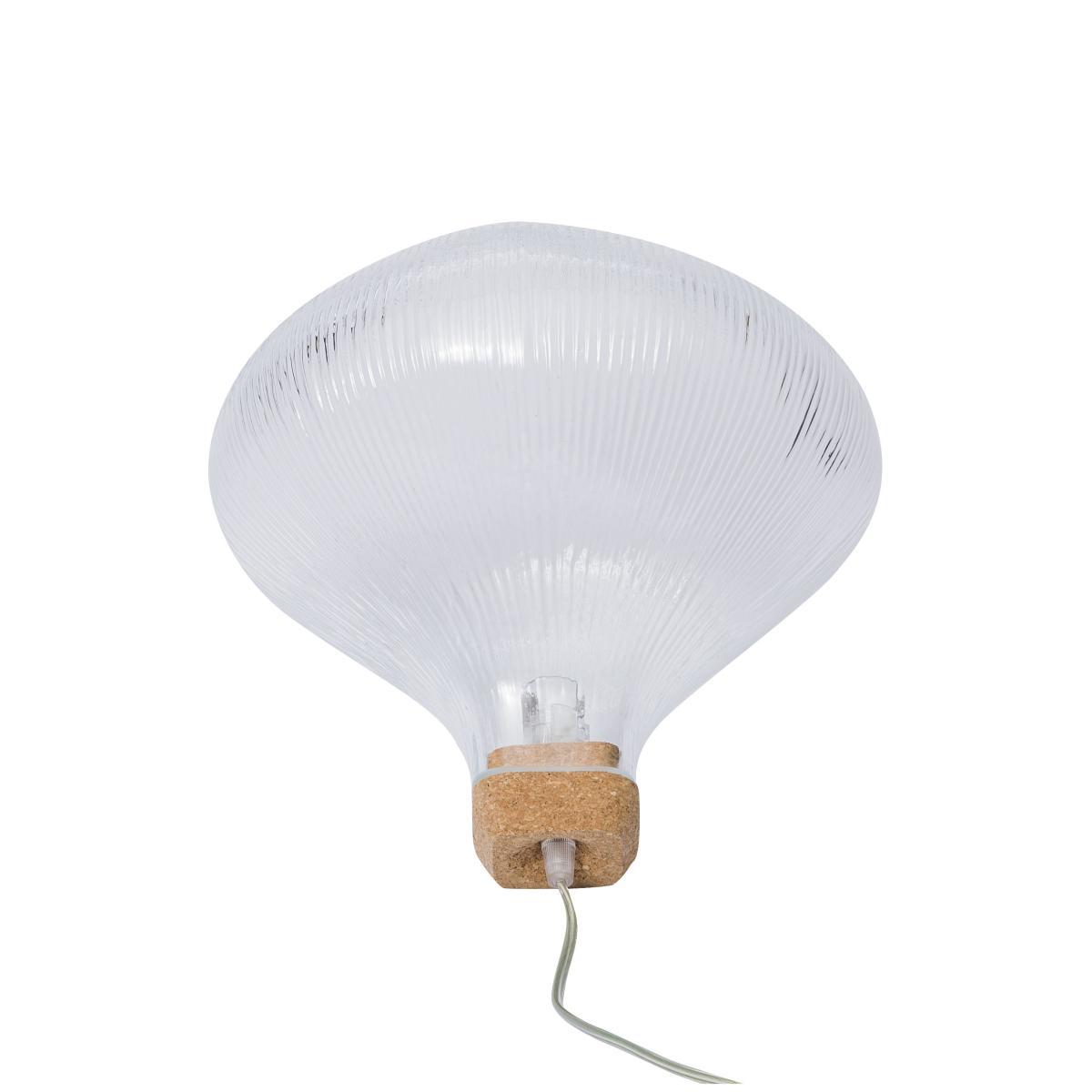 This table lamp plays with diffraction, with a design that draws its inspiration from the techniques and codes used in the car industry. By its texture and shape, Tidelight increases diffusion. This lamp provides a diffused light. Transparent blown glass diffuser with a striped surface. Cork base. Transparent power cord, with a transparent on/off switch.