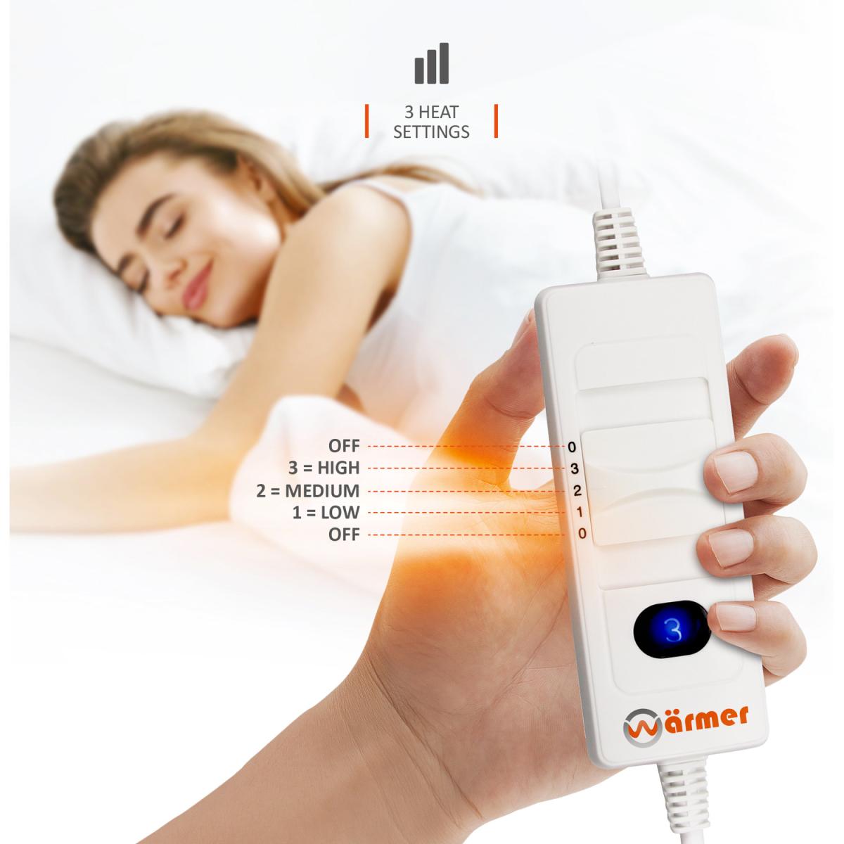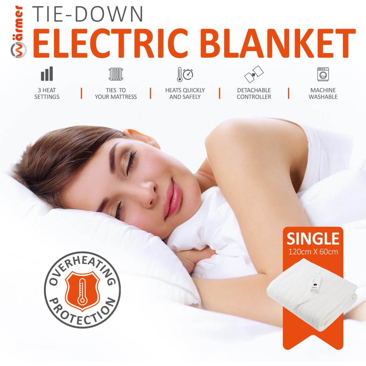 This WARMER Tie-Down Heated Single Blanket is the perfect way to keep cosy when the evenings get chillier. This blanket has a controller with three heating settings which can be detached to make the throw machine washable. This blanket has a controller and three different heat settings which allows you to find your perfect temperature with ease. This blanket runs off 35W of power meaning you could run it on the highest heat setting for 3 hours and it would cost you 3p a day. This means you can stay warm and cosy this winter without having to worry about a huge increase in your energy bills. This heated blanket has a built-in overheat and overcurrent protection system that will be enabled from the first time you plug this product in. This will automatically shut the blanket off if it overheats meaning you can relax whilst using it. The controller is detachable which allows you to wash this blanket at low temperatures.
