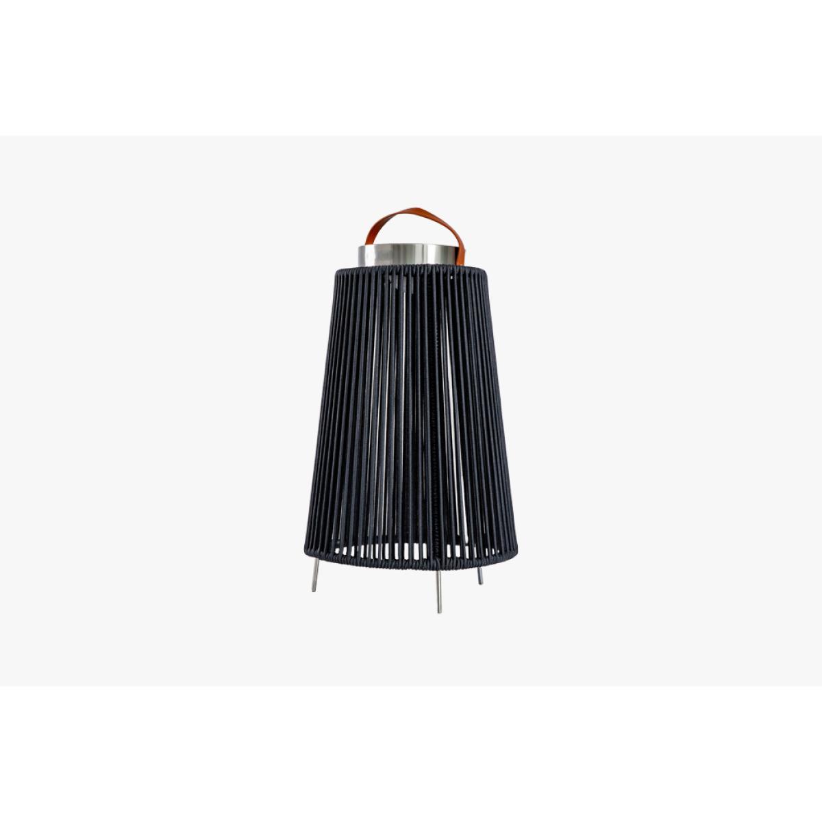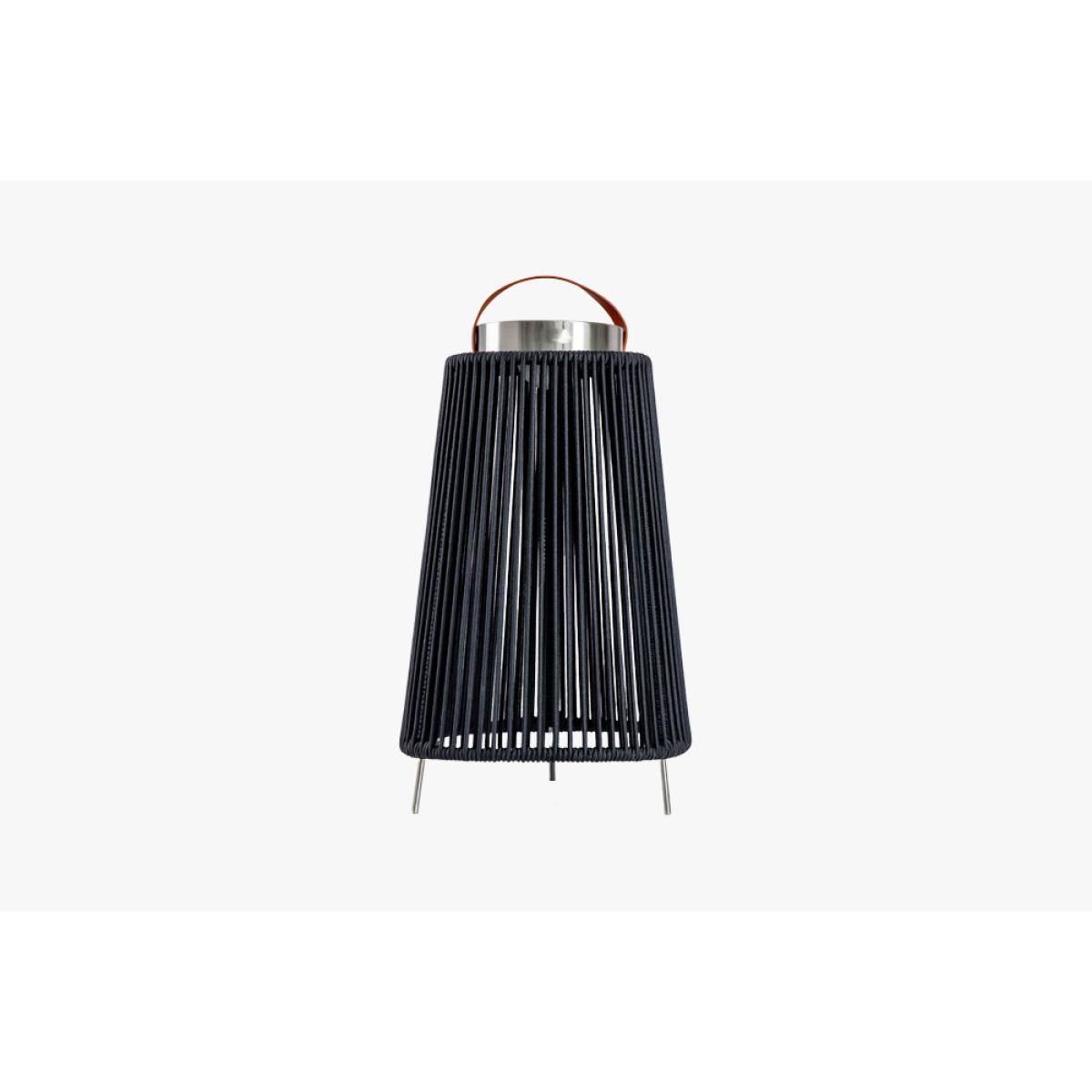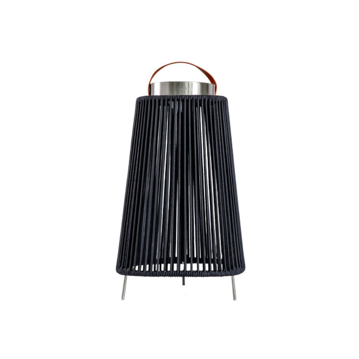 Perfect for adding a contemporary glow to your outside space, the Tied Up lamp combines black woven rope detail, faux leather, and brushed aluminium. With an inbuilt solar panel, the lamp will glow for up to 5 hrs on high, 8 hrs on medium, and 12 hrs on low. Get up to 60 hours light with USB charging (charger not included)