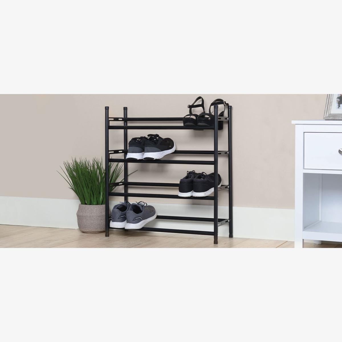 Make sure your shoes are kept neatly organised with this Tiered Adjustable Shoe Rack. Ideal for the landing, hallway, or bedroom, this tiered rack features plenty of space for your favourite pairs of shoes, and is adjustable too for your convenience, helping you to fit it into almost any gap around your home. Made with a contemporary design and finished with black for a sleek look, it's sure to make a welcome addition in any style of home.