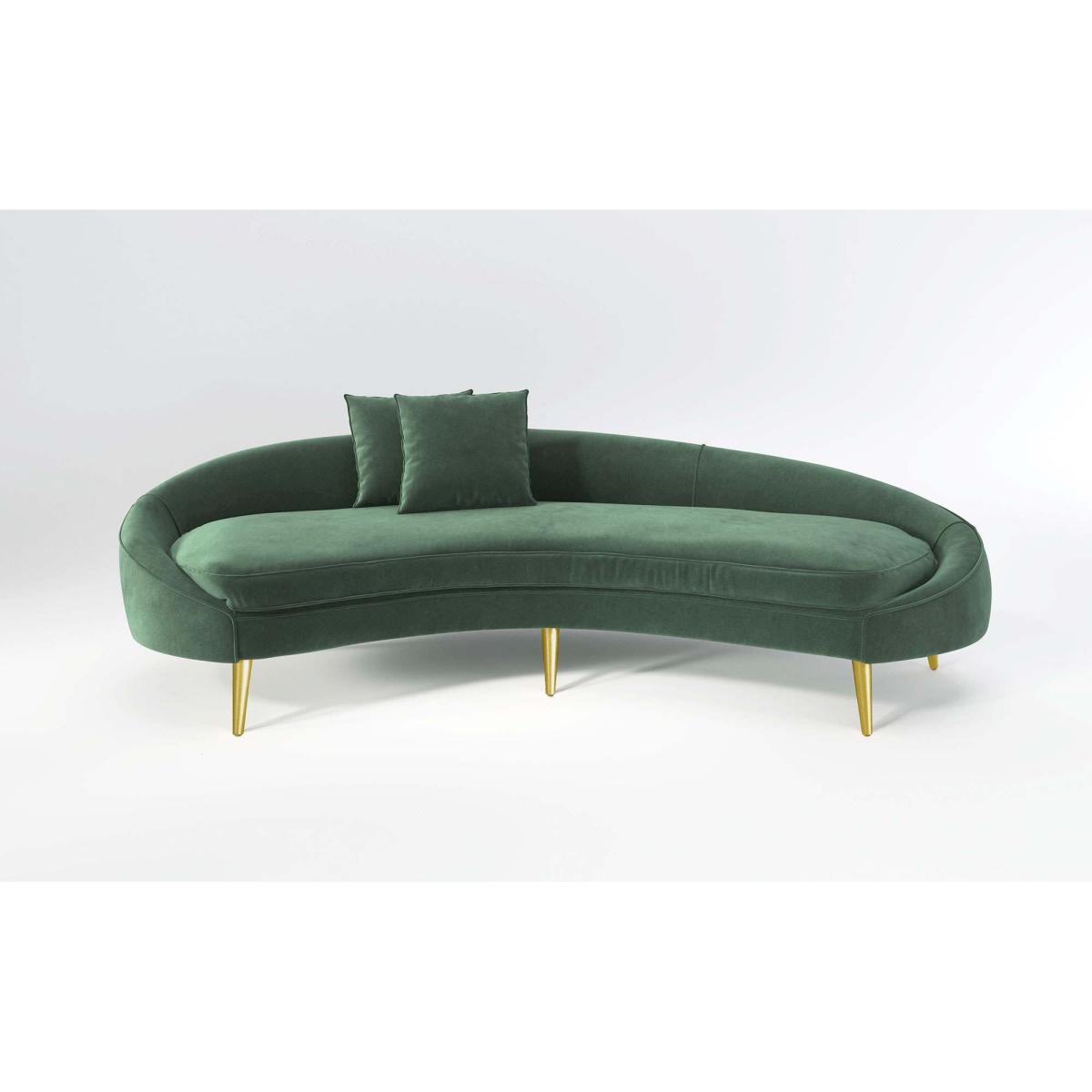 Seating does not get more luxurious than our Tiffany curved sofa. Promising to take centre stage in any interior space, this dramatic sweeping sofa has a vintage appeal, reminiscent of elegant 1940’s Italian design. Handcrafted in London, the Tiffany sits upon brushed gold tapered legs and includes two feather filled scatter cushions. Available in a range of sumptuous fabrics, you can tailor your Tiffany sofa to perfectly complement your room. Pictured: right hand facing sofa in Chalk Bouclé and Blue Savoy Stain Guarded Velvet. Handmade in 8-12 weeks and then delivered usually within 10 working days.