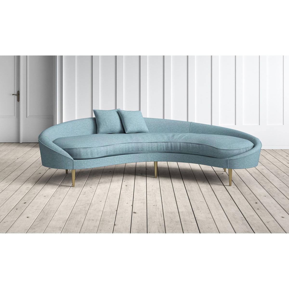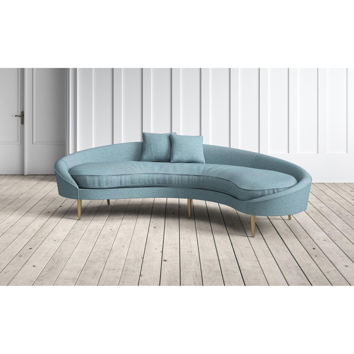 Seating does not get more luxurious than our Tiffany curved sofa. Promising to take centre stage in any interior space, this dramatic sweeping sofa has a vintage appeal, reminiscent of elegant 1940’s Italian design. Handcrafted in London, the Tiffany sits upon brushed gold tapered legs and includes two feather filled scatter cushions. Available in a range of sumptuous fabrics, you can tailor your Tiffany sofa to perfectly complement your room. Pictured: right hand facing sofa in Chalk Bouclé and Blue Savoy Stain Guarded Velvet. Handmade in 8-12 weeks and then delivered usually within 10 working days.