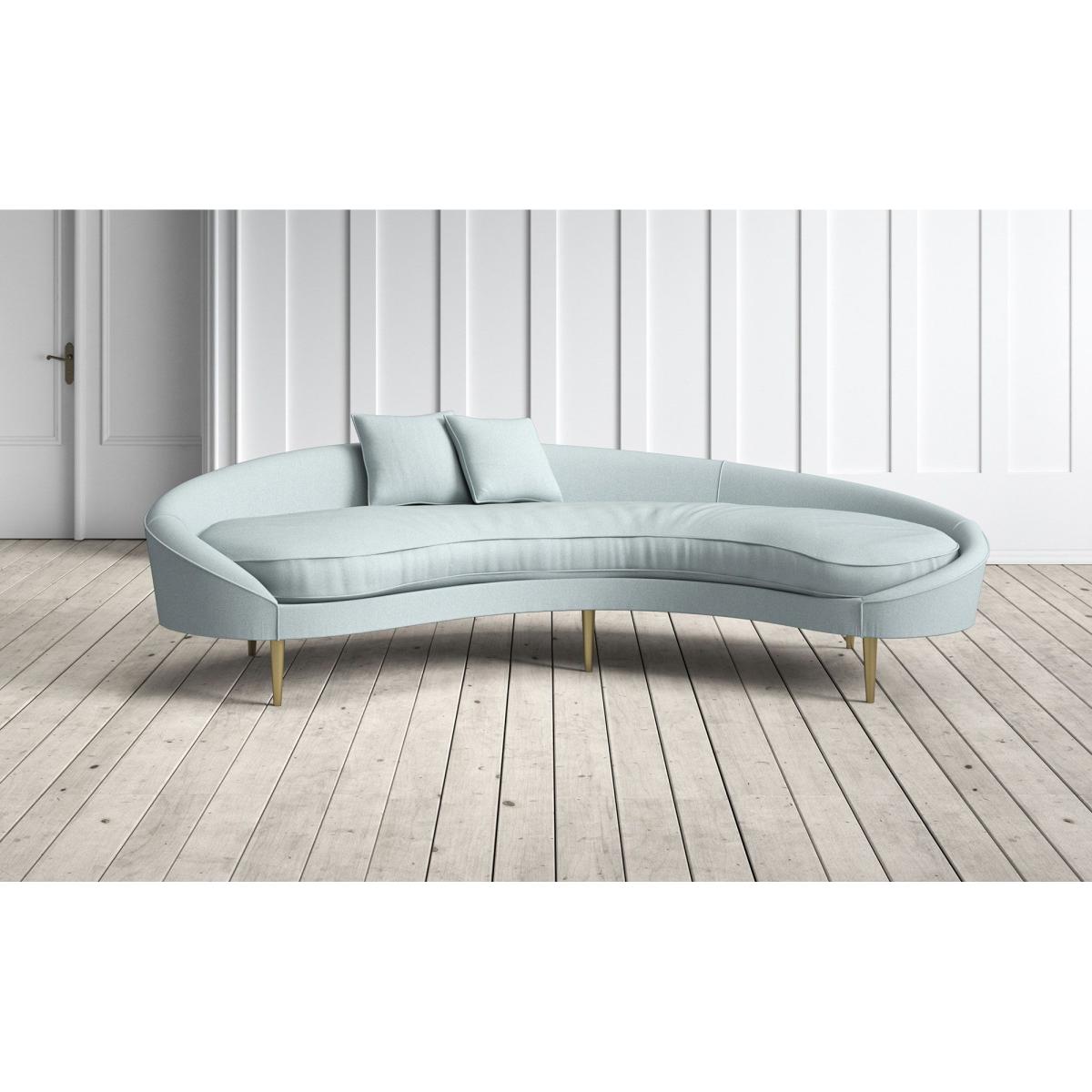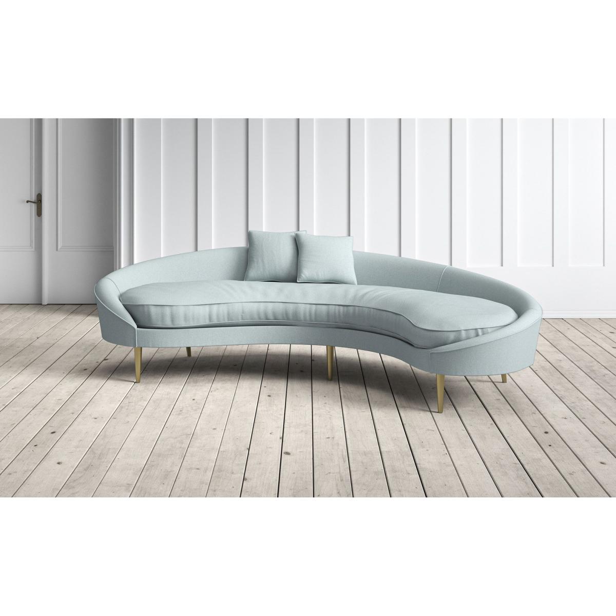 Seating does not get more luxurious than our Tiffany curved sofa. Promising to take centre stage in any interior space, this dramatic sweeping sofa has a vintage appeal, reminiscent of elegant 1940’s Italian design. Handcrafted in London, the Tiffany sits upon brushed gold tapered legs and includes two feather filled scatter cushions. Available in a range of sumptuous fabrics, you can tailor your Tiffany sofa to perfectly complement your room. Pictured: right hand facing sofa in Chalk Bouclé and Blue Savoy Stain Guarded Velvet. Handmade in 8-12 weeks and then delivered usually within 10 working days.
