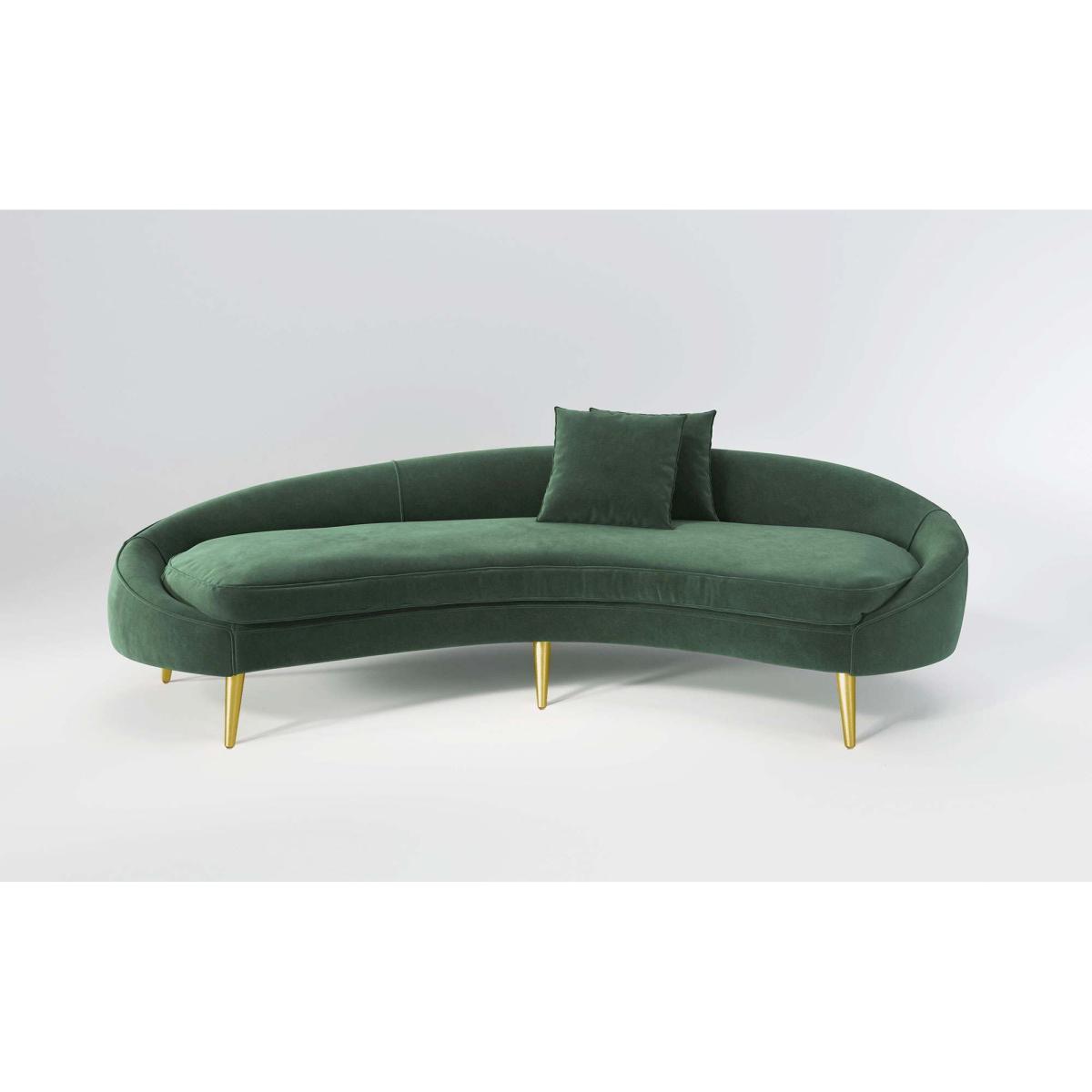 Seating does not get more luxurious than our Tiffany curved sofa. Promising to take centre stage in any interior space, this dramatic sweeping sofa has a vintage appeal, reminiscent of elegant 1940’s Italian design. Handcrafted in London, the Tiffany sits upon brushed gold tapered legs and includes two feather filled scatter cushions. Available in a range of sumptuous fabrics, you can tailor your Tiffany sofa to perfectly complement your room. Pictured: right hand facing sofa in Chalk Bouclé and Blue Savoy Stain Guarded Velvet. Handmade in 8-12 weeks and then delivered usually within 10 working days.