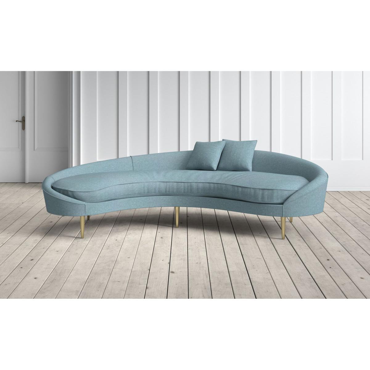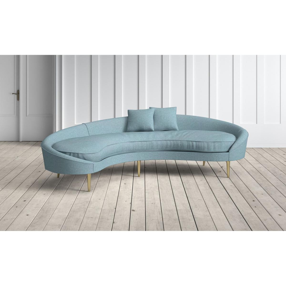 Seating does not get more luxurious than our Tiffany curved sofa. Promising to take centre stage in any interior space, this dramatic sweeping sofa has a vintage appeal, reminiscent of elegant 1940’s Italian design. Handcrafted in London, the Tiffany sits upon brushed gold tapered legs and includes two feather filled scatter cushions. Available in a range of sumptuous fabrics, you can tailor your Tiffany sofa to perfectly complement your room. Pictured: right hand facing sofa in Chalk Bouclé and Blue Savoy Stain Guarded Velvet. Handmade in 8-12 weeks and then delivered usually within 10 working days.