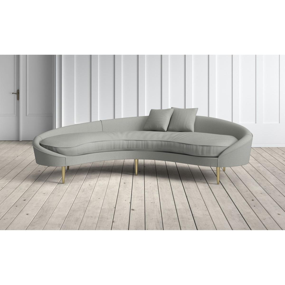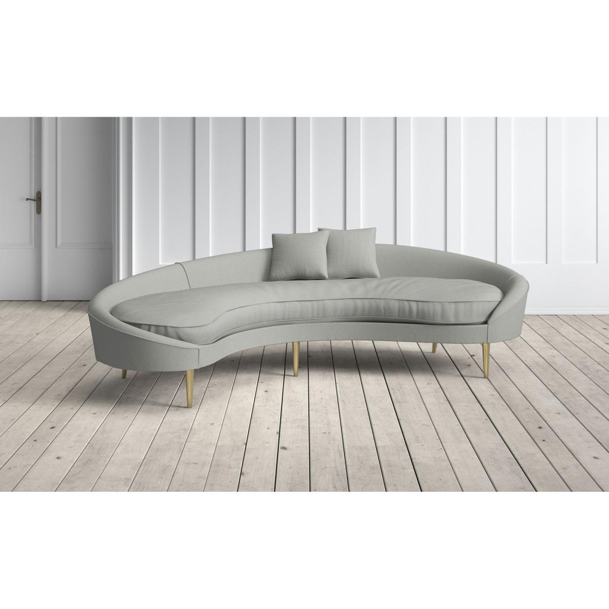Seating does not get more luxurious than our Tiffany curved sofa. Promising to take centre stage in any interior space, this dramatic sweeping sofa has a vintage appeal, reminiscent of elegant 1940’s Italian design. Handcrafted in London, the Tiffany sits upon brushed gold tapered legs and includes two feather filled scatter cushions. Available in a range of sumptuous fabrics, you can tailor your Tiffany sofa to perfectly complement your room. Pictured: right hand facing sofa in Chalk Bouclé and Blue Savoy Stain Guarded Velvet. Handmade in 8-12 weeks and then delivered usually within 10 working days.