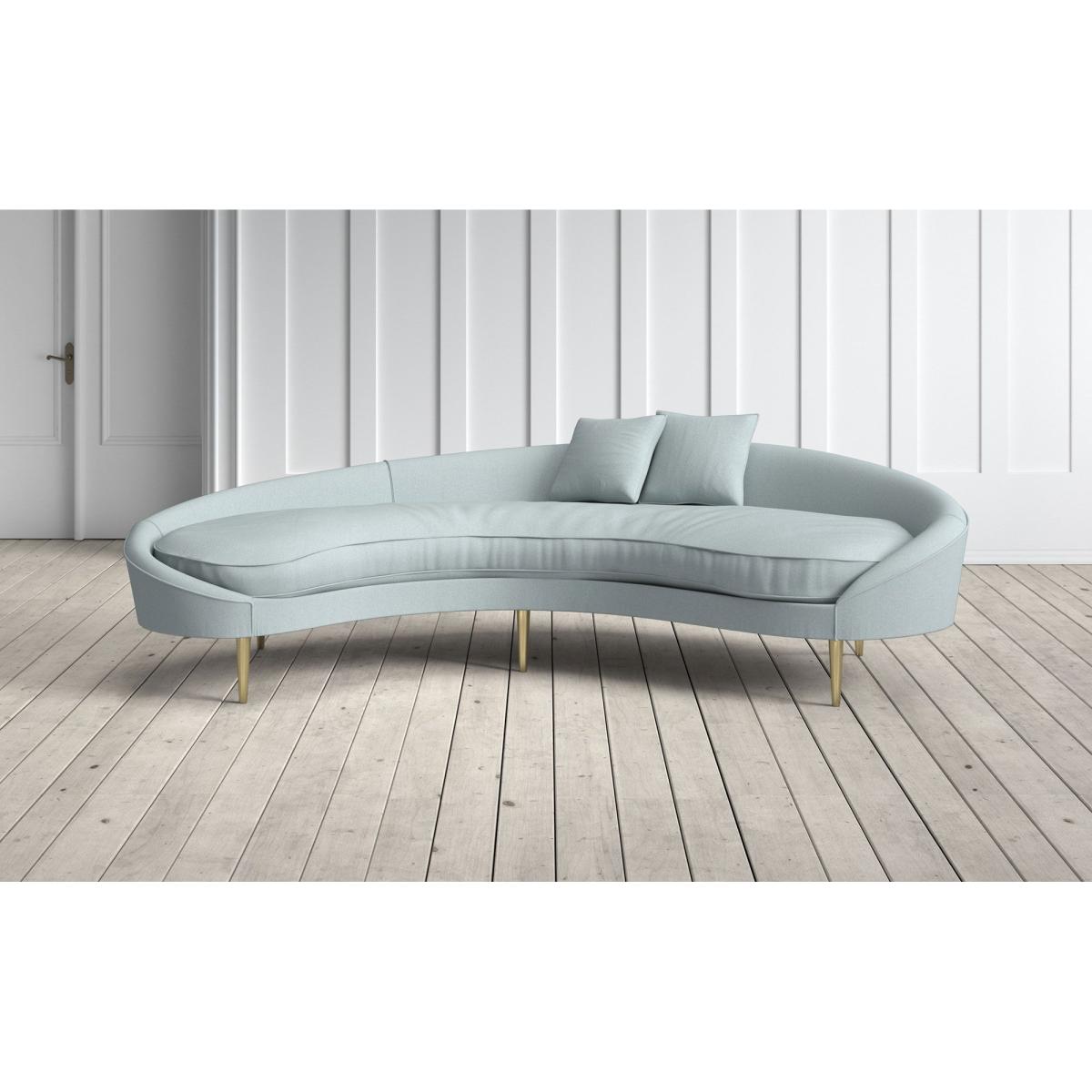 Seating does not get more luxurious than our Tiffany curved sofa. Promising to take centre stage in any interior space, this dramatic sweeping sofa has a vintage appeal, reminiscent of elegant 1940’s Italian design. Handcrafted in London, the Tiffany sits upon brushed gold tapered legs and includes two feather filled scatter cushions. Available in a range of sumptuous fabrics, you can tailor your Tiffany sofa to perfectly complement your room. Pictured: right hand facing sofa in Chalk Bouclé and Blue Savoy Stain Guarded Velvet. Handmade in 8-12 weeks and then delivered usually within 10 working days.