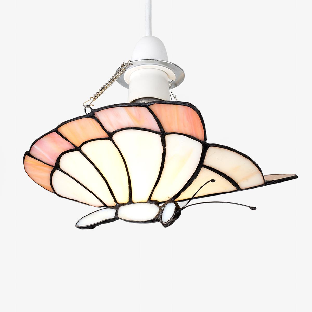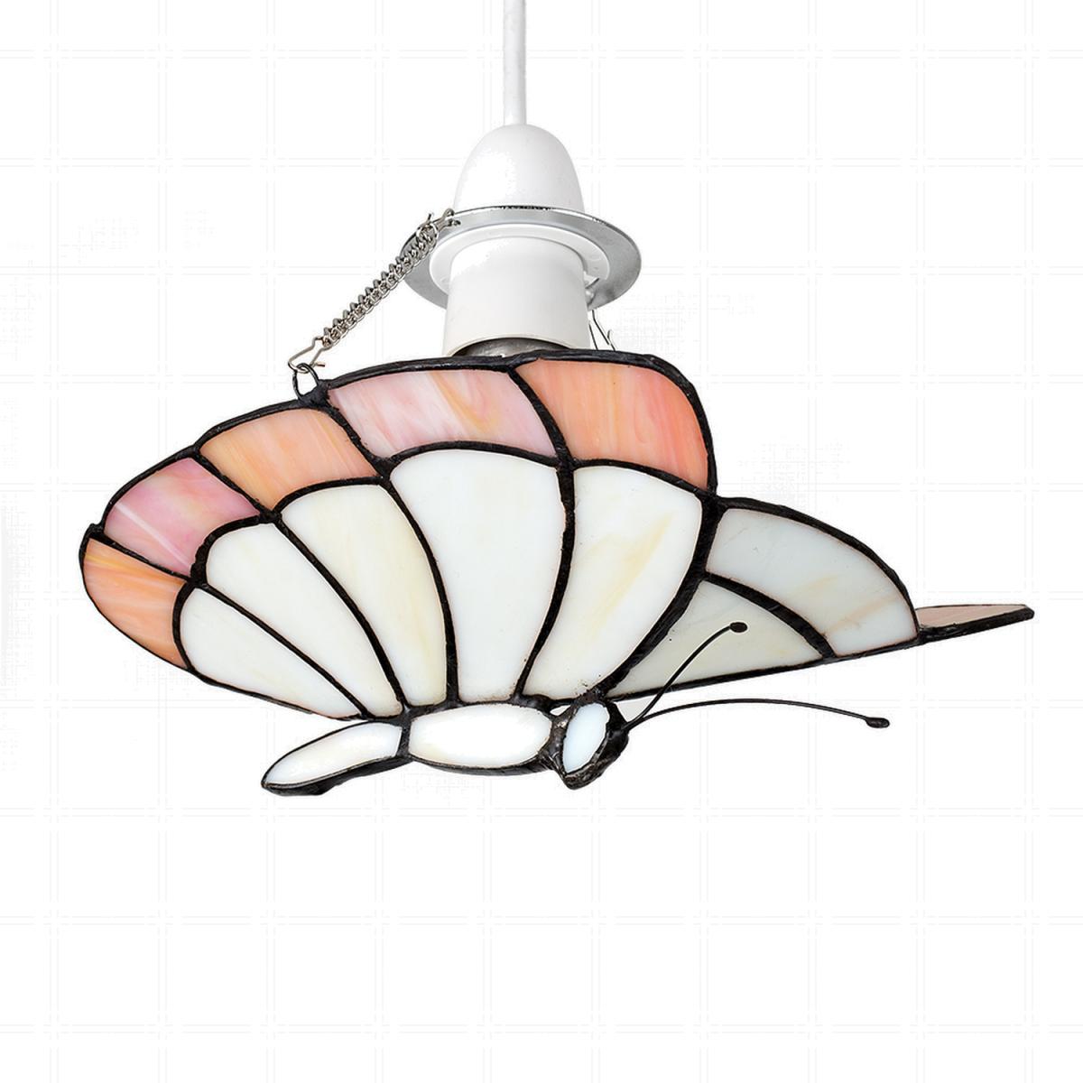 Tiffany style suspended butterfly ceiling pendant light shade in a white and peach stained glass finish. Features an open design which shades the bulb whilst allowing light to disperse effectively and evenly throughout the room. Also looks great even when the light is switched off! Ideal for use in living rooms, dining rooms, hallways, bedrooms and more. Ceiling lights are usually the main source of illuminating a room but with the many styles on offer today, also become a main focal point or talking point. The right fitting can make a real style statement and complete your living space look.