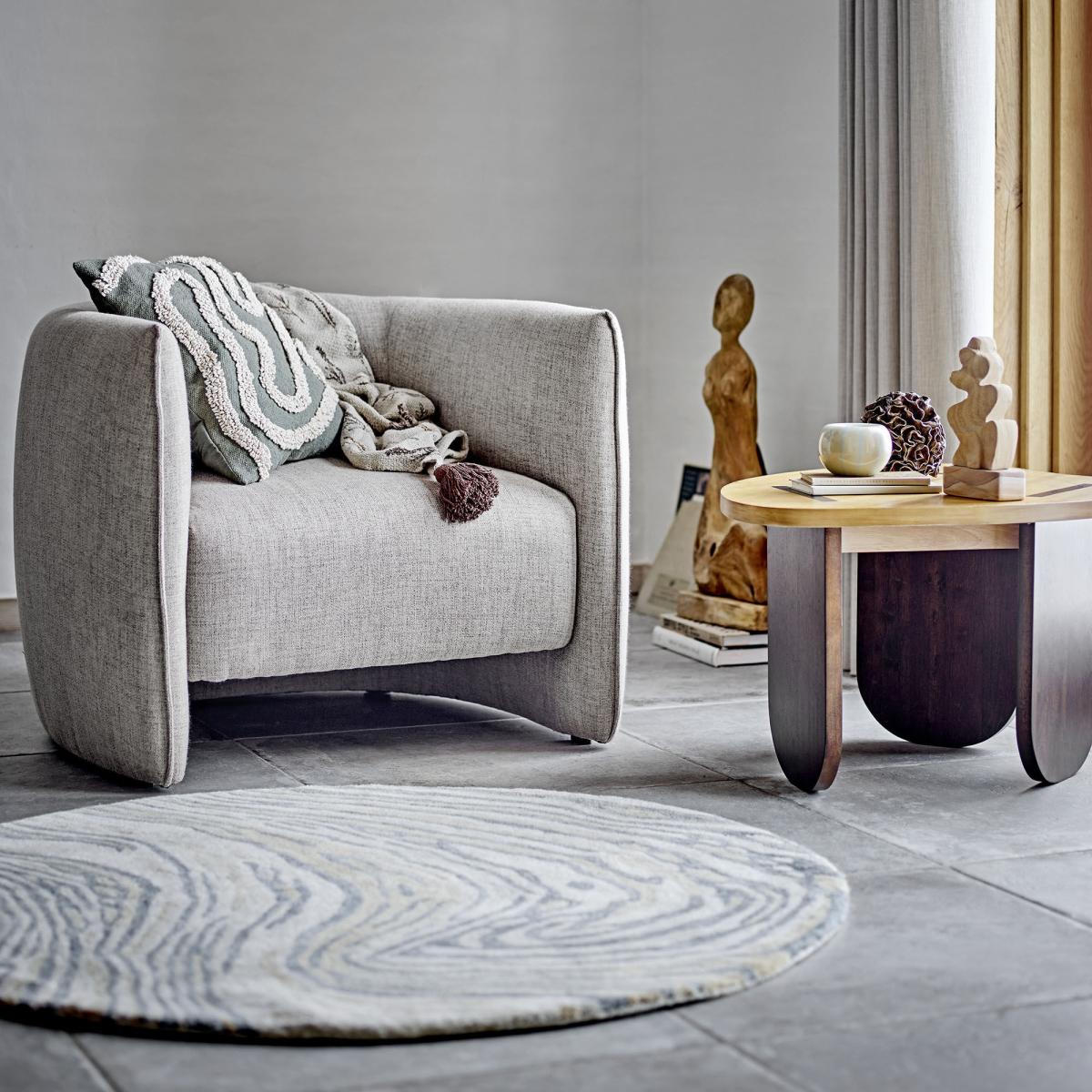 The Tiger Rug will add warmth and comfort to any floor. This round Rug is made from Tufted wool. It features a beautiful pattern with organic stripes in shades of Brown and Blue.