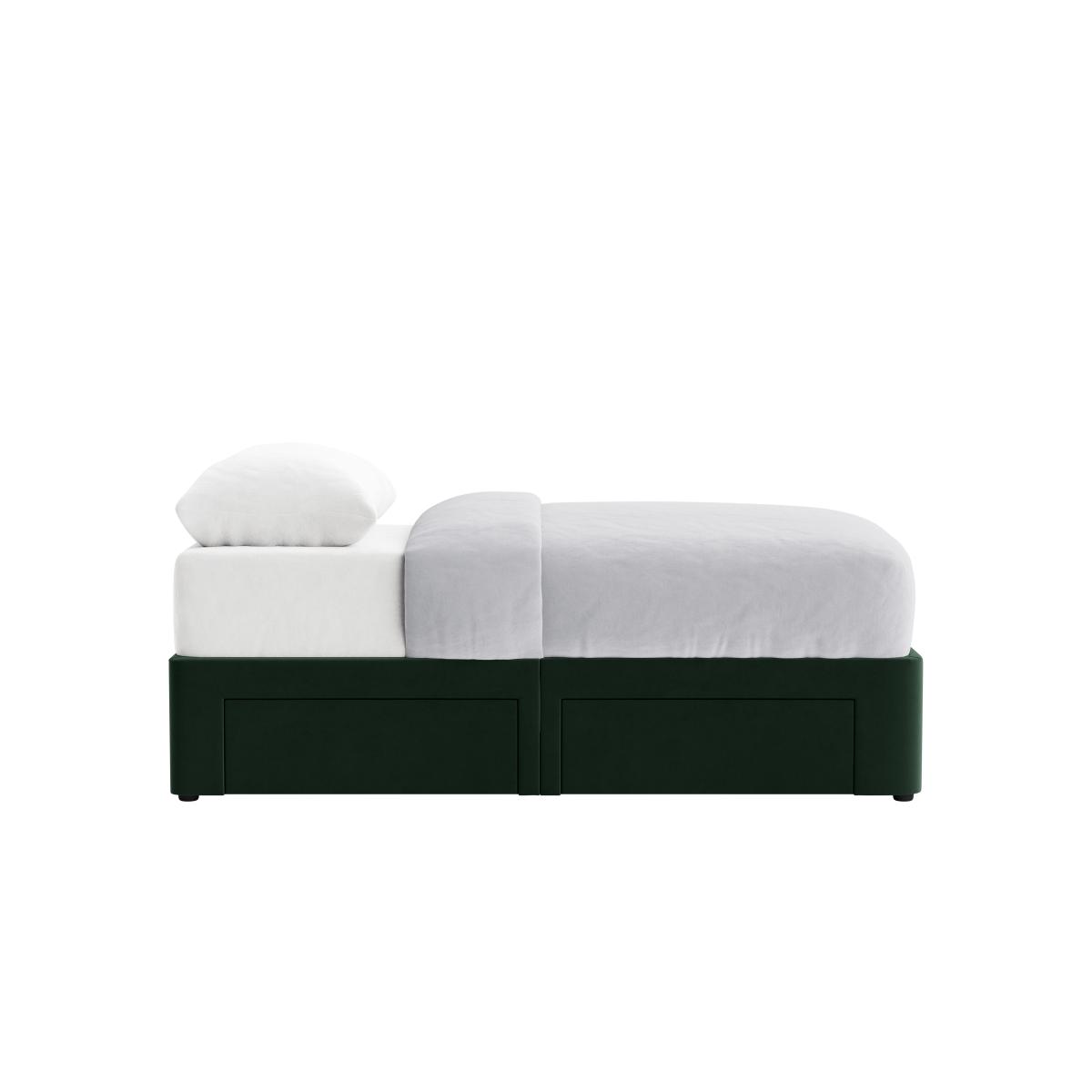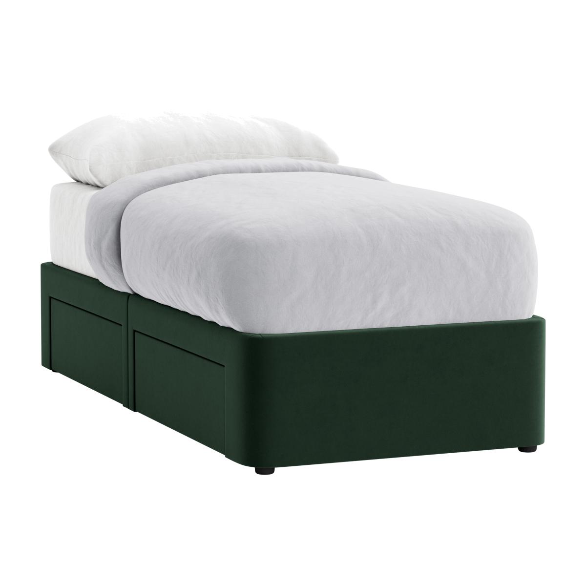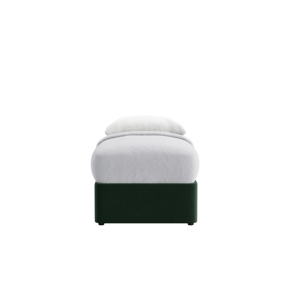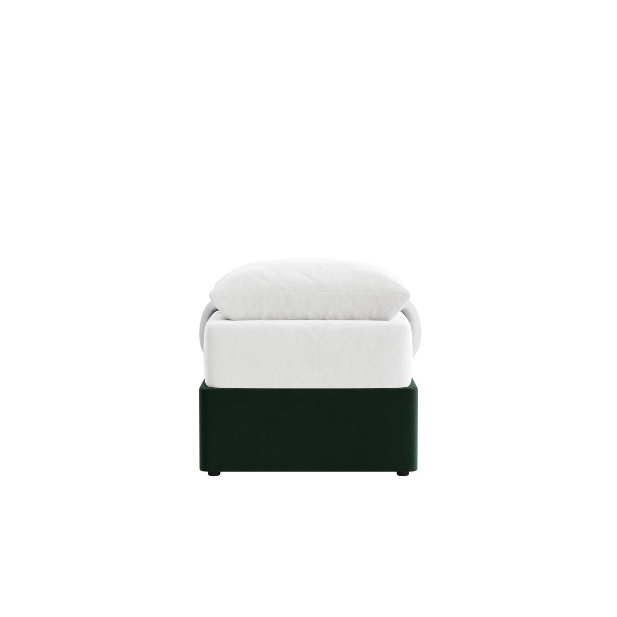 I love this storage bed for its practical yet sleek design, making it a perfect solution for compact spaces or those seeking a clutter-free bedroom. Its clean lines and deep green base add a touch of modern sophistication, working well in contemporary, Scandinavian, or eclectic interiors. To style around it, consider layering with textured bedding and a few decorative cushions to soften the look, or keep it minimal for a more streamlined vibe. An ottoman-style bed like this is also great for creating hidden storage, so a tidy bed niche with easy access to essentials can help maximise small rooms without sacrificing style.