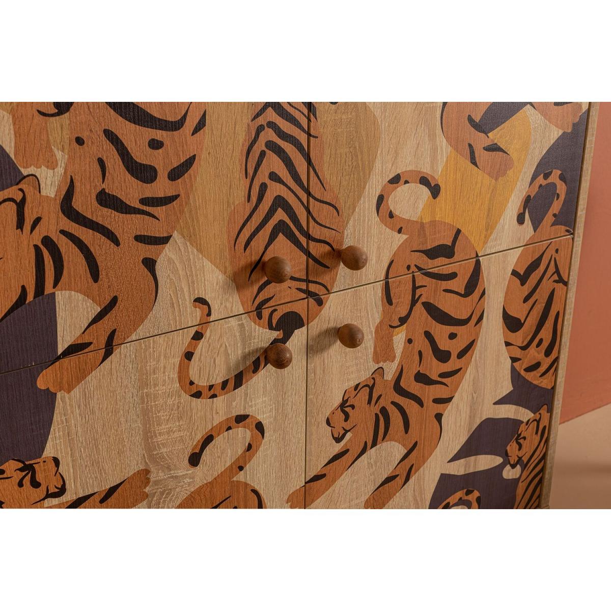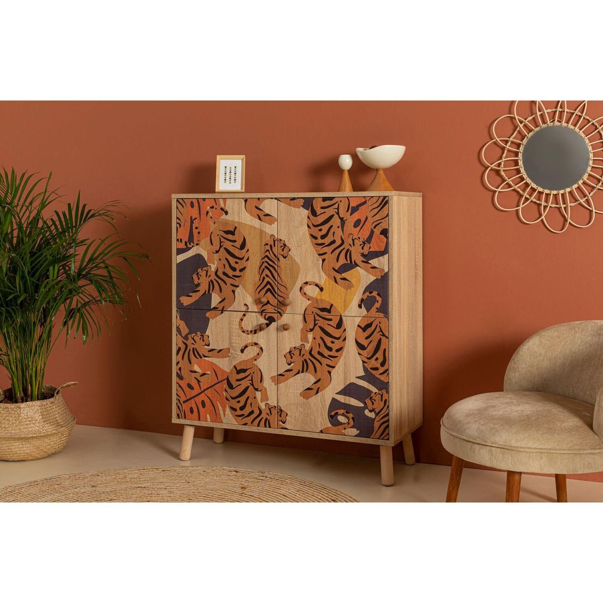 This sideboard is a fantastic versatile piece that works well in both contemporary and rustic interiors, thanks to its solid wood construction and natural Atlantic pine finish. I love its sturdy wooden legs which add a touch of craftsmanship and lift it off the ground to create a feeling of space. It’s ideal for adding storage in living rooms, dining areas, or even bedrooms, while its natural finish lends itself nicely to pairing with bold or patterned decor, as seen with the tiger print on the front. Practical styling tips include using it as a display surface for art, plants, or decorative trays, while keeping clutter hidden in the interior cabinets. Its straightforward design offers both function and a warm, natural aesthetic that complements a variety of colour schemes.