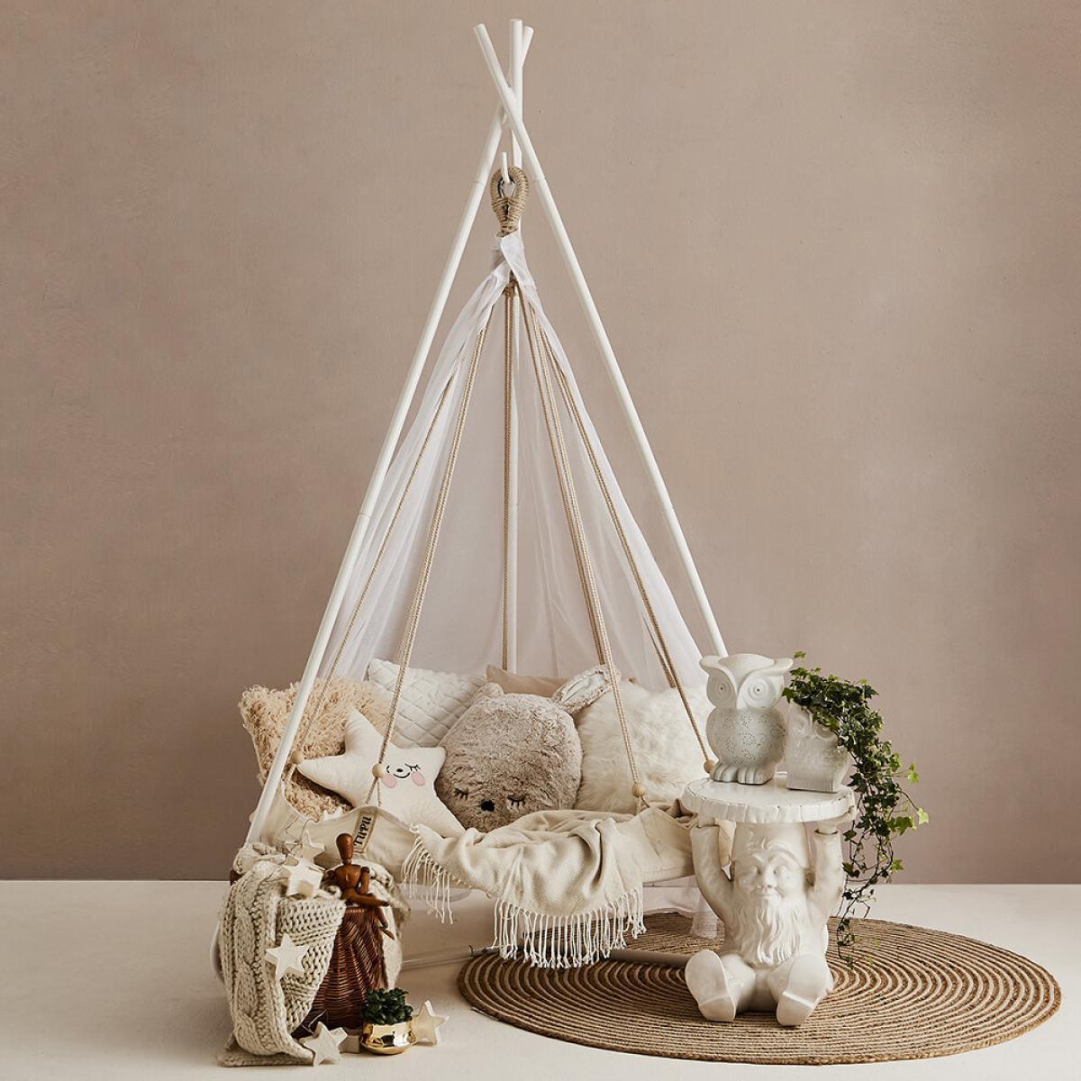 Transform your garden and enhance your little one’s play space with this Kids Tiipii bed. Crafted from a weather resistant polycotton canvas, it is finished in a white colour with a coordinated net. Perfect for both indoor and outdoor use, pair with a stand or simply suspend from a sturdy surface such as a ceiling, beam, or tree. Stand. And. Cover. Available separately.