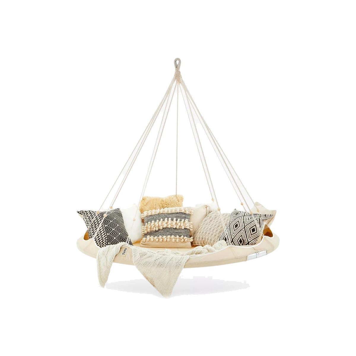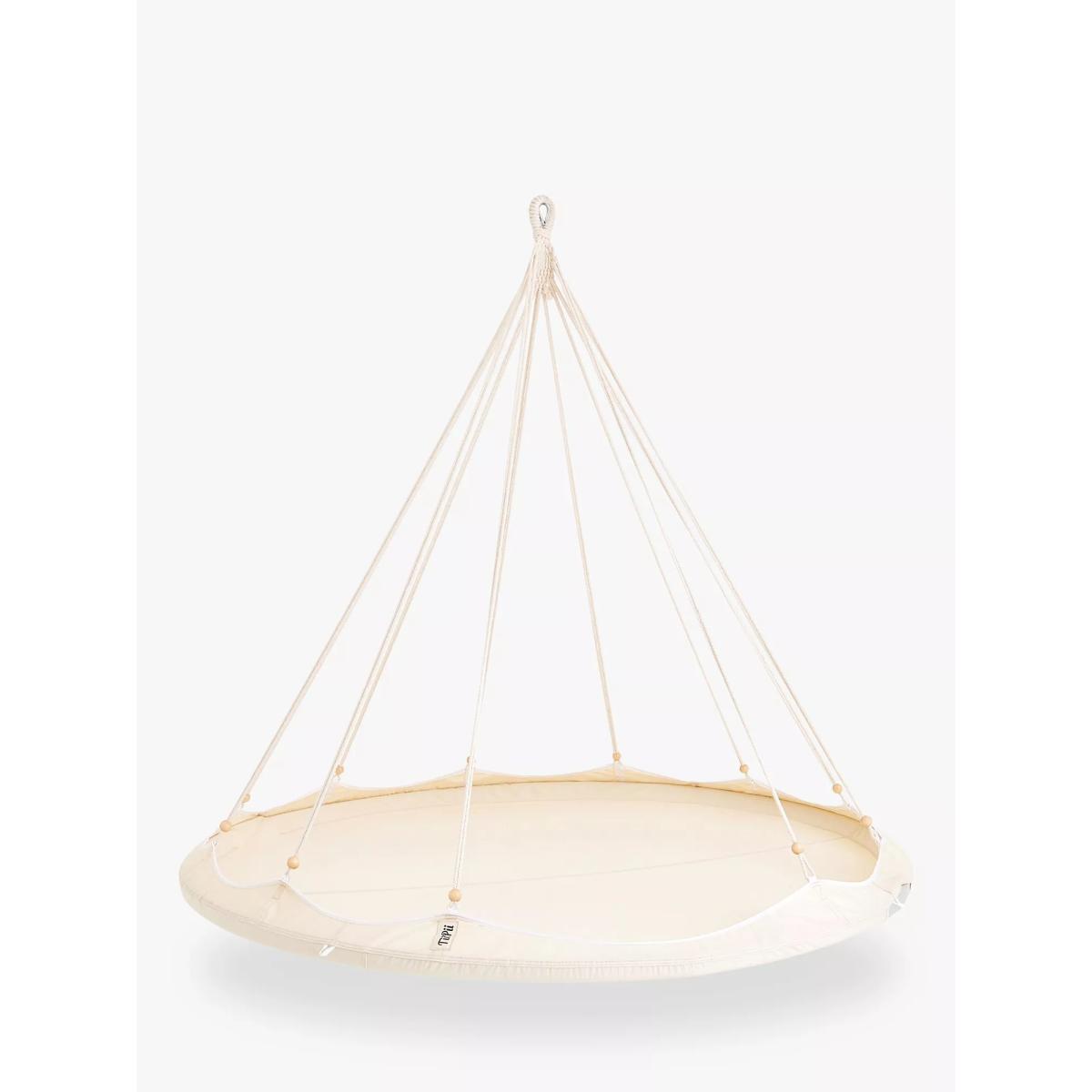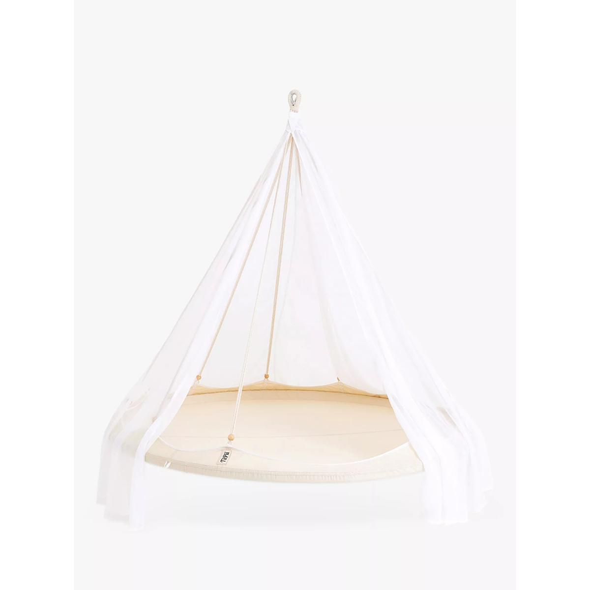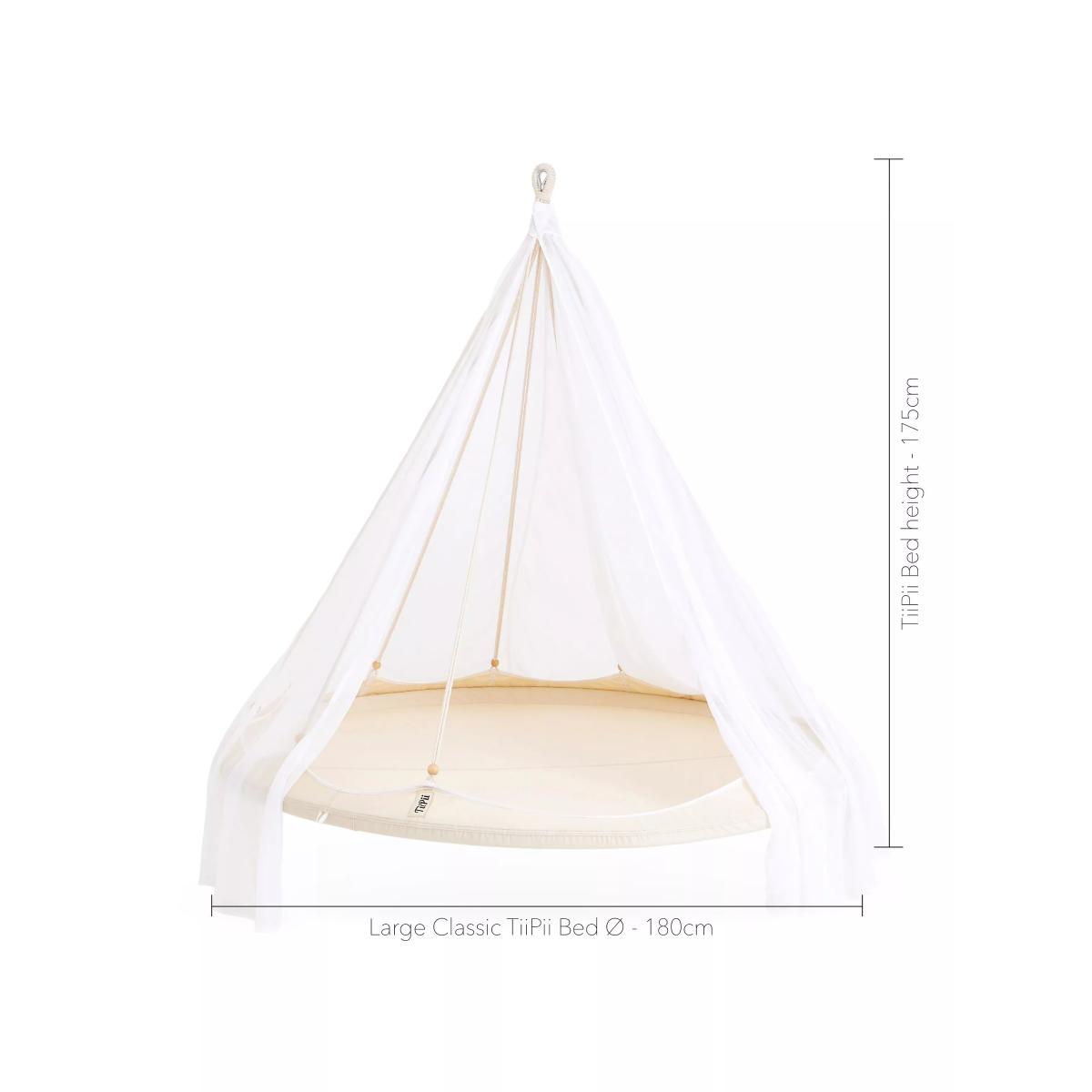 Read, play, snuggle, inspire, sleep, relax, explore your new Tii Pii space. It's up to you. The Large Classic Tii Pii Bed comfortably supports three to four adults and is the ultimate floating daybed to entertain the whole family and relax, indoors or for seasonal periodic use in the garden. Use as an indoor daybed, outdoor porch swing, hanging garden chair, floating bed or luxury hammock to camp, adventure and explore with. Designed with high-quality soft polycotton canvas and macramé finishing touches, this Tiipii has a cosy attachable white sheer net to cocoon or lightly shade. Suspend it from a safe beam or branch to save space or pair it with either the Classic or Deluxe Tii Pii Tripod Stand, sold separately. All elements compact down into a convenient transportable canvas storage bag, giving you the option to take the Tii Pii on holiday, to a festival or on the road to your next adventure. Key features: Suitable for indoor and light outdoor use Made with marine-grade polycotton canvas Anti-mould, anti-UV and water-resistant Supports up to 250kg Easily assembled in 10 minutes Includes sheer white ambient net Strong aluminium ring sections Machine washable Compacts down into a 70cm bag for storage and transportation Free-hang or suspend from a Tii Pii Stand (sold separately) Protect when outside with the Poncho Weather Cover (sold separately)