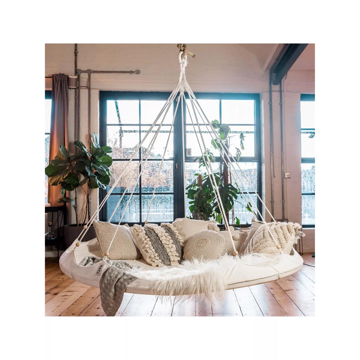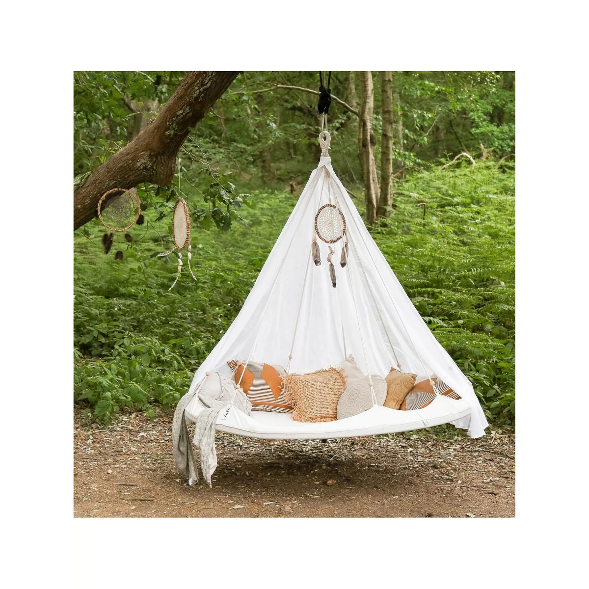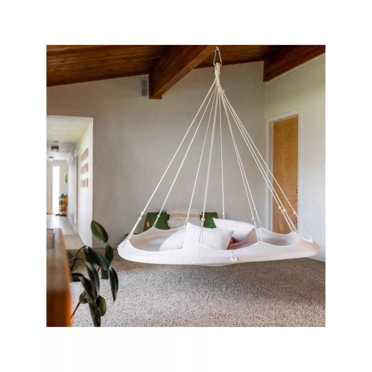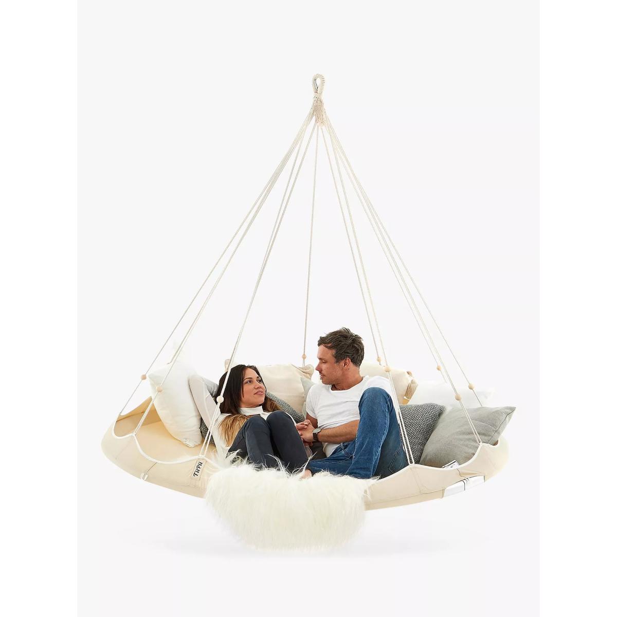 Read, play, snuggle, inspire, sleep, relax, explore your new Tii Pii space. It's up to you. The Large Classic Tii Pii Bed comfortably supports three to four adults and is the ultimate floating daybed to entertain the whole family and relax, indoors or for seasonal periodic use in the garden. Use as an indoor daybed, outdoor porch swing, hanging garden chair, floating bed or luxury hammock to camp, adventure and explore with. Designed with high-quality soft polycotton canvas and macramé finishing touches, this Tiipii has a cosy attachable white sheer net to cocoon or lightly shade. Suspend it from a safe beam or branch to save space or pair it with either the Classic or Deluxe Tii Pii Tripod Stand, sold separately. All elements compact down into a convenient transportable canvas storage bag, giving you the option to take the Tii Pii on holiday, to a festival or on the road to your next adventure. Key features: Suitable for indoor and light outdoor use Made with marine-grade polycotton canvas Anti-mould, anti-UV and water-resistant Supports up to 250kg Easily assembled in 10 minutes Includes sheer white ambient net Strong aluminium ring sections Machine washable Compacts down into a 70cm bag for storage and transportation Free-hang or suspend from a Tii Pii Stand (sold separately) Protect when outside with the Poncho Weather Cover (sold separately)