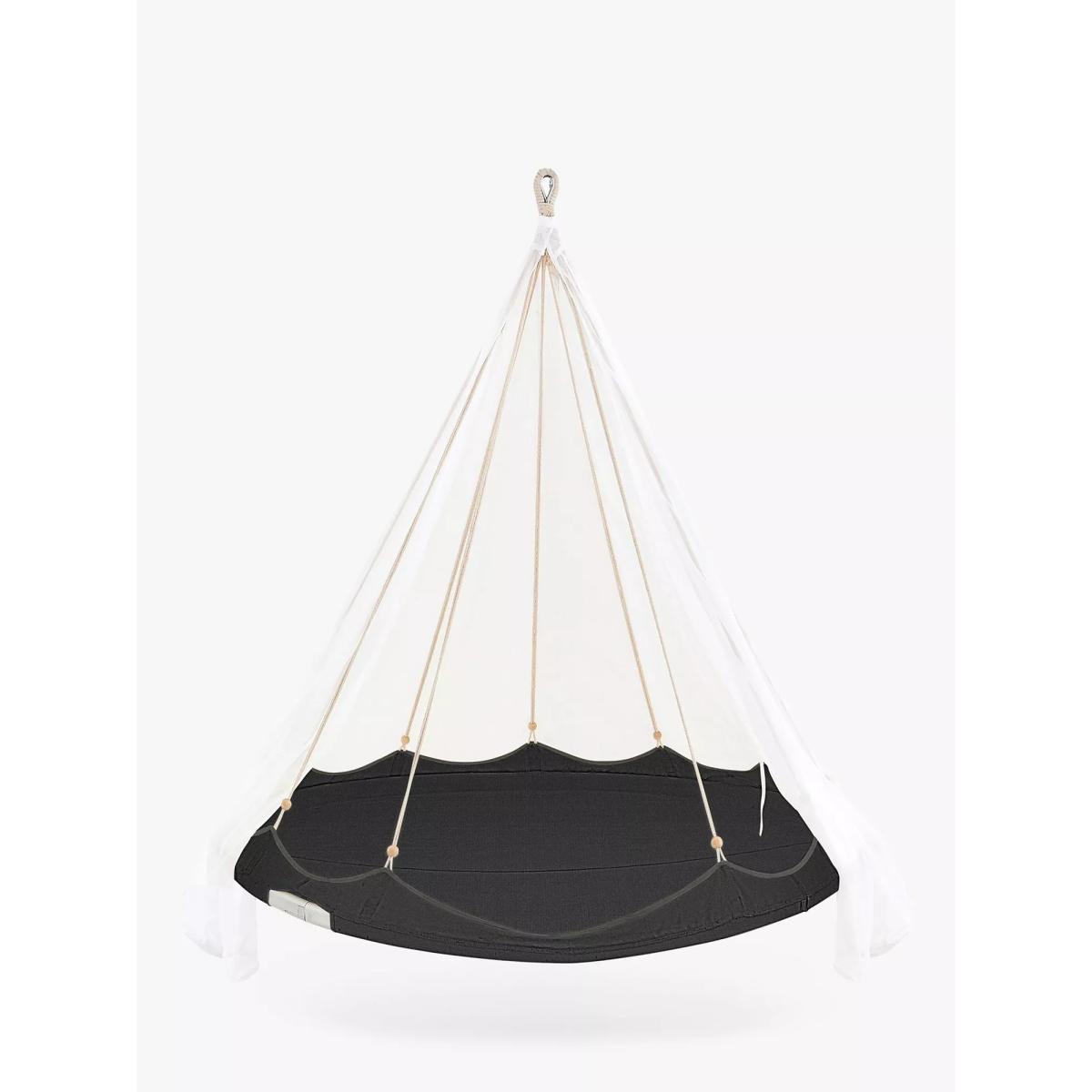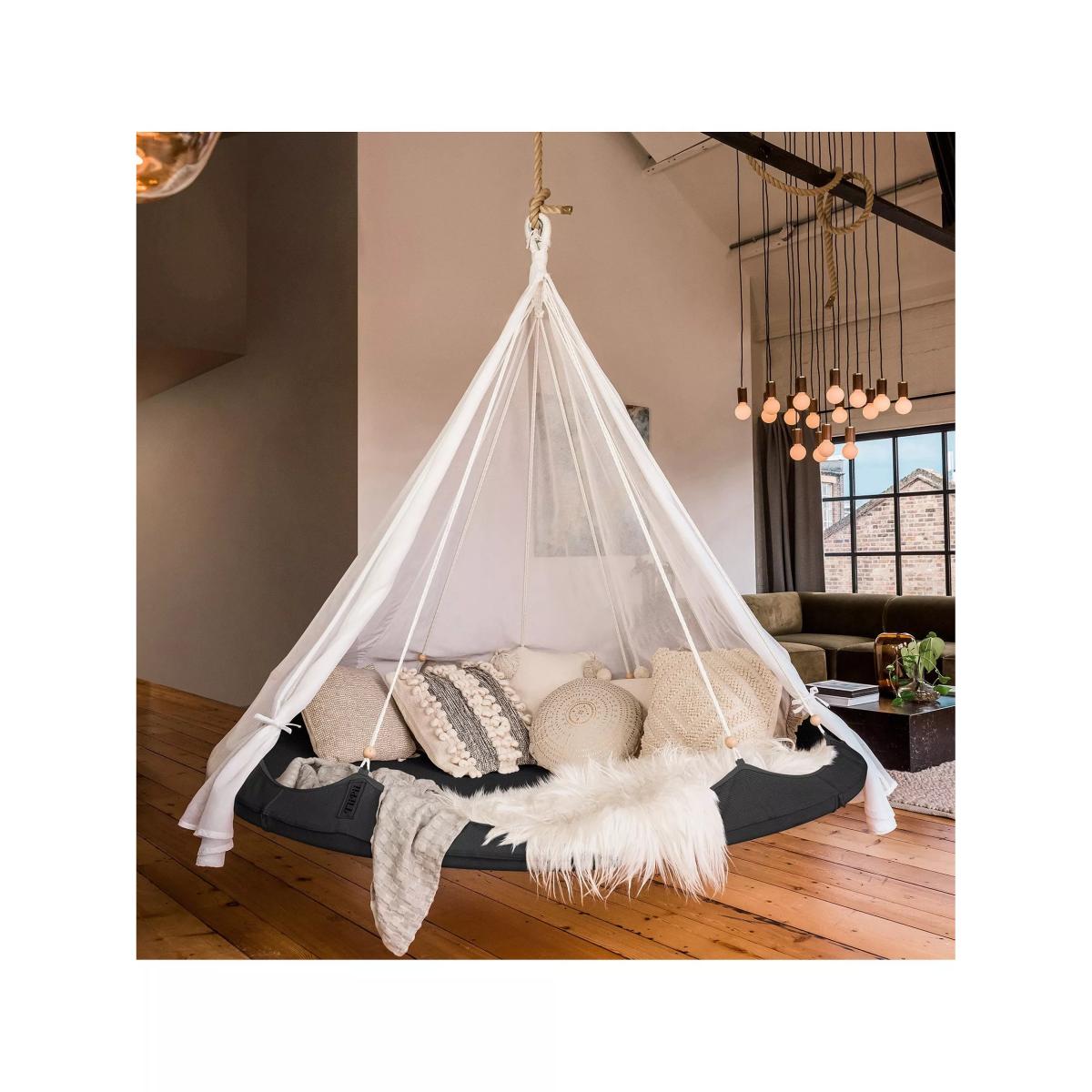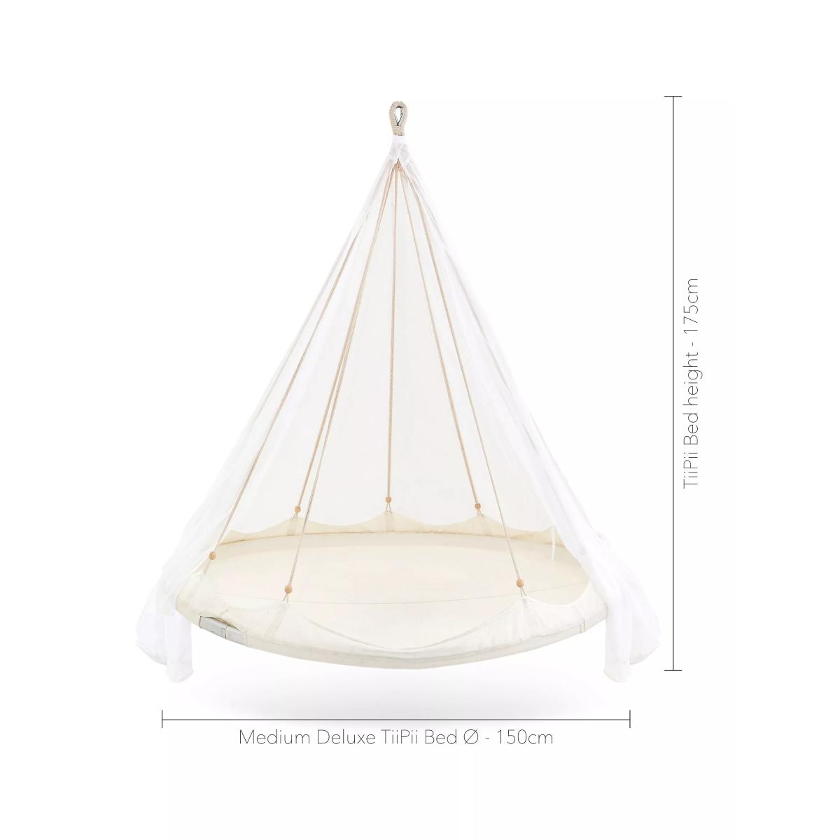 Explore your new Tii Pii space: read, play, snuggle, inspire, sleep, relax; it's up to you. The Medium Classic Tii Pii Bed comfortably supports two to three adults and is the ultimate floating daybed, bringing luxury lounging to the great outdoors. Exclusively made with Sunbrella® solution-dyed material that’s specially designed for hearty outdoor living and commercial applications, the Deluxe collection is the recommended range of choice for all poolside, seaside, resort or rooftop lounging environments. This is due to the refined Sunbrella® weather-resistant woven acrylic that is anti-stain, anti-mould and completely UV-resistant. The fabric is light, breathable and brilliant to the touch. Reinforced aluminum ring sections within the Deluxe bed alongside all-weather ropes ensure this range withstands the elements and the environment in which it's placed. Showcasing macramé finishing touches and a chic attachable sheer net, it's stylish and contemporary with comfort like no other. Suspend it from a safe outdoor structure, beam or branch or pair it with Deluxe Bronzed Stainless Steel Tii Pii Stand, sold separately. All elements compact down into a convenient transportable canvas storage bag, giving you the option to take the Tii Pii on holiday, to a festival or on the road to your next adventure. Complete the look with the Medium Tii Pii Poncho Protective Weather Cover, sold separately. Key features: Supports up to 250kg Suitable for frequent outdoor use Made with Sunbrella® performance fabric Anti-mould, anti-stain, anti-UV and water-resistant Reinforced aluminium ring sections All weather synthetic ropes Easily assembled in 10 minutes Includes sheer white ambient net Machine washable or spot cleaned with diluted bleach Compacts down into a 70cm bag for storage and transportation Free-hang or suspend from a Tii Pii Stand (sold separately) Weighs only 7.5kg