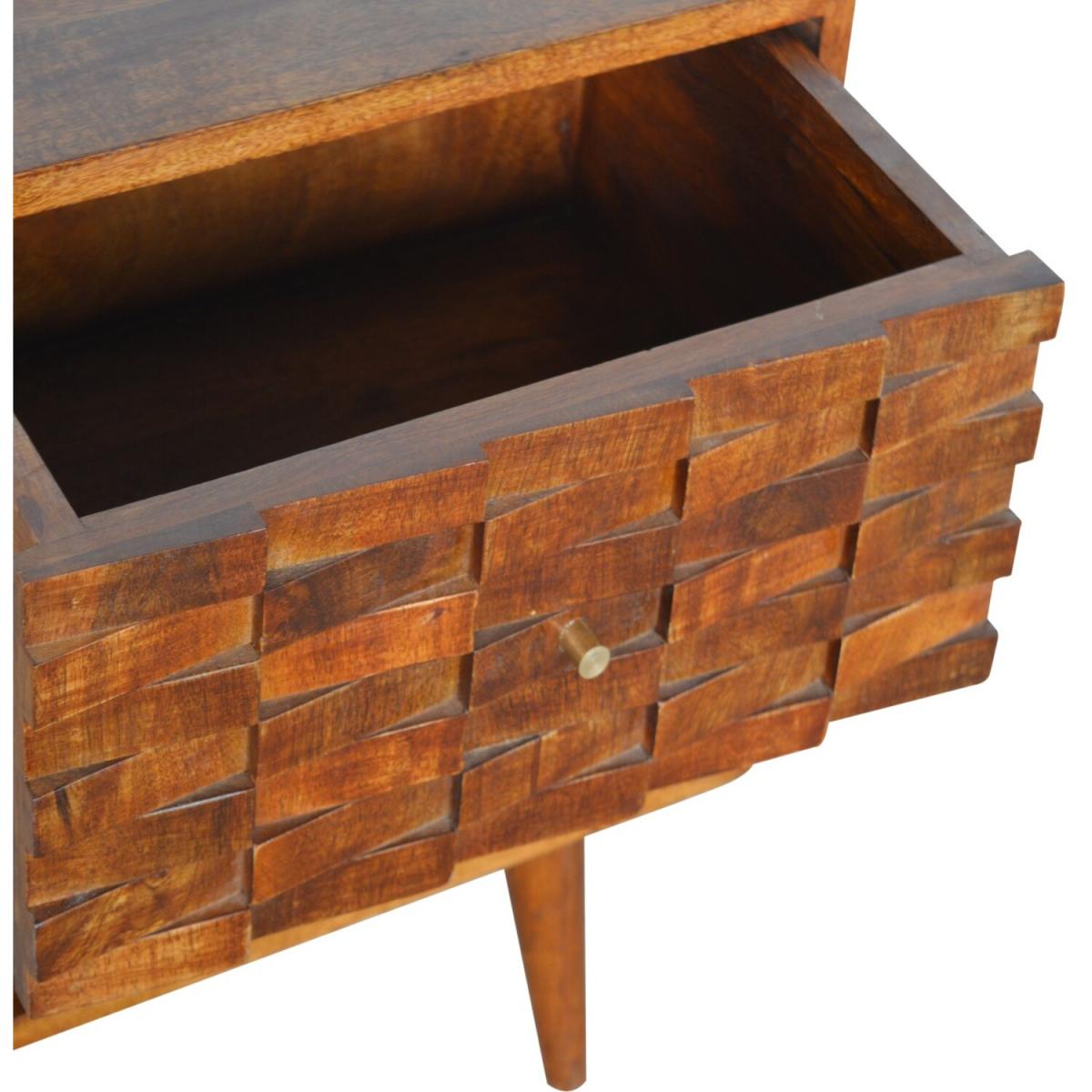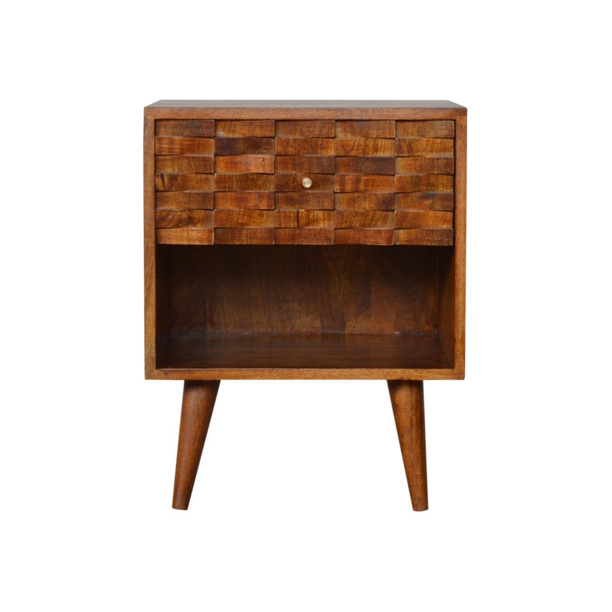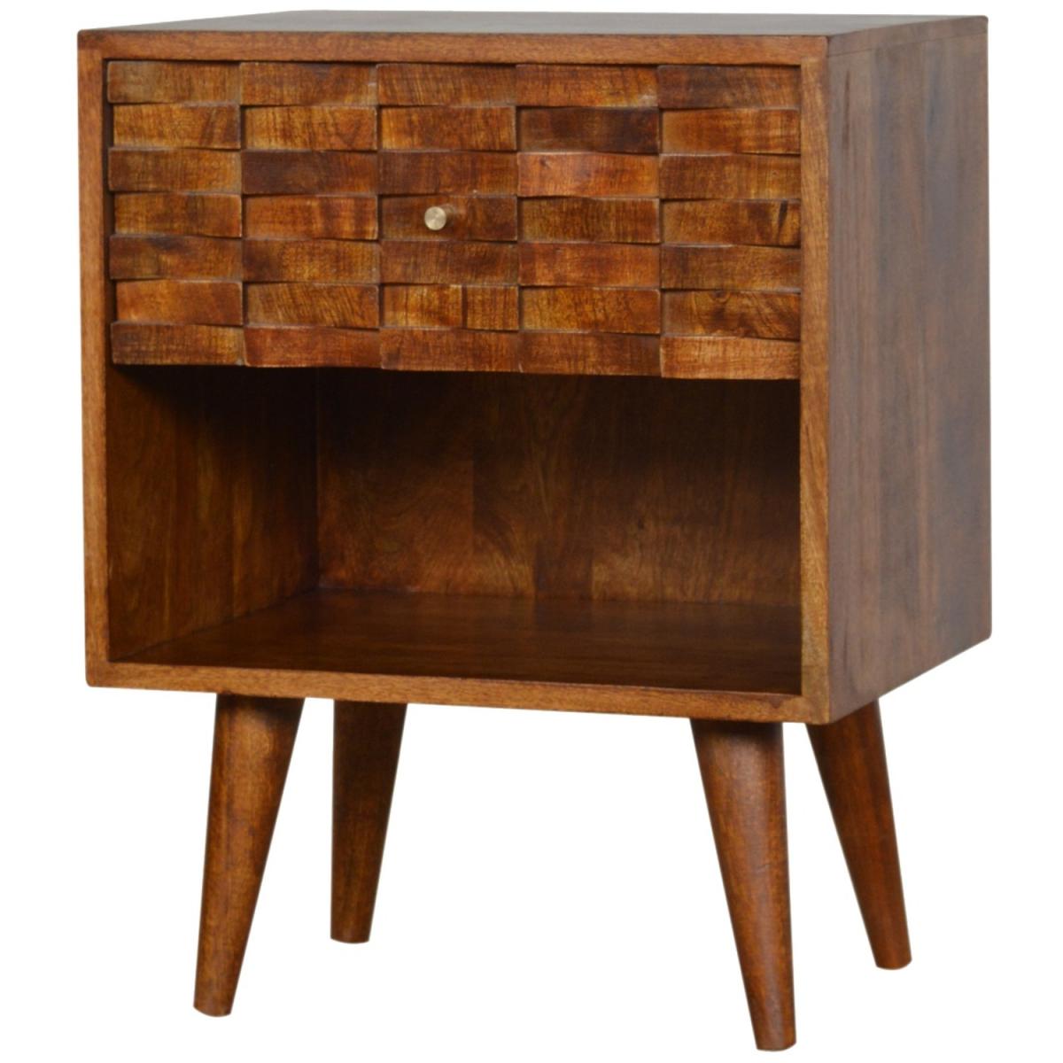 This solid wood bedside table has been hand-crafted from mango wood in a chestnut finish. It features Nordic-style legs with 1 drawer which has a shiny brass candle knob and an open slot perfect for storage. This piece offers a subtle tile hand-carved design on the drawer front which will create a modern look in your home.