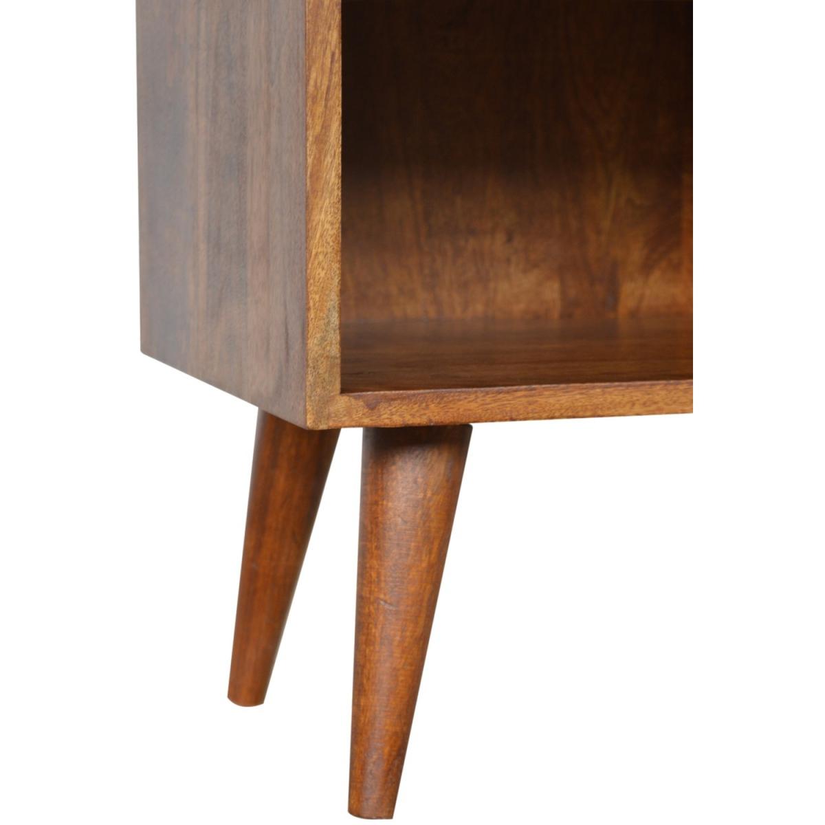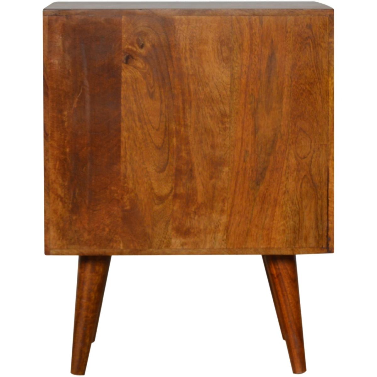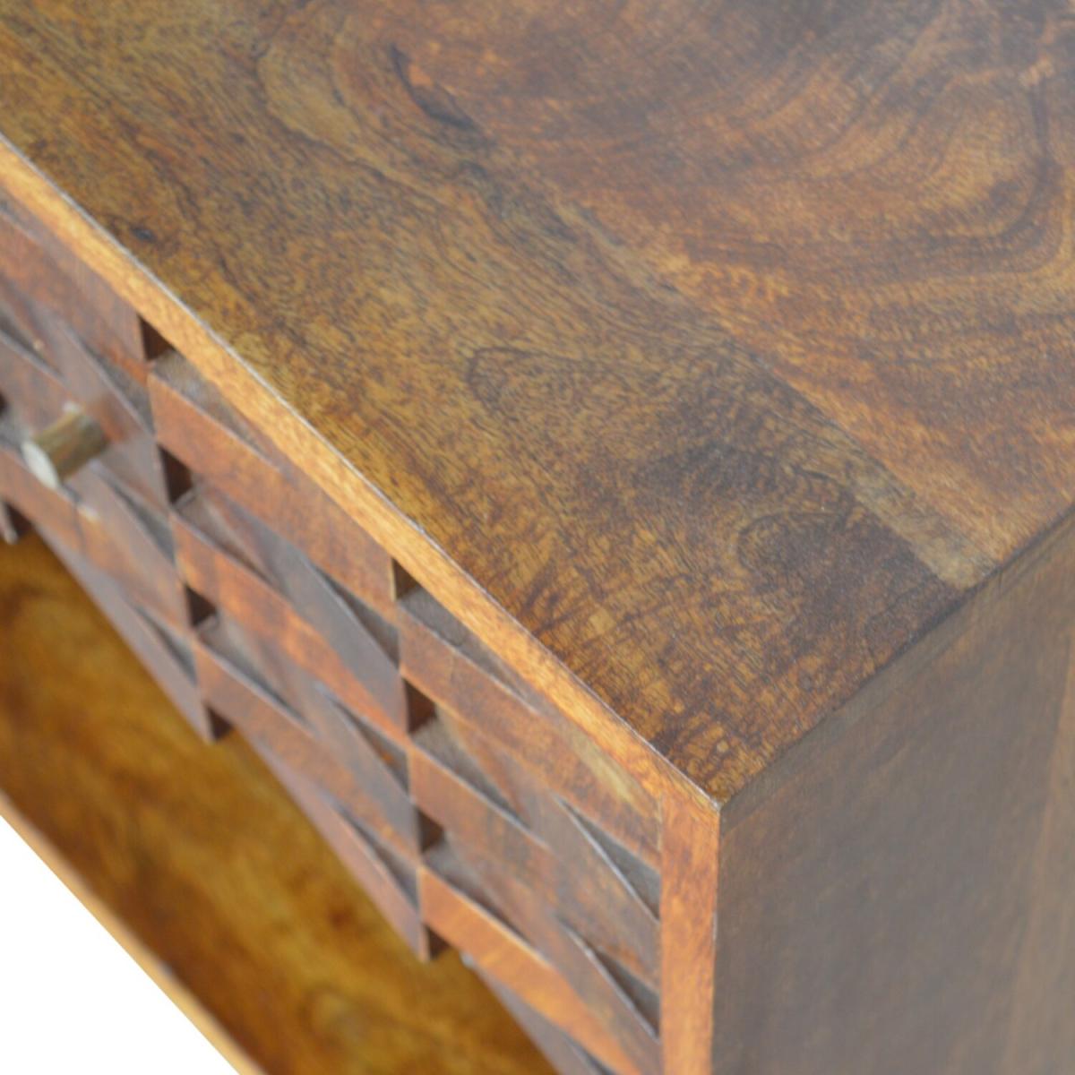 This solid wood bedside table has been hand-crafted from mango wood in a chestnut finish. It features Nordic-style legs with 1 drawer which has a shiny brass candle knob and an open slot perfect for storage. This piece offers a subtle tile hand-carved design on the drawer front which will create a modern look in your home.