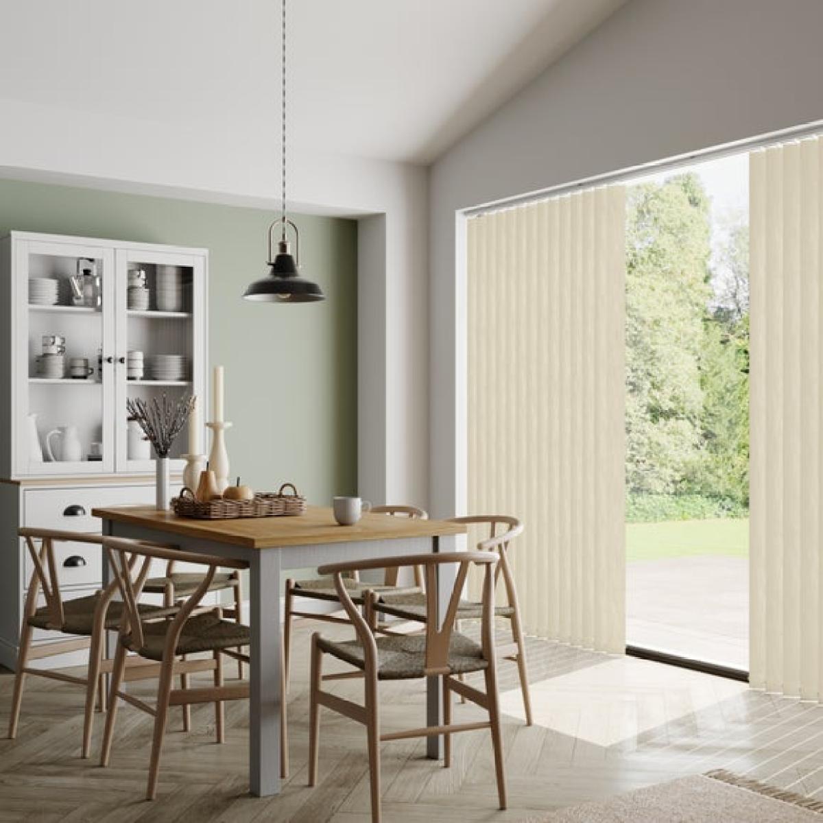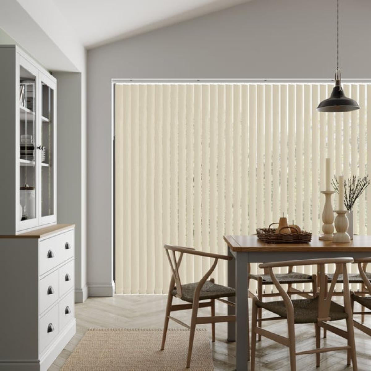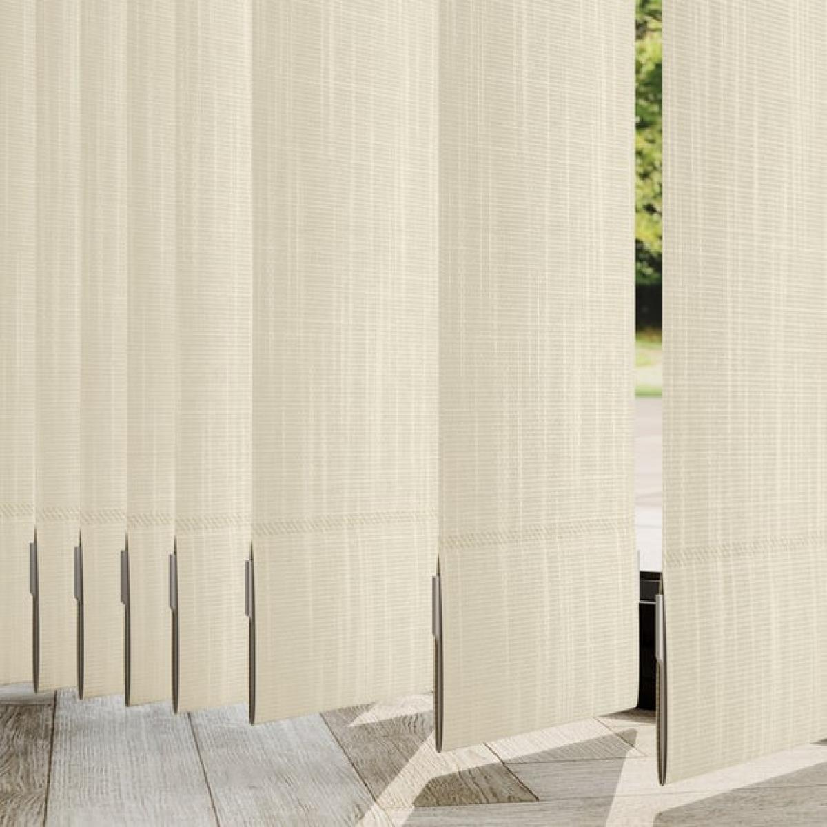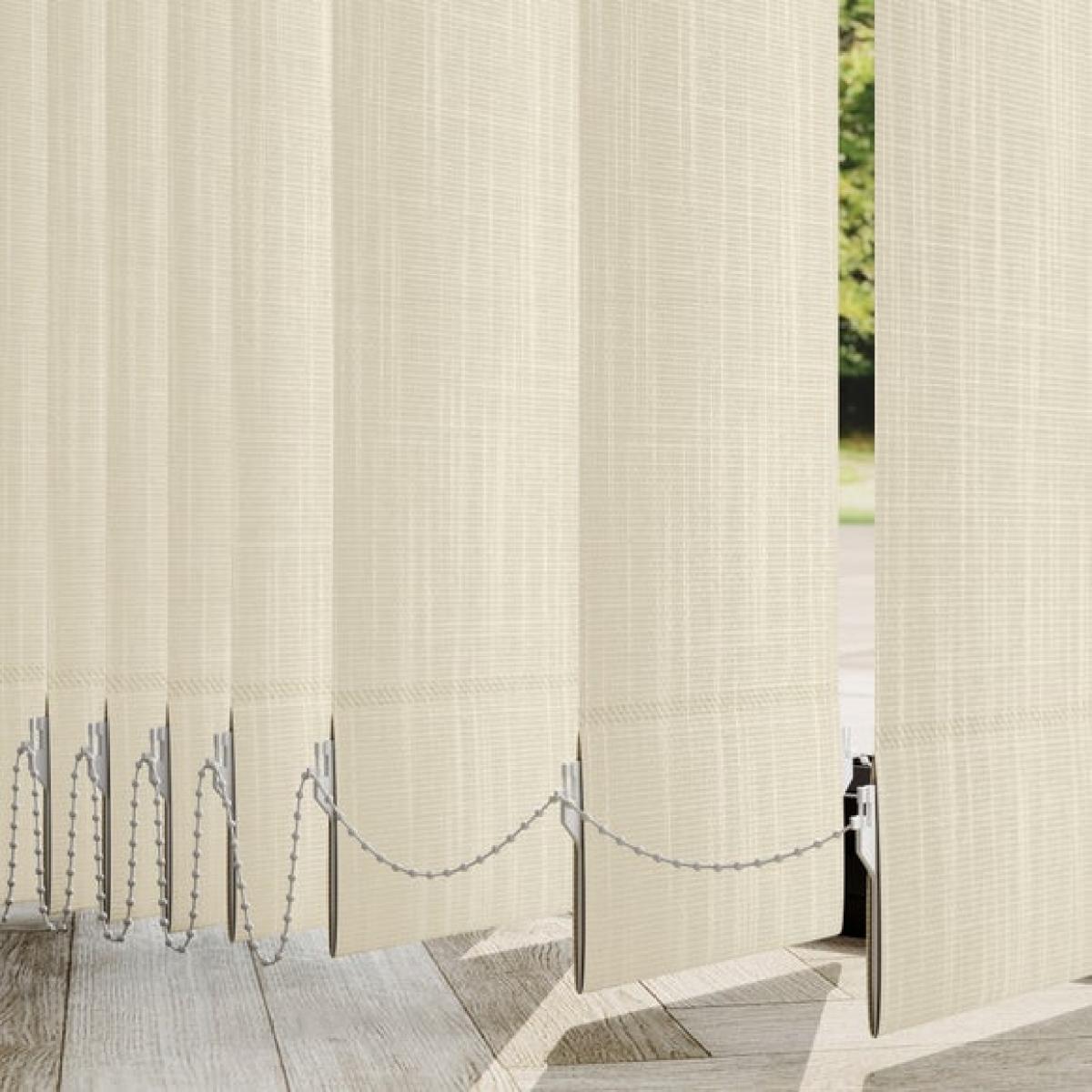 * Choose your fabric and colour * Select your fitting type, bracket type, and control type * Pick your stack side and bottom weight Finish your home with a beautiful, timeless style with the Timara textured fabric that's perfect for creating a country classic look. Please note that there will be batch differences so the sample may vary slightly to the product. There is also a 0.5mm tolerance for the product.**Choosing your fitting type:** * Inside the recess: this gives a tidy, snug finish as it's made to fit your window exactly. * Outside the recess: this option is great if you want more light to enter your room when the blinds are open. **Choosing your bracket type:** * Top fix: fitted into the top of the window recess or ceiling for a neat finish. Recommended for inside recess. * Face fix: fitted to the wall above the window, outside of the recess so your blind will cover the entire window. Recommended for outside recess. Available in standard 89mm or longer 127mm lengths. **Choosing your control type:** * Wand: the wand control pulls your blind to your desired position over your window and also tilts the blind slats with a twist. This option is perfect for homes with pets or children as it hangs out of reach. * Chain: the chain control allows you to pull the chain to tilt the blind slats and use the draw cord to open and close. The standard length of the chain is 1m. Please read our [Blinds Safety Guide](https://www.dunelm.com/info/buying-guides/blinds-safety-guidance) for more information on how to make your chain child and pet friendly. **Choosing your stack side:** * Left stack: your blind slats will stack to the left of your window or door. * Right stack: your blind slats will stack to the right of your window or door. * Split stack: your vertical blind will open from the centre, leaving a stack of blind slats on both the left and right of your window or door. **Choosing your bottom weight:** * Chained weights: each blind slat is weighted and includes a stabilising chain at the bottom which gives a classic feel and is great for drafty days. * Chainless weights: each blind slat is weighted at the bottom removing the need for a stabilising chain. This option is more pet and child friendly. **Need help deciding or measuring? **Book a free appointment with one of our consultants!