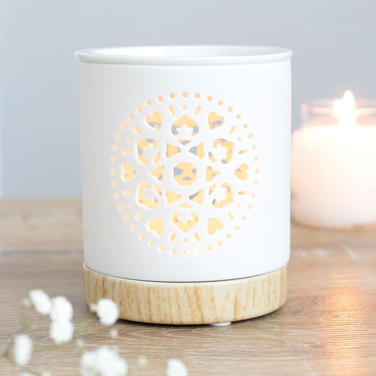 Timeless and Elegant Mandala Oil Burner with Wood-Effect Base - White