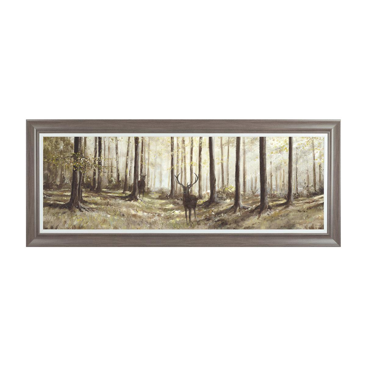 Harnessing the beauty of delicate strokes, this Timeless Stag Framed Print beautifully illustrates two deer stood among trees with light filtering down through the canopy. Presented in a light wood-effect frame, this captivating print uses soft earthy shades of brown and green, making it a rustic and breathtaking wall piece.