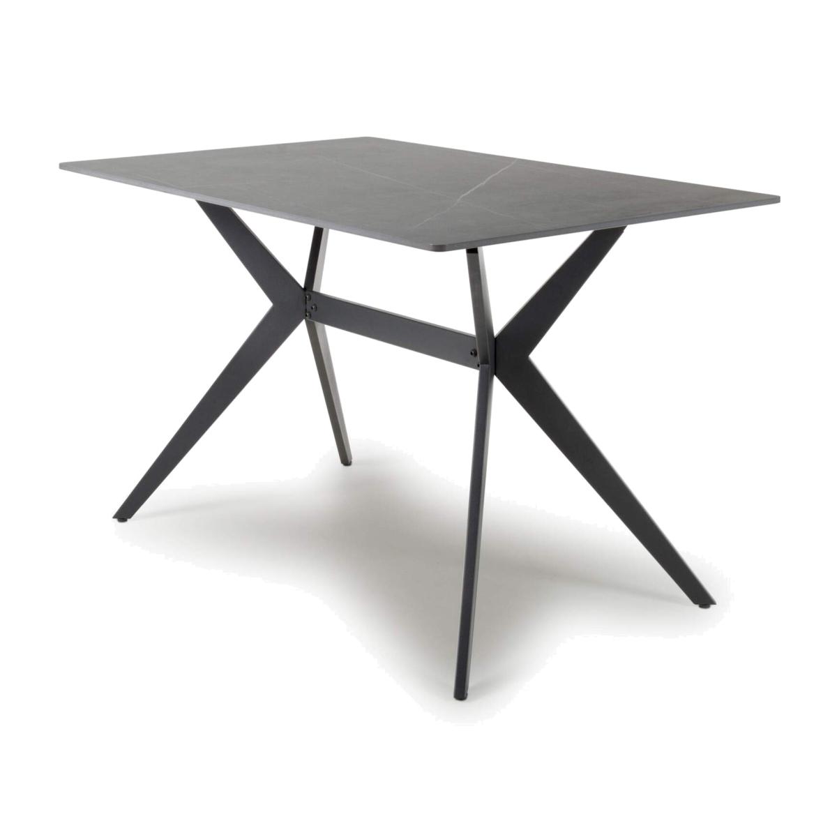 This trendsetting 1.2m sintered stone dining table is set off by fashionable diagonal criss cross markings. The sturdy 12mm thick ceramic table top comes in an attractive reflective finish. Completed by stylish black powder coated metal X-frame legs. Assembly required. Sold individually.