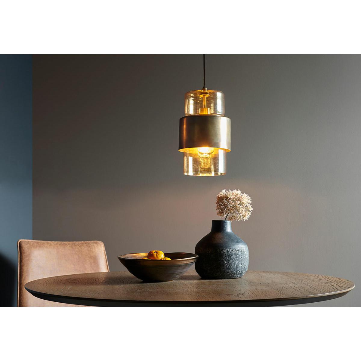 The Timothy range takes inspiration from the industrial trend and puts its own artistic twist on it. Combining shiny glass and metallic patina, this range produces a paired-back textural marvel; versatile enough to work with a range of interiors but unique enough to be noticed, and for all the right reasons. This small pendant is made up of a perfect amber glass cylinder, sporting a lampholder for a filament bulb of your choice, and a neat cylindrical panel finished in a rich brass patina. Pair with any of the Timothy wall lights to complete this stylish look.