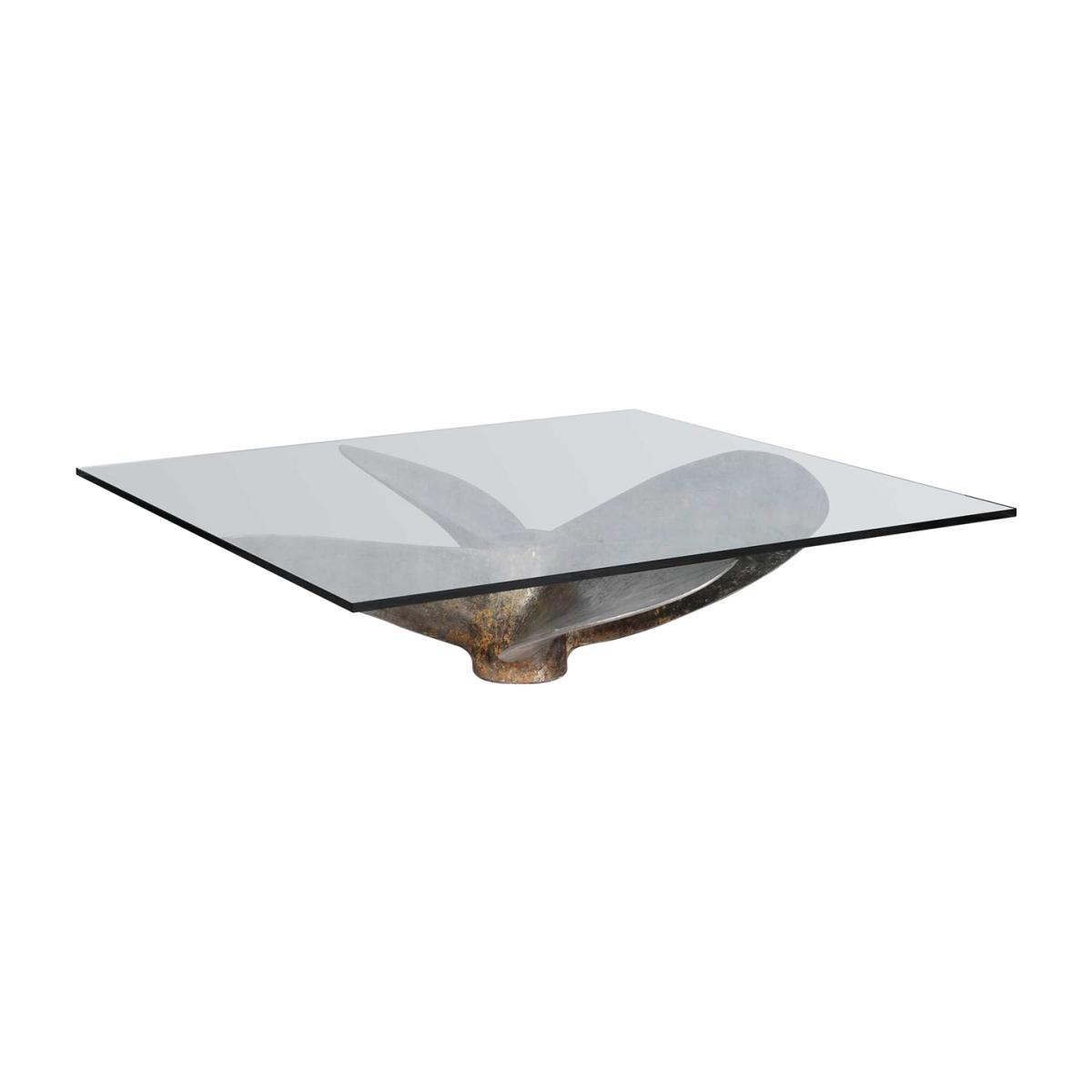 Design. Resurrected from the seas, this captivating Junk Art coffee table features a genuine boat propeller, reclaimed from a Chinese fishing junk then topped with a simple pane of tempered glass. Certain to claim the attention of your living space with its 4 leaf propeller, this coffee table from Timothy Oulton oozes contemporary style and is certain to be a great conversation starter. Due to weight and delivery access, this coffee table requires assisted delivery. Please contact our web sales department for more information regarding delivery in your area.