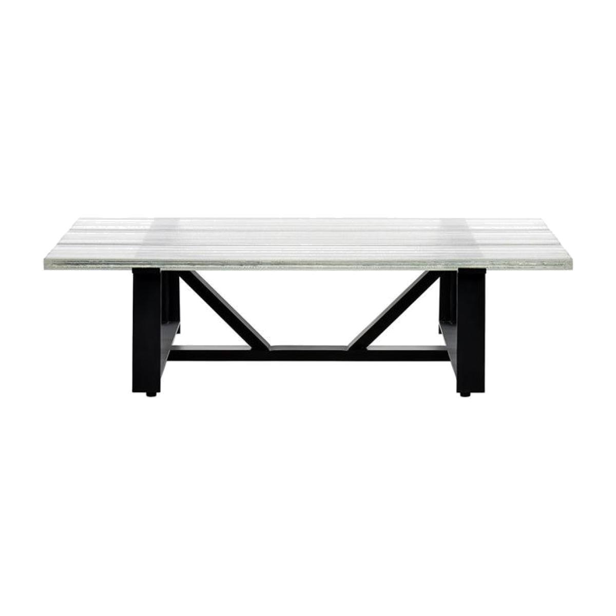 Design. Inspired by brave polar explorers from Captain Robert Falcon Scott to Roald Amundsen, this contemporary coffee table features three transparent glass beams that sit atop a sturdy black steel angular base. These beams represent solid frozen blocks of water, each displaying a unique wave-like texture in their finish.