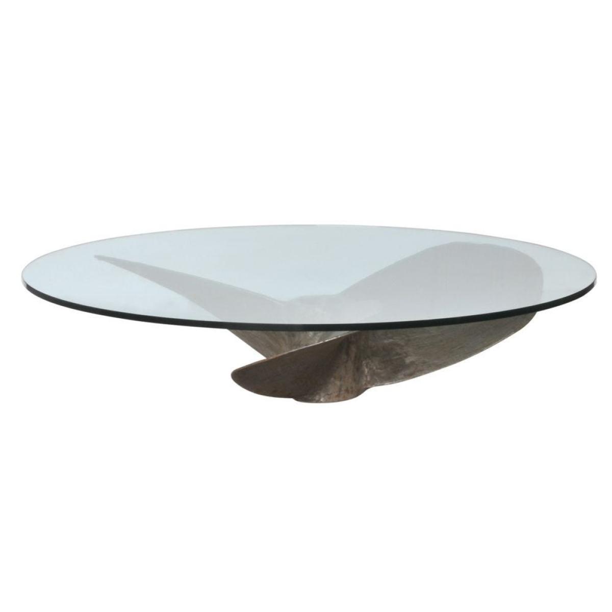 The distinctive Junk Art Propeller coffee table is handcrafted from the propellers of decommissioned Chinese fishing junks, topped with a simple pane of glass.