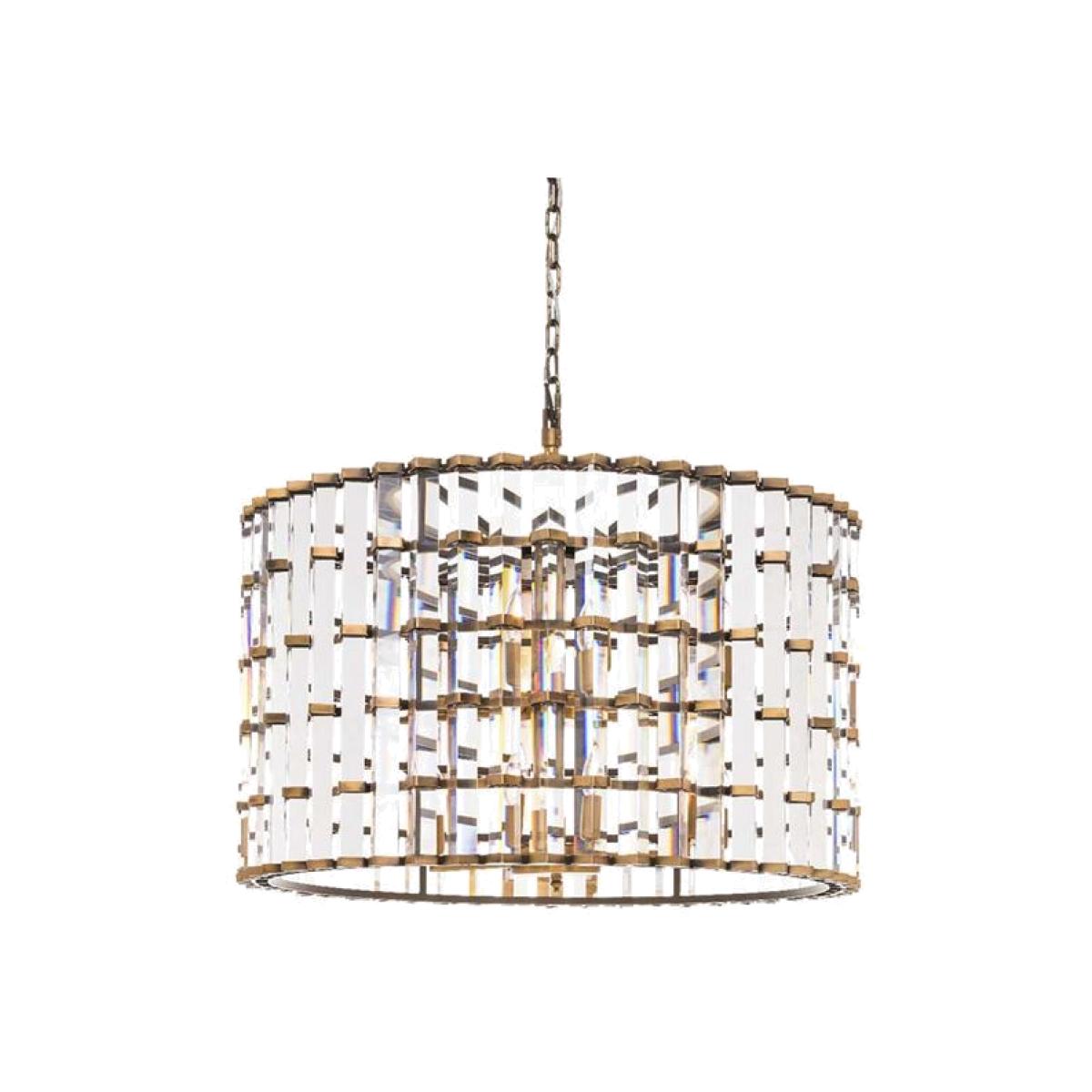 Tall, slender and glamorous, the Night Rod collection offers dramatic lighting for elegant urban spaces. Long prisms of optical grade glass are held tightly together in a staggered effect, within a skeleton of either brushed brass or natural metal. The triangular shape of the prisms reflects and refracts the light on all sides in a shimmering dance of sparkle.
