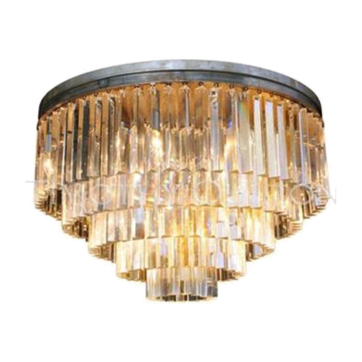 Design. The Odeon lighting collection is a modern day interpretation of Venetian glass prism chandeliers from the 1960s. These glamourous handcrafted mid-century modern lights are inspired by one of the greatest Roman architectural feats: the infamous elliptical Coliseum Amphitheatre. The fixtures have superior light dispersion capabilities due to the generous quantity of crystals drops – the large pendant has over 380 drops, and the high grade of the optical-quality glass drops. These opulent crystals are daringly contrasted with natural unfinished iron, pitting the raw masculinity of the finish which bears the marks of the welder’s torch against the dazzling femininity of the crystal. These beautiful pieces have been interpreted into many different functional lighting fixtures including floor lamps, table lamps, pendants and flushmounts.