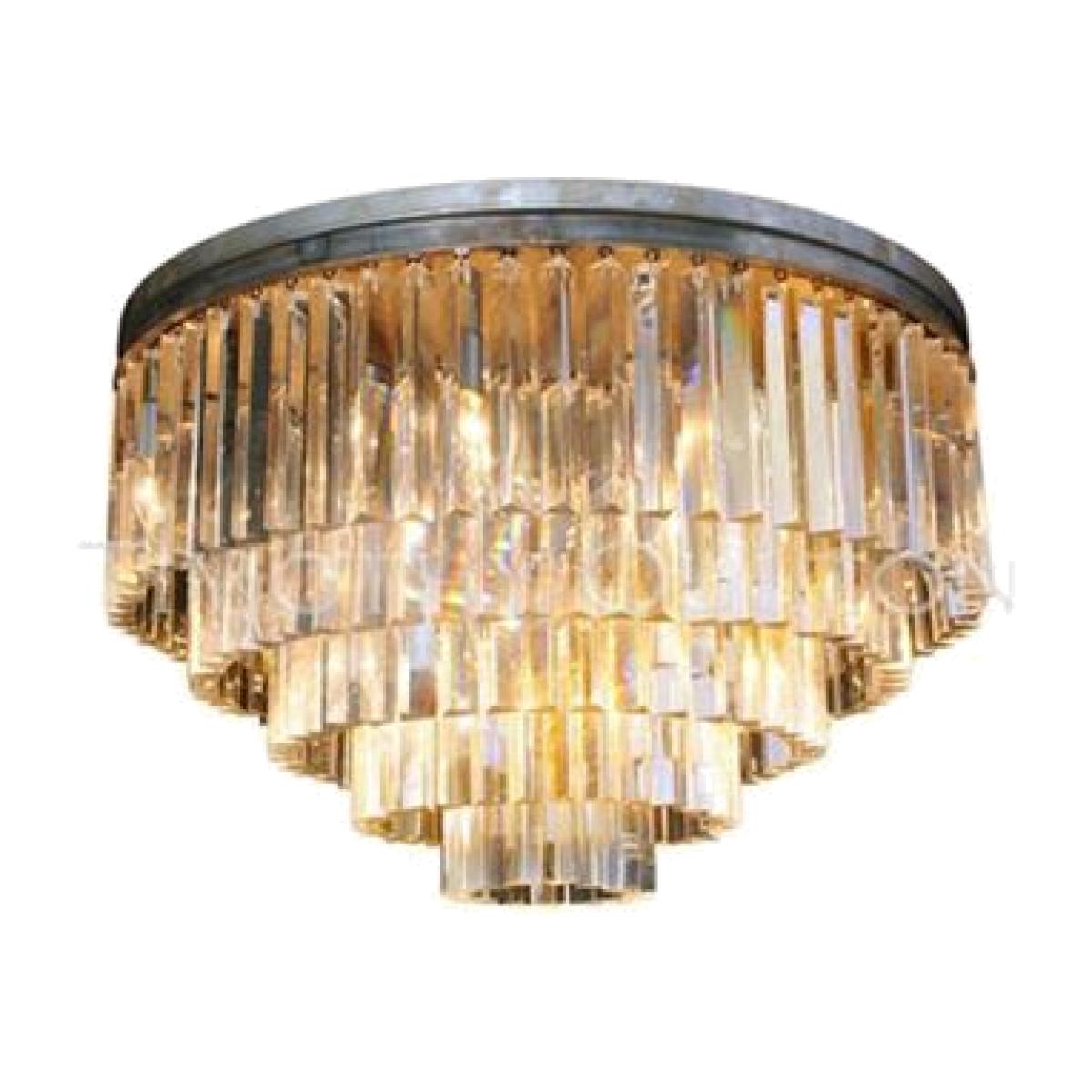 The Odeon lighting collection is a modern day interpretation of Venetian glass prism chandeliers from the 1960s. These glamourous handcrafted mid-century modern lights are inspired by one of the greatest Roman architectural feats: the infamous elliptical Coliseum Amphitheatre. The fixtures have superior light dispersion capabilities due to the generous quantity of crystals drops “ the large pendant has over 380 drops, and the high grade of the optical-quality glass drops. These opulent crystals are daringly contrasted with natural unfinished iron, pitting the raw masculinity of the finish which bears the marks of the welders torch against the dazzling femininity of the crystal. These beautiful pieces have been interpreted into many different functional lighting fixtures including floor lamps, table lamps, pendants and flushmounts.