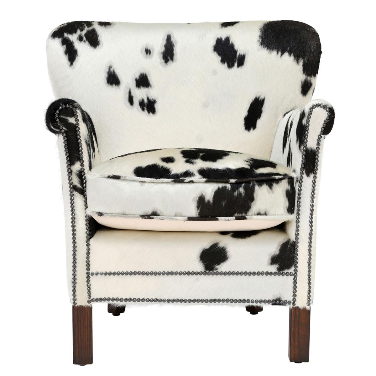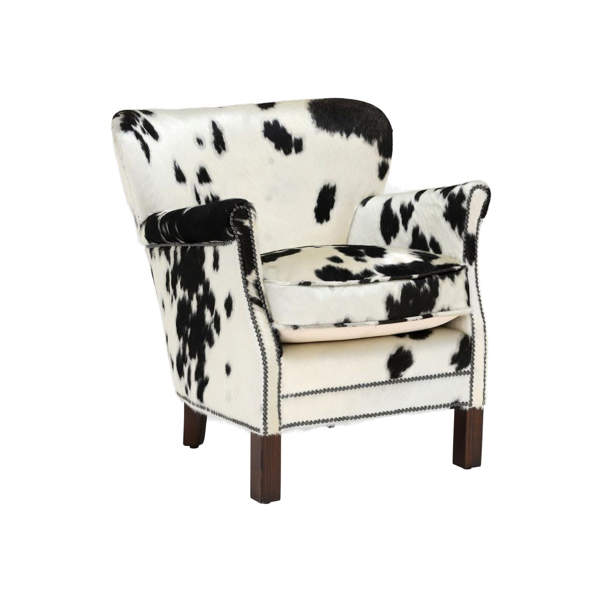 I’d call this the Professor chair - its black-and-white hide upholstery and studded trim give it real character. I love how it works as a statement piece in both industrial lofts and modern-farmhouse living rooms, injecting pattern without overwhelming a neutral palette. Pair it with raw-edge timber side tables and a chunky wool throw to soften the leather, or contrast it against muted linens and matte metal accessories for a more urban vibe. Make sure it’s angled slightly towards your sofa or fireplace to feel both inviting and deliberately placed.