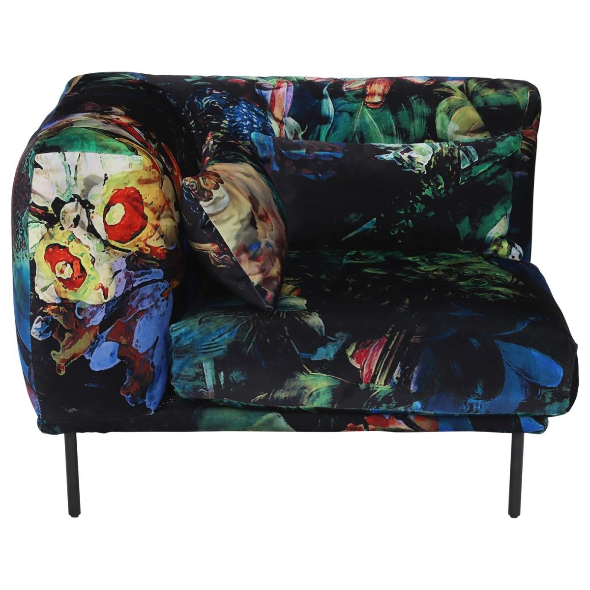 Design. A tribute to true softness, the contemporary-styled Studio sectional sofa invites refined relaxation. Fully-loaded feather pillows are wrapped around a gently supportive core, hugging the body for a joyfully sumptuous experience. Shown here in Acid Jungle velvet; a heady mix of vivid colour and equally intense darkness. Lush greens entwine with vibrant florals in an exotic scene that dances against a deep black backdrop. The perfect sofa for the urban jungle, to relax with friends and let your imagination run wild.