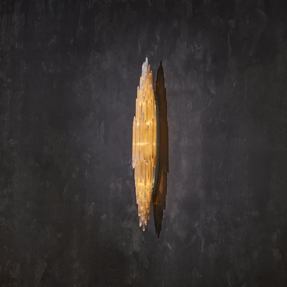 The Selenite Sconce, a luminary named after the moon goddess, reflects the soft pearlescent glow of moonlight. Crafted from the crystalline version of Gypsum, each Selenite crystal is meticulously affixed to the frame, suspended like glistening stalactites. Revered for its spiritual and protective properties, Selenite is believed to unlock the chakra of divine wisdom. This wall light emanates a celestial ambience, embracing the ancient beauty of the 500,000-year-old mineral. Illuminate your space with the ethereal glow and spiritual essence of the Selenite Sconce, a true masterpiece in lighting design