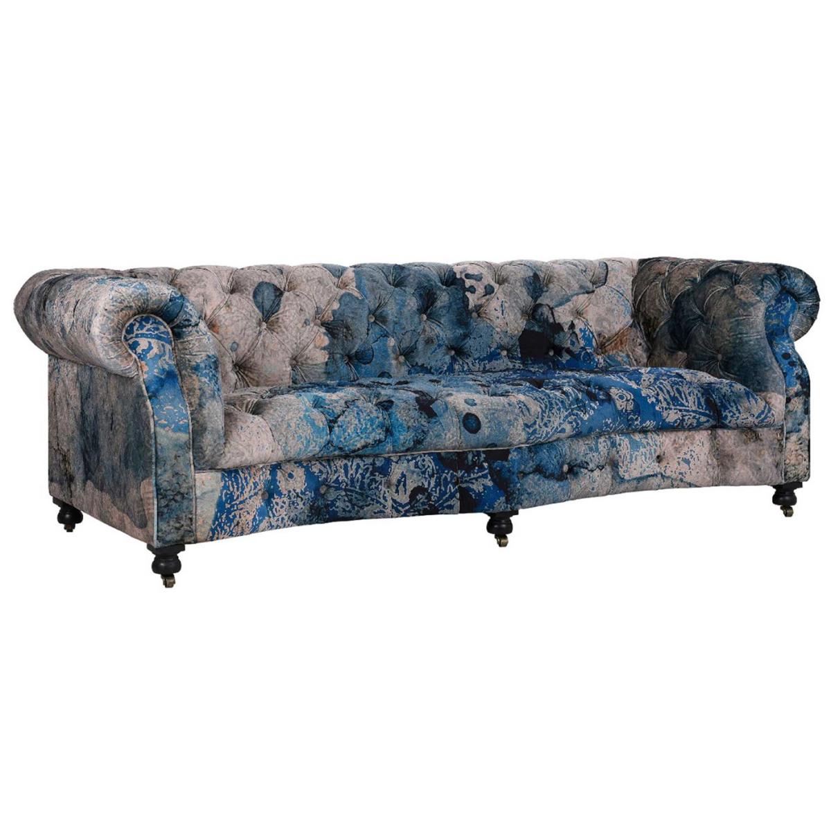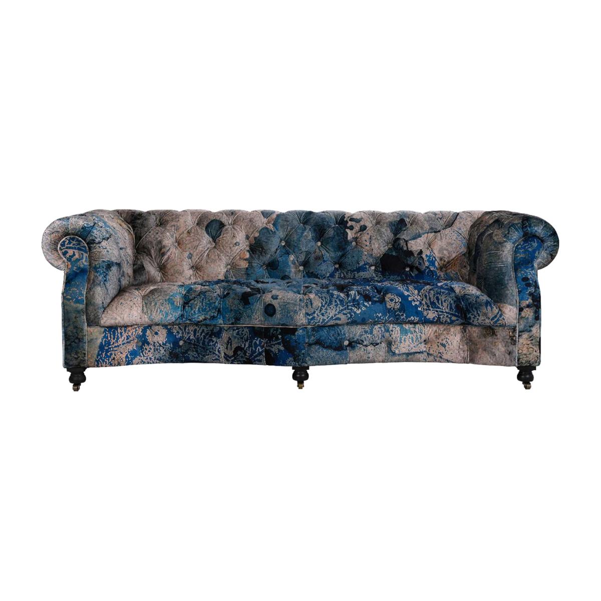 Upholstered in luxuriously soft velvet, the Serpetine 3 seater sofa is full of vintage charm and contemporary quality. Boasting elegant button detailing, grand scroll arms and a shapely silhouette, it has all of the dramatic presence that youd expect from Timothy Oulton. In ripples of blue and neutral hues, the Melting Paisley fabric gives this stunning Chesterfield sofa an utterly distinctive look. Inside, sumptuous foam and fibre filling provides complete comfort as you relax into its seat.