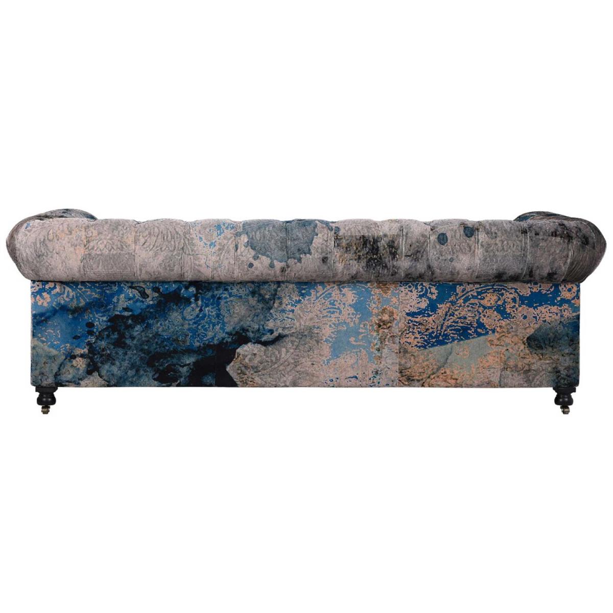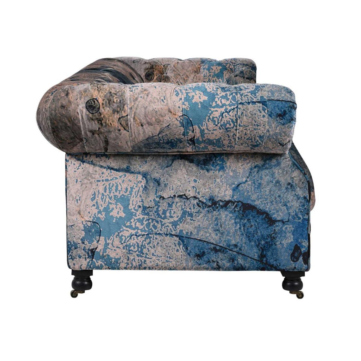 This blue Chesterfield sofa makes a bold statement and works particularly well in eclectic or classic interiors where statement fabrics and vintage touches come into play. I love its traditional silhouette paired with the contemporary, painterly fabric that adds a modern twist. For styling, consider combining it with neutral-toned cushions and textured throws to keep the focus on the fabric’s pattern while adding cosy layers. It’s also versatile enough to anchor a traditional living room, or serve as an eye-catching piece in a more minimalist setting when paired with sleek accessories and understated art. Because it’s a 3-seater, it offers great practicality for everyday living while still delivering visual impact.