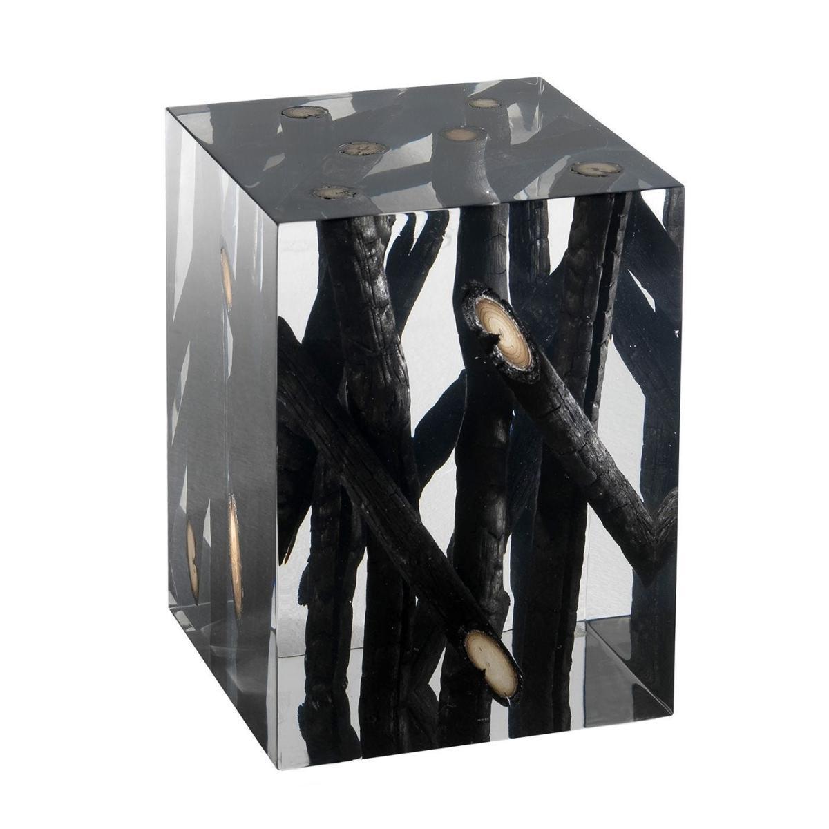 The icy sharpness of clear acrylic is juxtaposed with the warmth of charred driftwood for a tantalisingly tactile experience. Selected from beaches all over the world, the driftwood is carefully burnt by hand to highlight the timber's unique character and deep grooves. The imperfections in the wood are celebrated and preserved, respecting the passage of time and the idea that time actually makes things more beautiful.