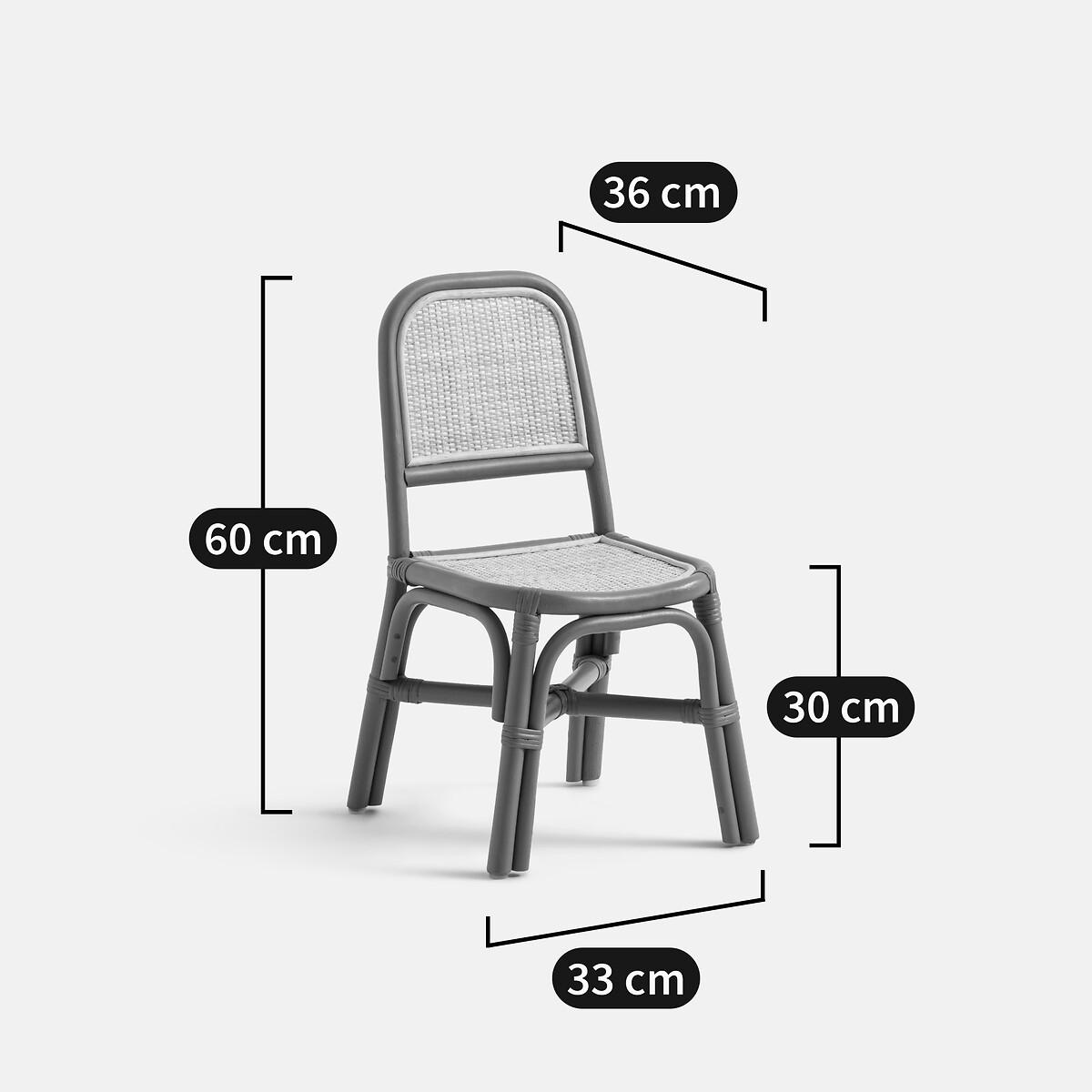 Retro style, fresh colours and meticulous details: the Tina chair overturns the classic rules on rattan. Perfect around a desk or solo in a reading corner, it combines comfort and elegance with its light frame and airy canework. A piece with character creating a lively, bright, seriously stylish area for kids. Product Details • Rattan cane frame • Seat and backrest in braided rattan • Nitrocellulose varnish finish • Artisanal craftsmanship. Dimensions • Width: 33cm • Height: 60cm • Depth: 36cm • Seat:L28 x H30 x D29cm • Weight:Weight: 1.5kg. Quality Info • This product complies with current safety requirements • Suitable from age 3 years • Sold pre-assembled. Parcel Dimensions • 1 parcel • L36 x H63 x D39cm. 3kg