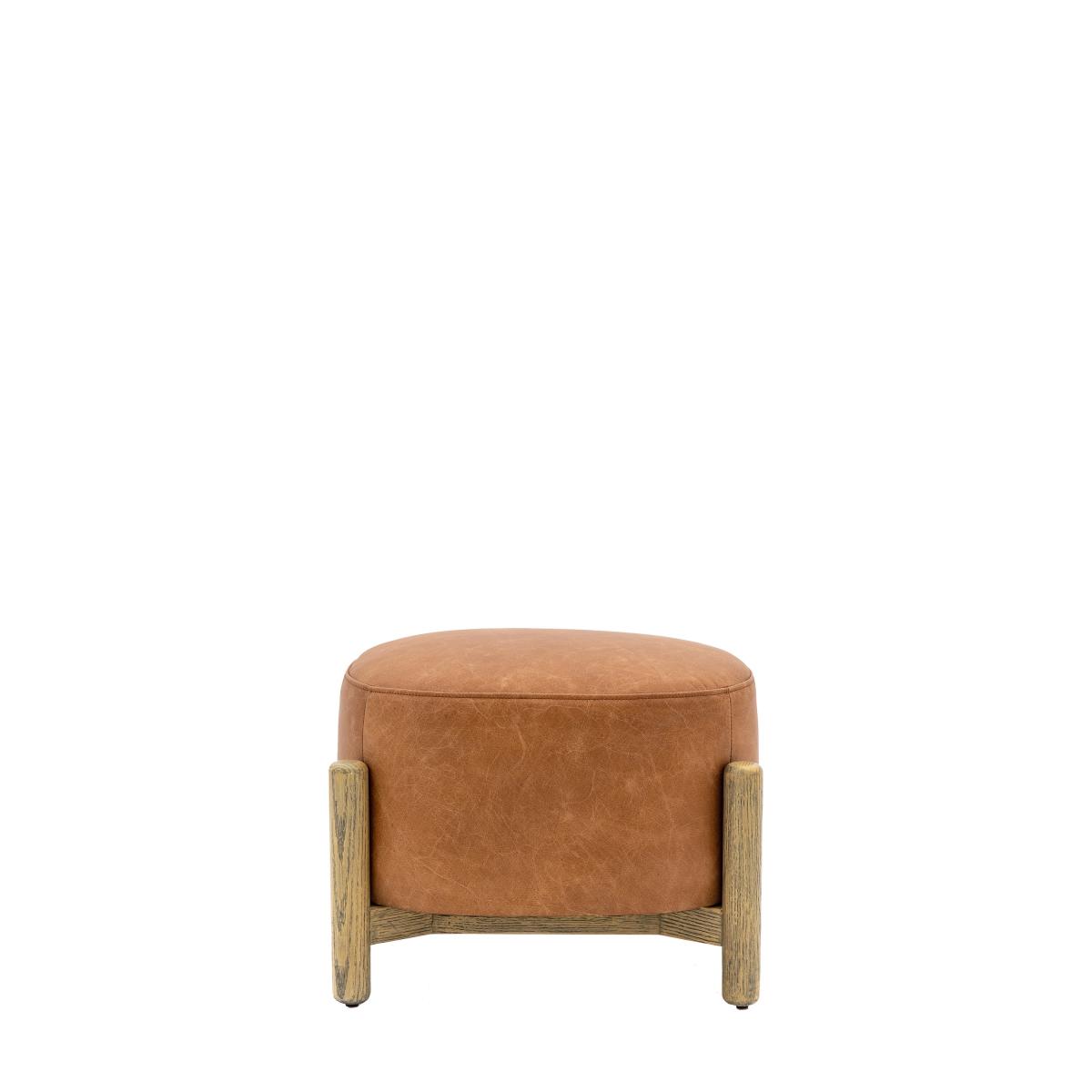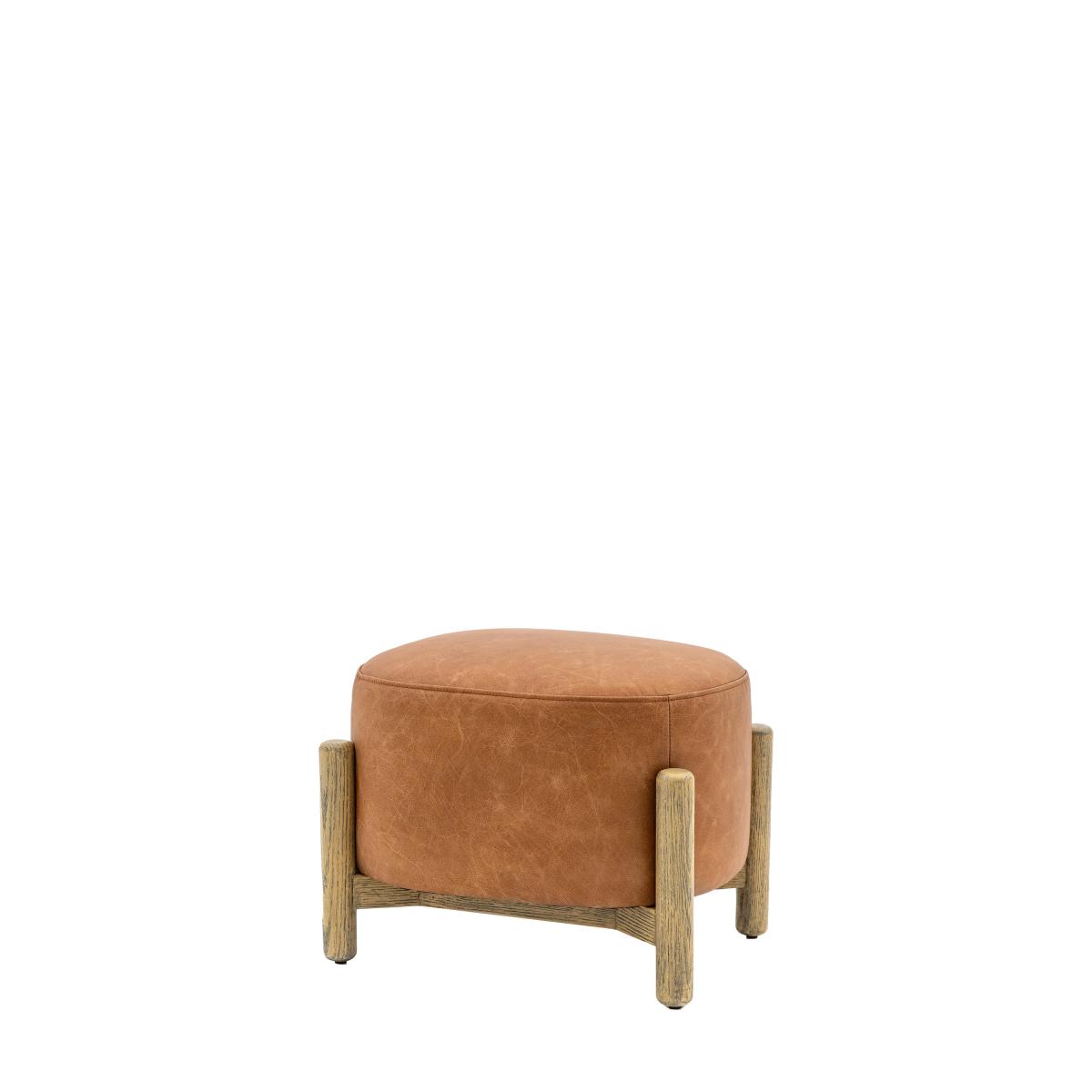 The eye-catching style of this lovely footstool features a beautifully designed wooden base which supports a deep cushion, upholstered in vintage-style brown leather. It is also available in a lovely natural coloured fabric and matching armchairs are available. The eye-catching style of this lovely footstool features a beautifully designed wooden base which supports a deep cushion, upholstered in vintage-style brown leather. It is also available in a lovely natural coloured fabric and matching armchairs are available.