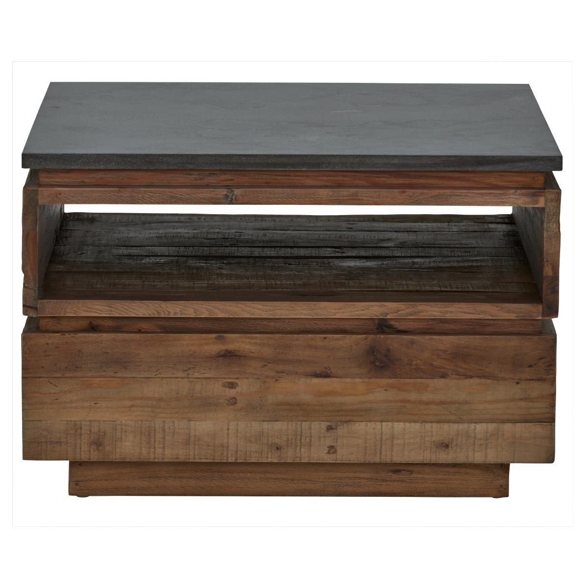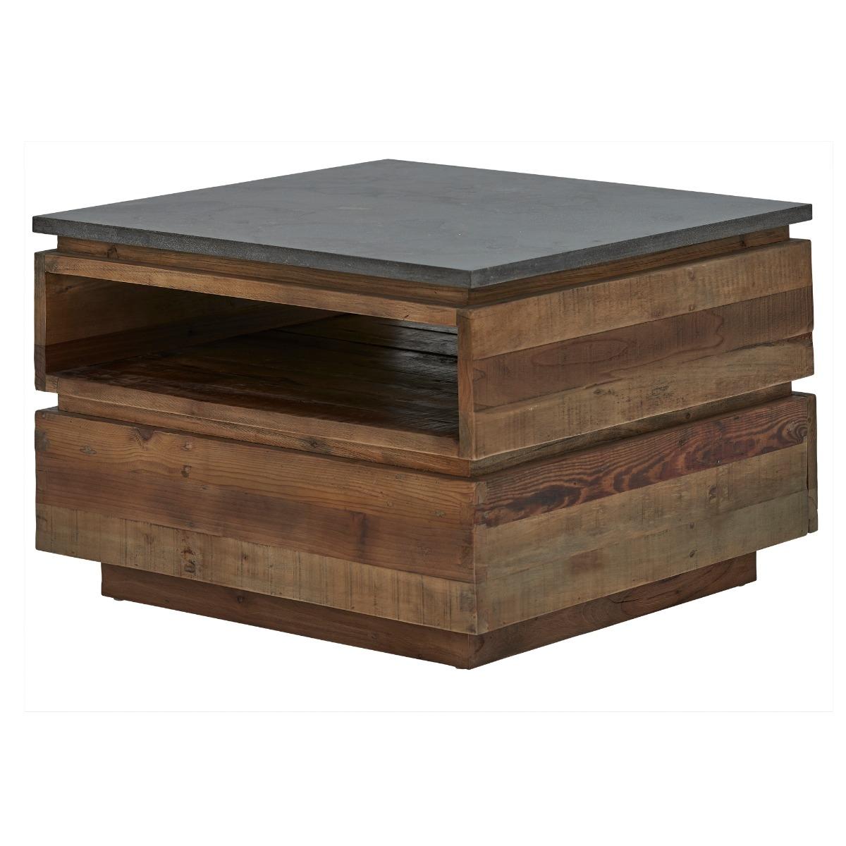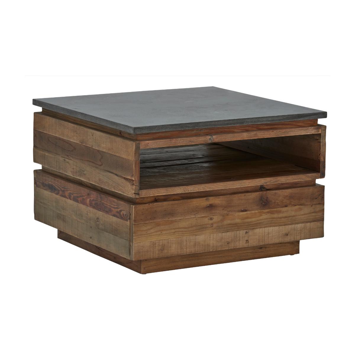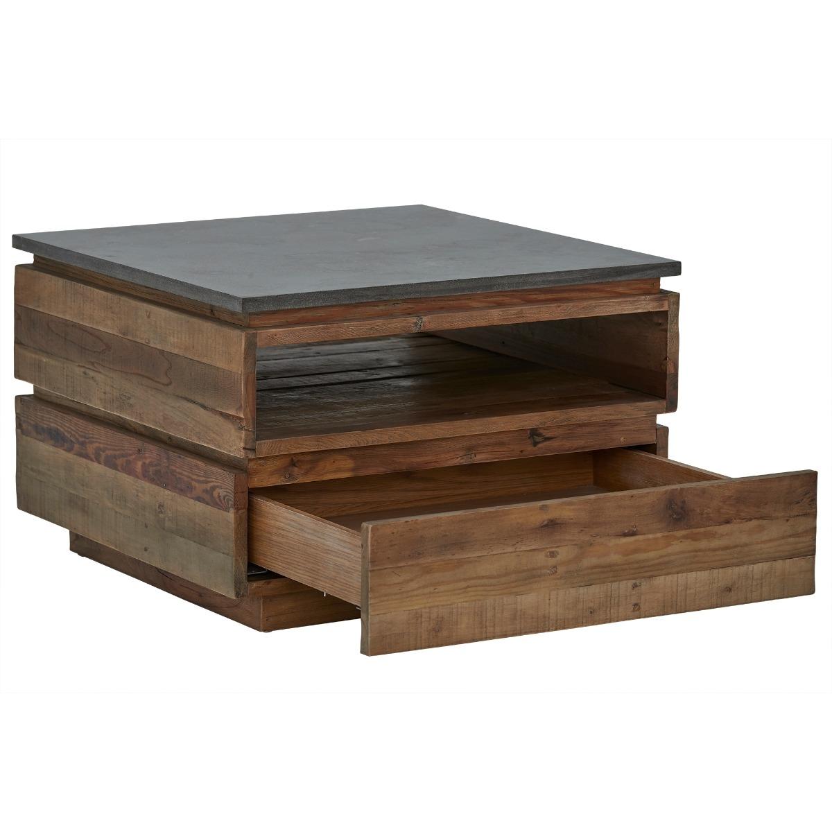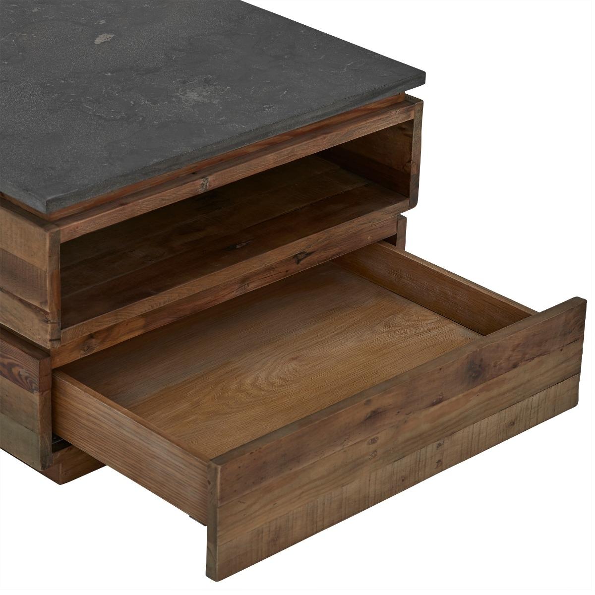 Design. The Tindra Medium Coffee Table has a natural charm to it, with piece of wood stacked atop of one another resembling crates, this would work well in a modern or industrial setting. The blue stone top of the Medium Tindra Coffee Table compliments the lightness of the wood, with a handy gap below to neatly keep your magazines or remote controls hidden away.