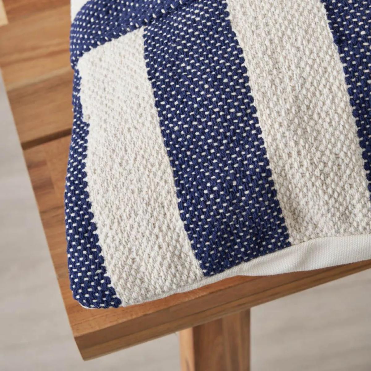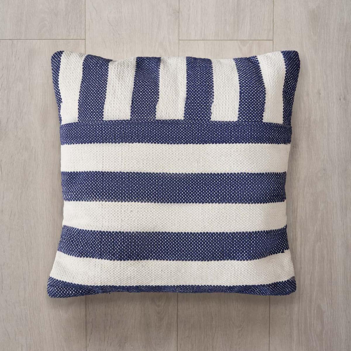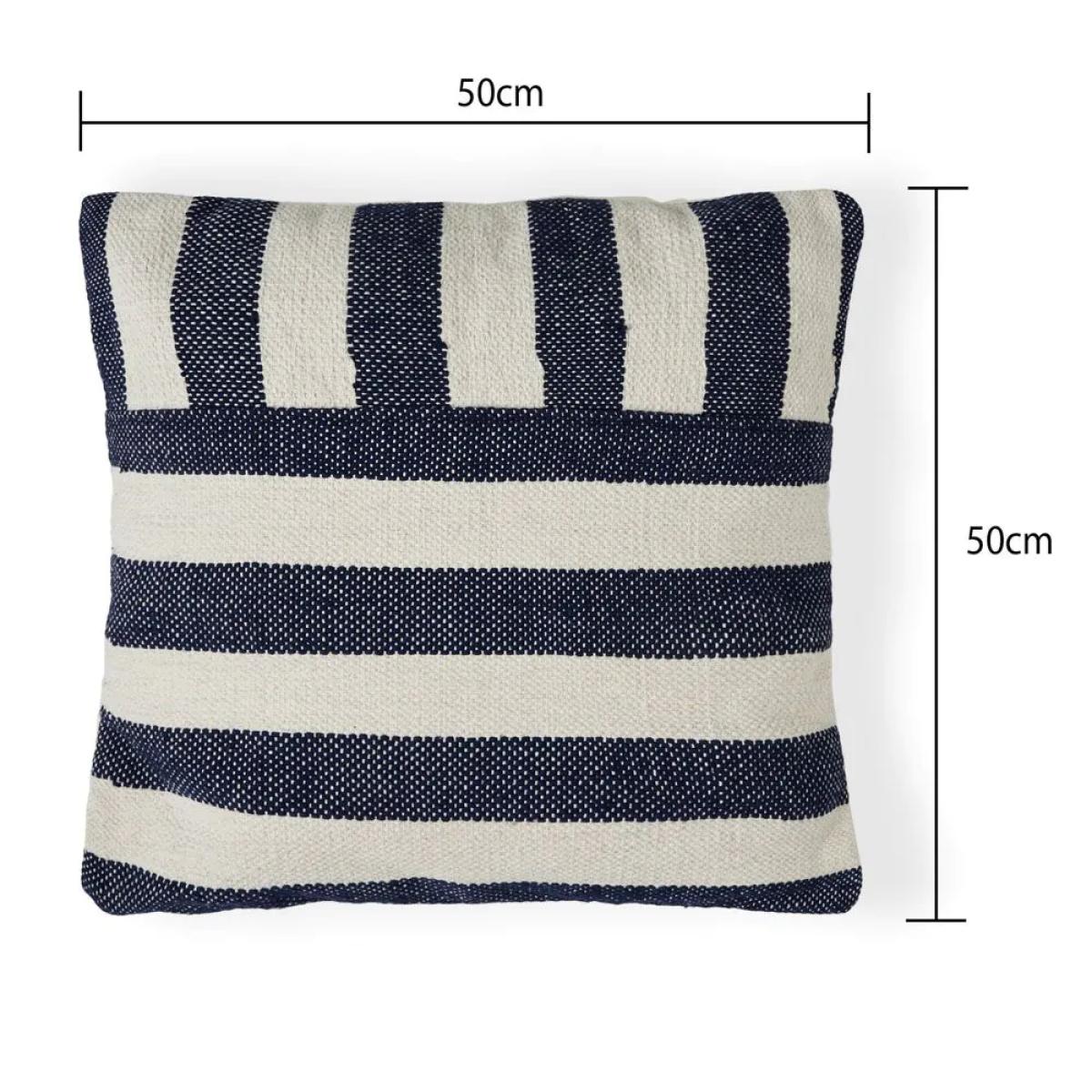 Introduce a coastal aesthetic to your home with the Tino Cushion in navy. The alternate stripes create a visually appealing look which will become the main focal point of any room. Style this relaxing cushion anywhere you would like such as in your living room as it boasts a welcoming atmosphere. Made from 100% cotton, you can ensure the longevity of this cushion by spot cleaning only.