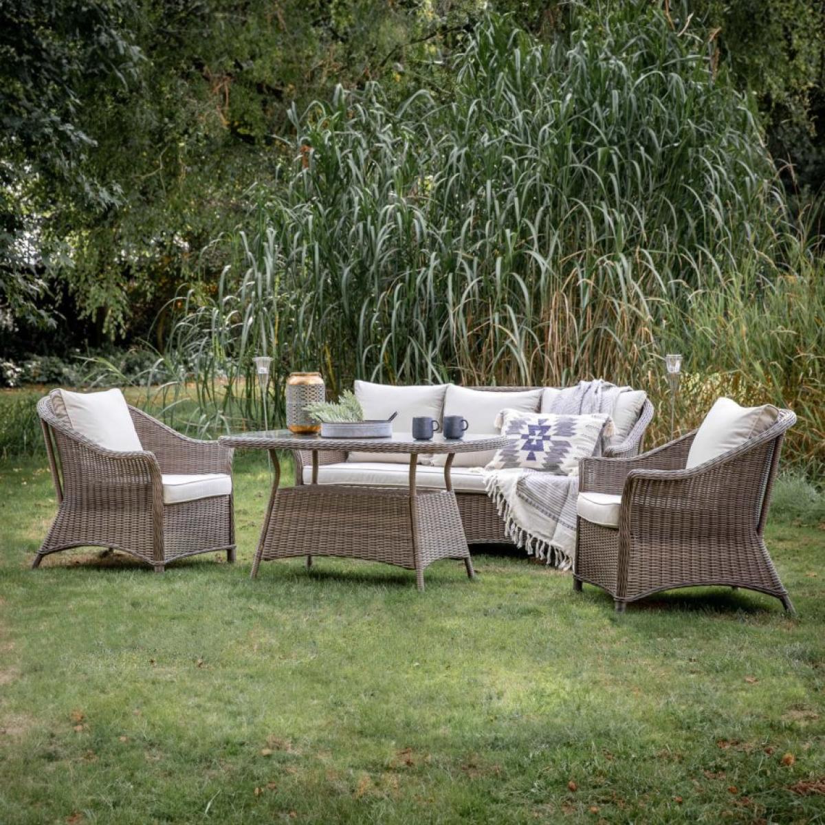 This Tinto Lounge Sofa Set is perfect for outdoor eating and relaxing. Featuring a 3-seater sofa, two armchairs, and a dining table, all pieces of this lounge set are crafted from all weather 5mm PE rattan with a hand woven mixed half roundfull round weave in a natural finish. For comfort and practicality, the sofa and chairs have luxurious showerproof cushions in a soft neutral colour to complement the colour of the rattan. The table has a shelf and a parasol hole perfect for a wide range of parasols, while the frames are powder coated aluminium and the table top is tempered glass... *Simple Self Assembly *Sofa Dimensions:W185cm x D79cm x H84cm *Armchair Dimensions: W79cm x D79cm x H84cm *Table Dimensions:W130cm x D70cm x H65cm *Seats 5 *Made From Aluminium, Polyester Fabric, Poly Rattan, FR Foam, and Polyester Fibre