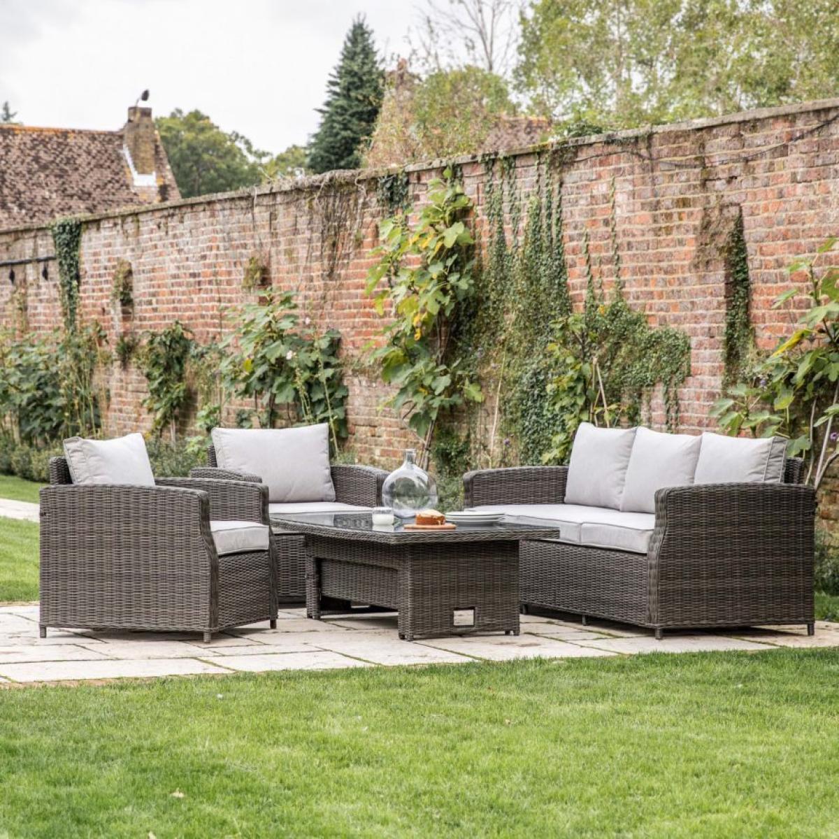 The Tinto Sofa Dining Set, which features a 3-seater sofa, two armchairs and a dining table, is perfect for outdoor eating and relaxing. All pieces are crafted from all weather 5mm PE rattan with a hand woven mixed half roundfull round weave in a grey finish. For comfort, the sofa and chairs have luxurious showerproof cushions in a soft grey colour to complement the colour of the rattan. The table has a shelf and a parasol hole perfect for our parasols, while the frames are powder coated aluminium and the table top is tempered glass. *Simple Self Assembly *Table Dimensions:W130cm x D70cm x H65cm *Chair Dimensions: W79cm x D79cm x D80cm *Sofa Dimensions:W185cm x D79cm x H84cm *Seats Five *Made From Aluminium, Polyester, Poly Rattan, and FR Foam