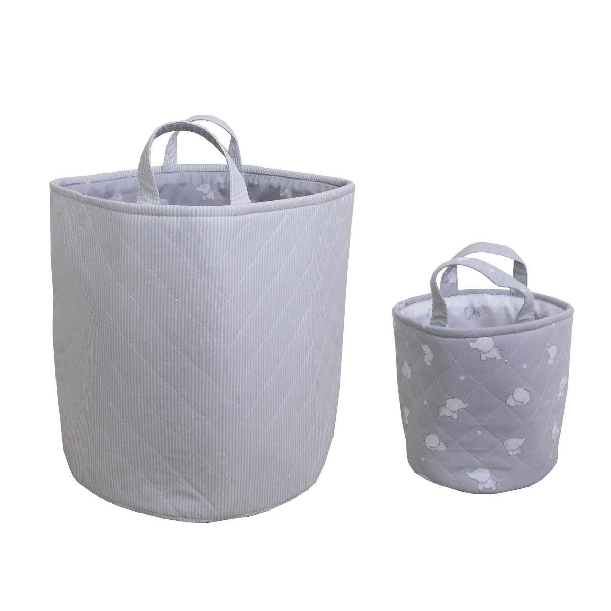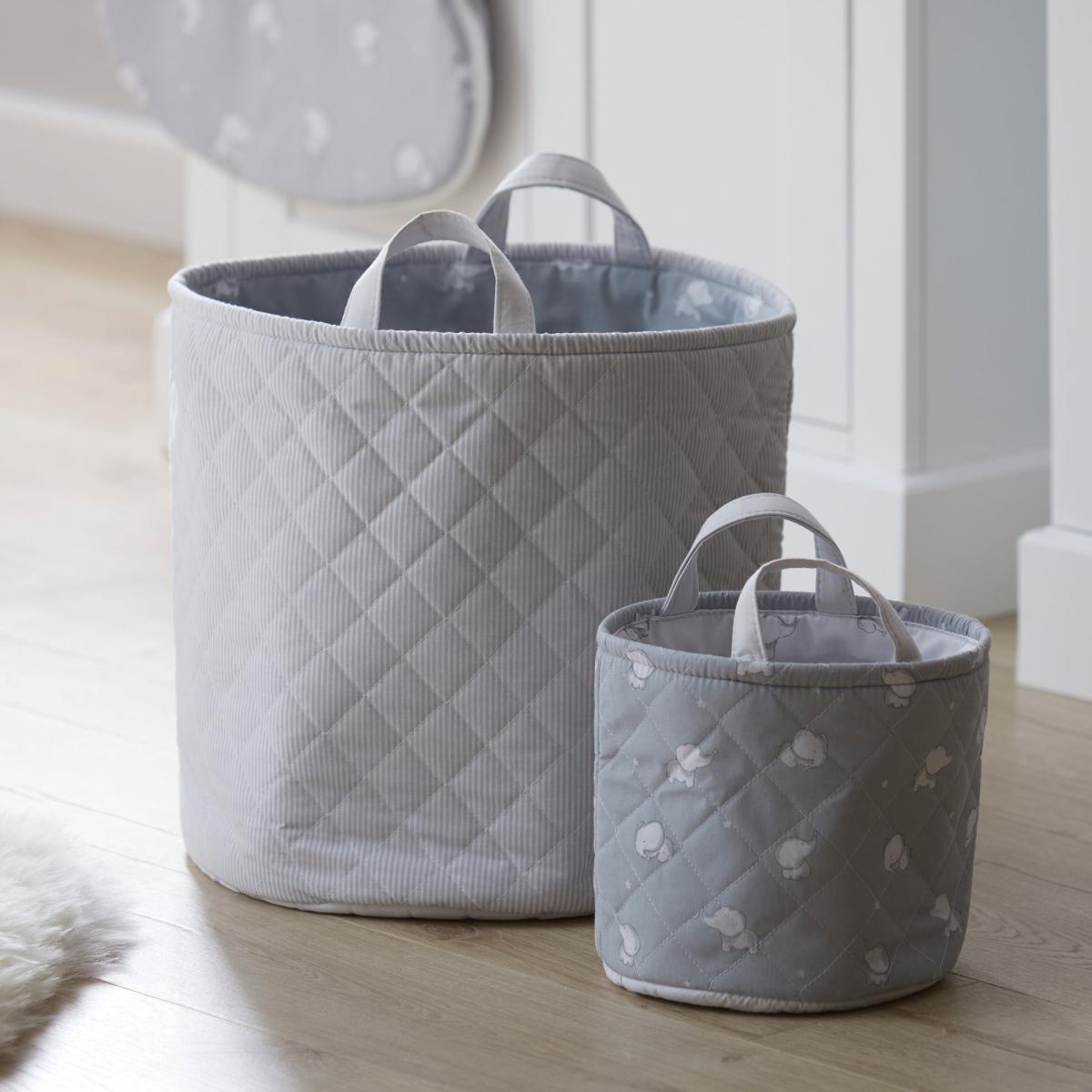 This pack of two storage bags from the Tiny But Mighty range are printed with two different designs of the elephant pattern in a soft grey colourway. Complete with handles, these round storage bags also come as two different sizes and are beautifully quilted.