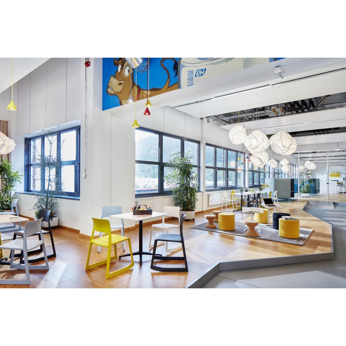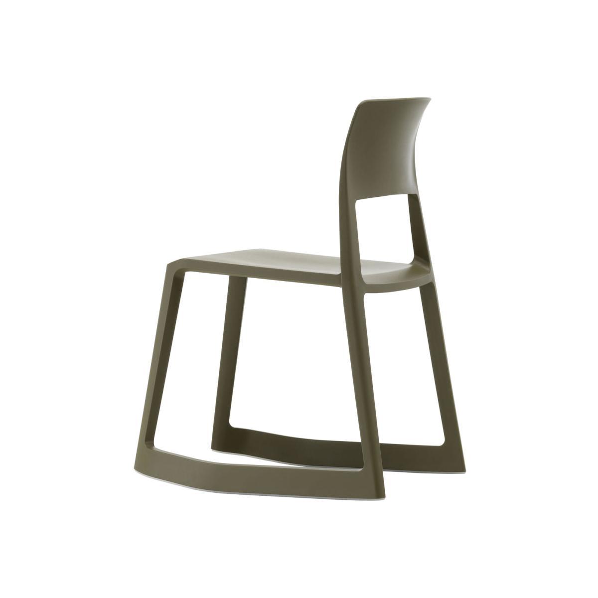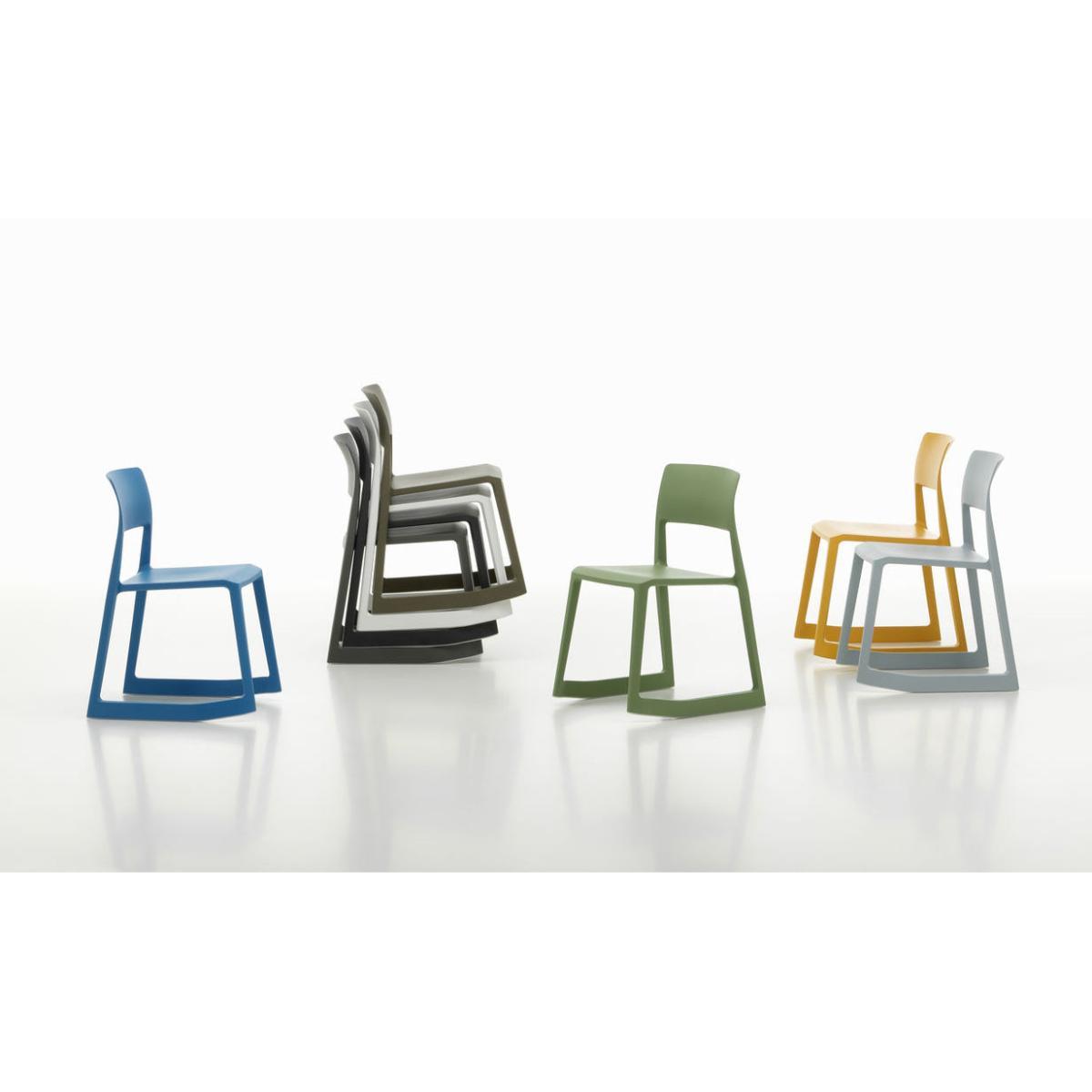 A revolutionary chair, for an entirely new seating position… Tip Ton defines a new type of chair: a forward tilting seat that allows for an ultra-ergonomic sitting position. In 2008, British design duo Edward Barber and Jay Osgerby were commissioned to develop a furnishing concept for the Royal Society of Arts Academy in London. They realised that no existing chair is suitable for learning in the 21st century: almost all the seats intended for learning were based on outdated teaching lines - on a transmission of knowledge to static students, supposed to learn while remaining seated, without moving. Barber and Osgerby then drew up a list of criteria that a modern chair intended for young students must meet: indestructible, light, easy to manufacture, quiet, stackable, colourful and fully recyclable. And it has to allow movement. These complex requirements demand a revolutionary seat - for an entirely new sitting position. Sitting still is toxic to the whole body, including the brain. Modern research on "dynamic sitting" is categorical: a forward-leaning sitting position helps prevent physical problems and promotes blood circulation - and thus the faculty of concentration. Vitra's interest in the Barber and Osgerby project marked the start of an intensive design process spanning more than two years. Countless technical drawings and over 30 prototypes were made in total. Due to its intended use in educational institutions, the Tip Ton chair has been subjected to many rigorous tests to meet the requirements in different countries. The tool built to develop the Tip Ton mould, made of polypropylene by the injection process, weighs more than 20 tonnes - the seat barely 4. 5 kg! The Tip Ton chair allows two positions: in addition to the classic upright position that’s perfect for rest, it tilts forward in a controlled manner thanks to the runners inclined by approximately 9°. Tip Ton lets you vary the positions, straighten the pelvis and spine, improve blood circulation in the abdominal and back muscles and stimulate oxygenation of the brain and concentration. The user can stay in this inclined position for a long time. Made entirely of polypropylene, this one-piece chair without mechanical components lacks the sophisticated technology of an office chair. Tip Ton isn’t just for school use. The dynamic double sitting position is so natural that Tip Ton can also be used as a universal chair in office environments and private accommodation. Tip Ton brings the ergonomic qualities formerly reserved for office chairs into a new environment. 100% recyclable, Tip Ton can be stacked and used indoors and out.