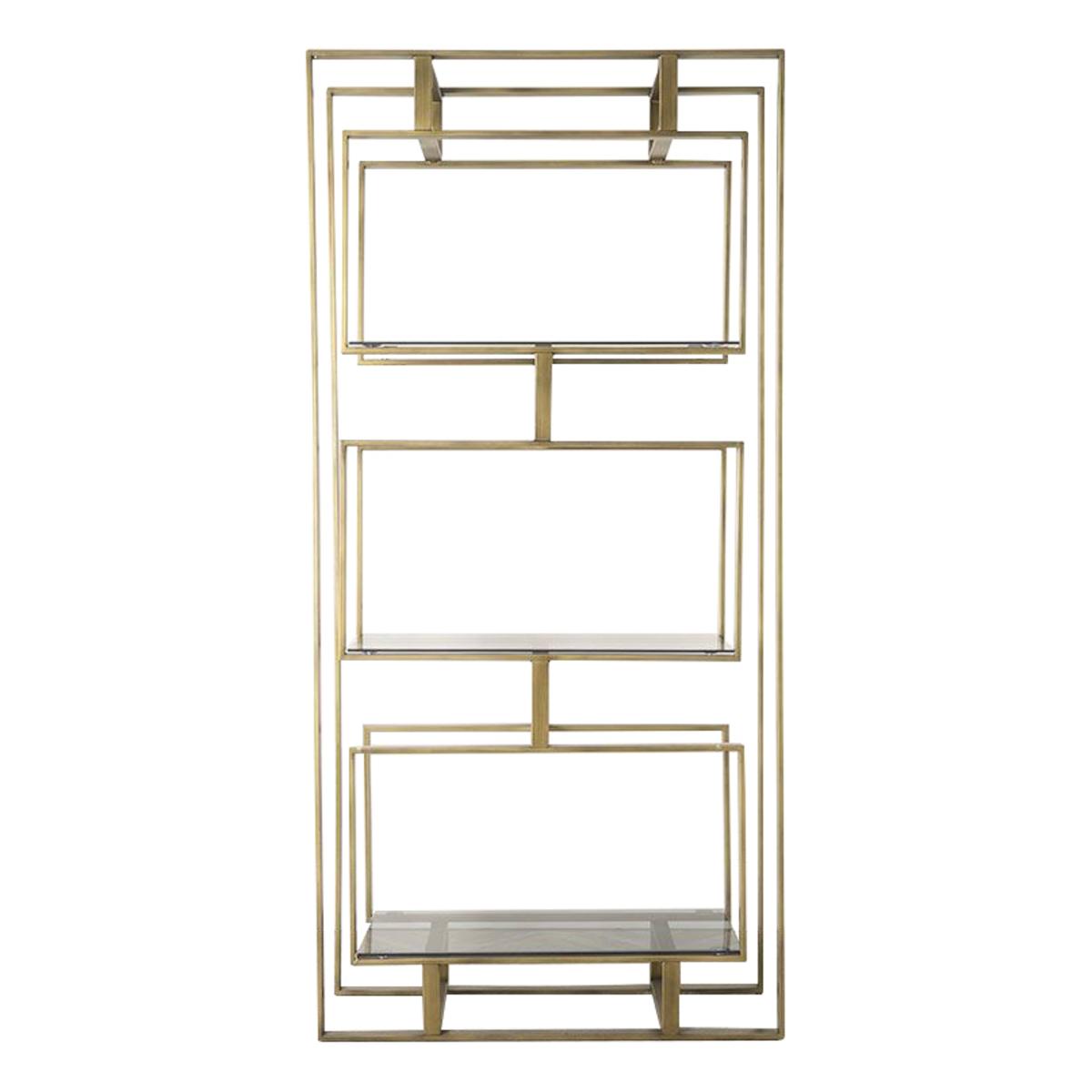 * Geometric design frame* Bronzed finish* Smoked glass shelves* Frame is made from Iron* Unusual contemporary piece that will suit a wide range of interirors Make a statement with the stunning Tipton Open Display Unit. The geometric design of the frame, with its bronze finish, is paired with smoked glass shelves, to create an unusual contemporary piece, which looks great on its own or with other pieces from the range.