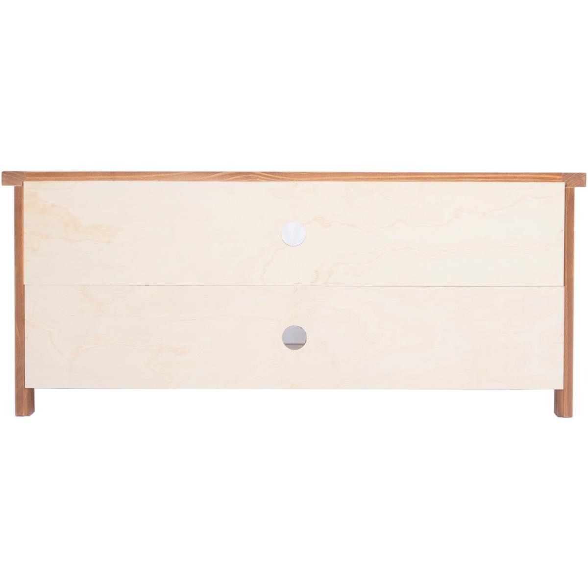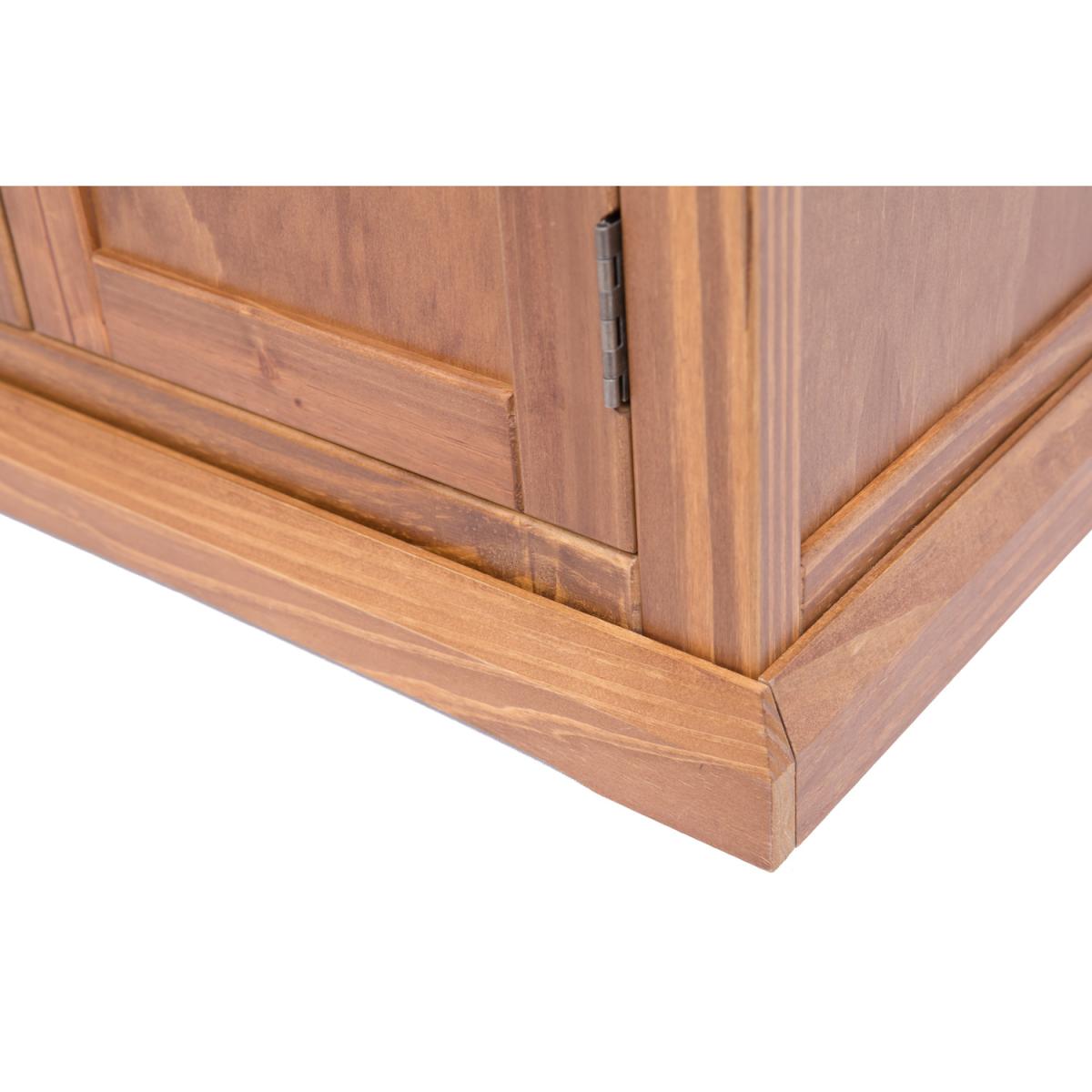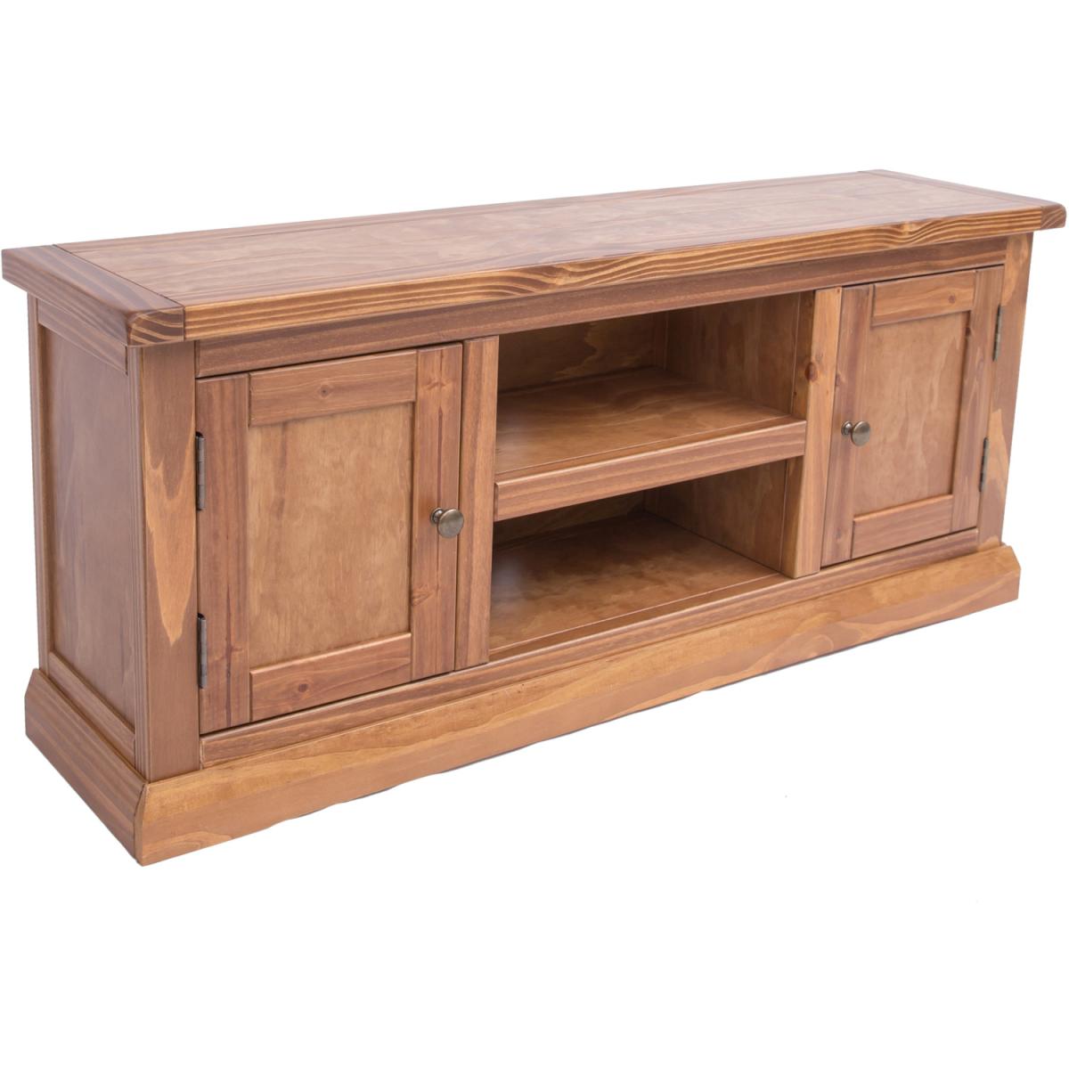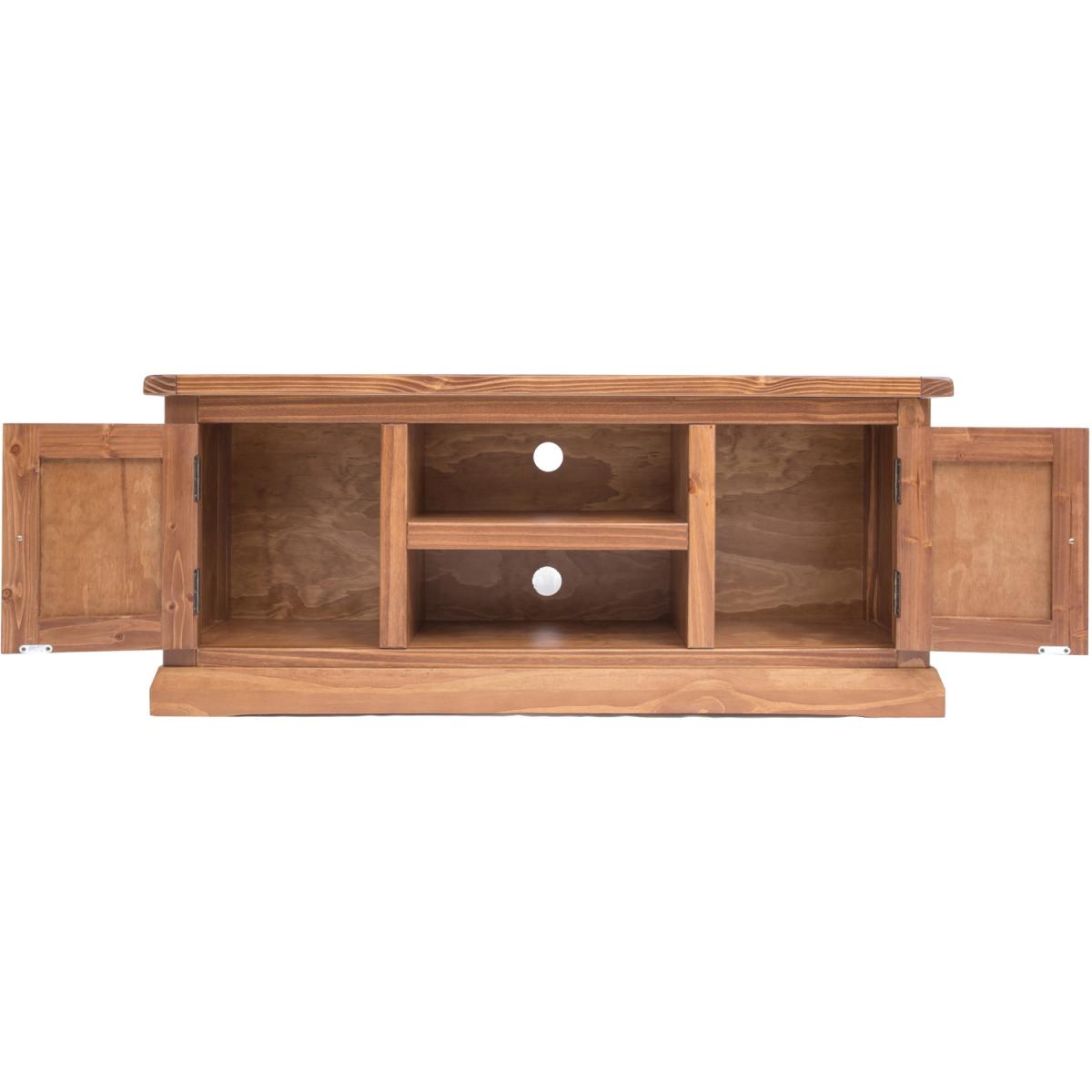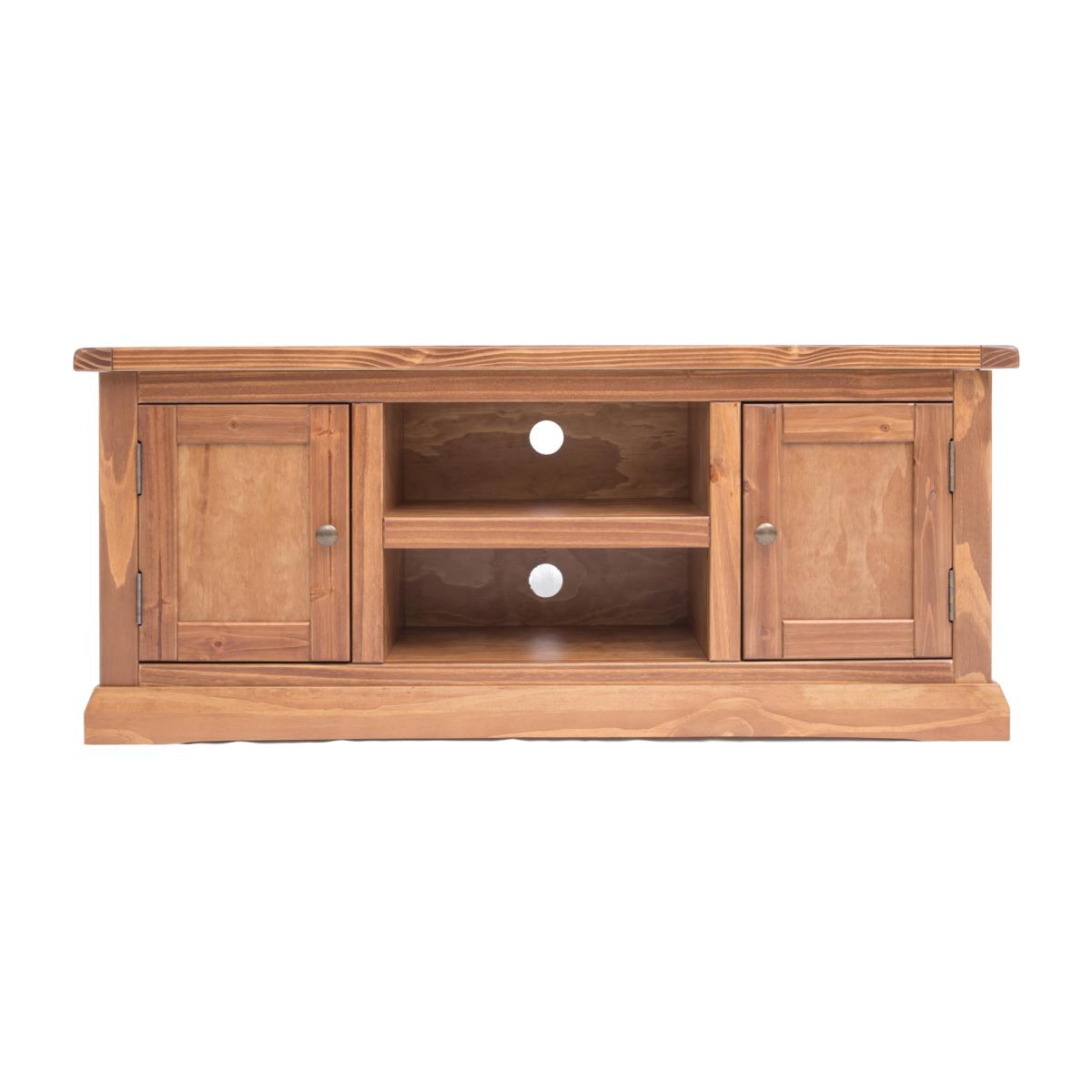 Our Tirolo collection has a simple but pleasing design and is produced by our skilled craftsmen to the highest standards using responsibly sourced solid wood and veneers. All items are made using a combination of solid pine wood and veneers and are carefully hand-finished in a light brown colour using a high-quality eco-friendly water-based lacquer. This large TV unit has a mixture of storage and open space to house all your TV-related items together. There is plenty of space on top for your TV, in the centre below is an open space divided by a shelf creating two storage areas, easy access for wiring is available through the cable holes on the back of the unit.