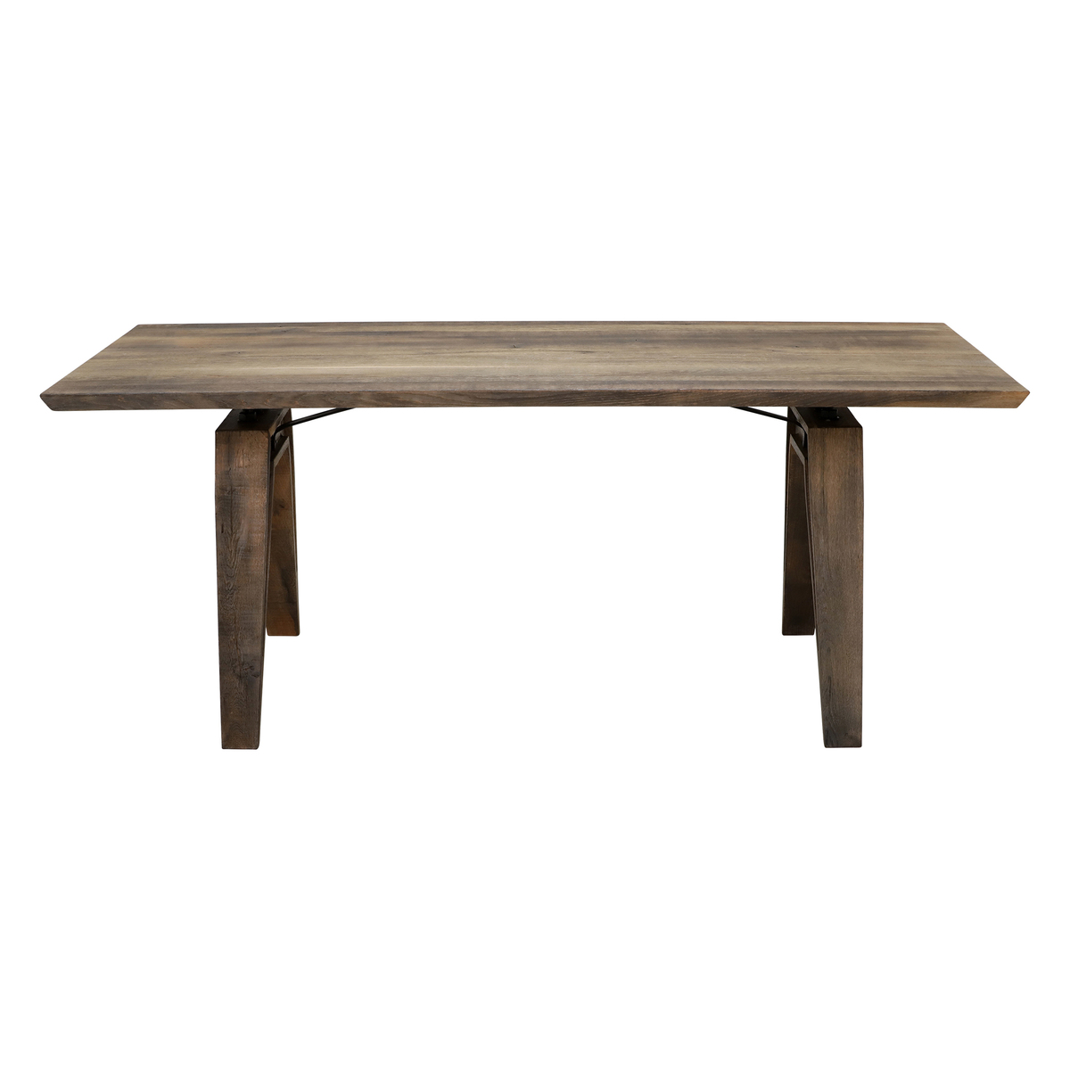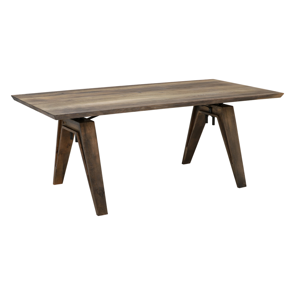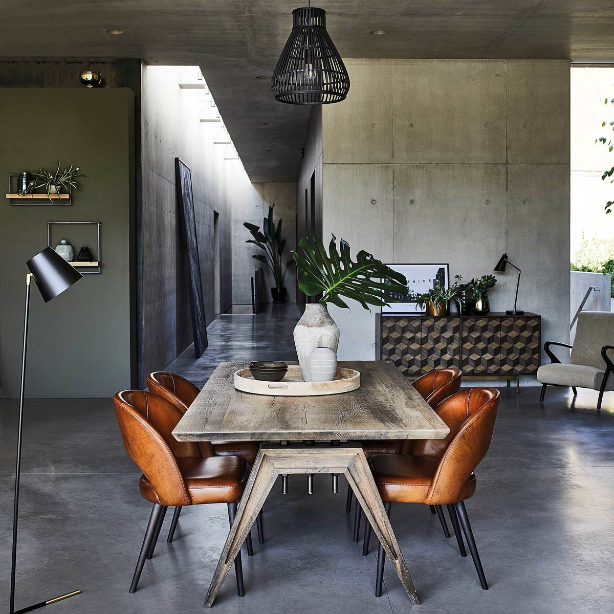 With its striking design details and unique shape, the Tiros dining table will make any mealtime a stylish occasion. Full of character, its wood is heavily distressed in a rustical oak finish that complements the overall industrial feel. Sharp, angular legs lend a futuristic look to the table, with metal bolts giving a touch of something different. Featuring beautiful carved grooves, corniced edges, and natural splits and markings, Tiros is sure to attract the eye of each and every dinner guest. Whether dressed up with elegant velvet chairs or pared down with a wooden bench, this table makes a fabulous first impression.